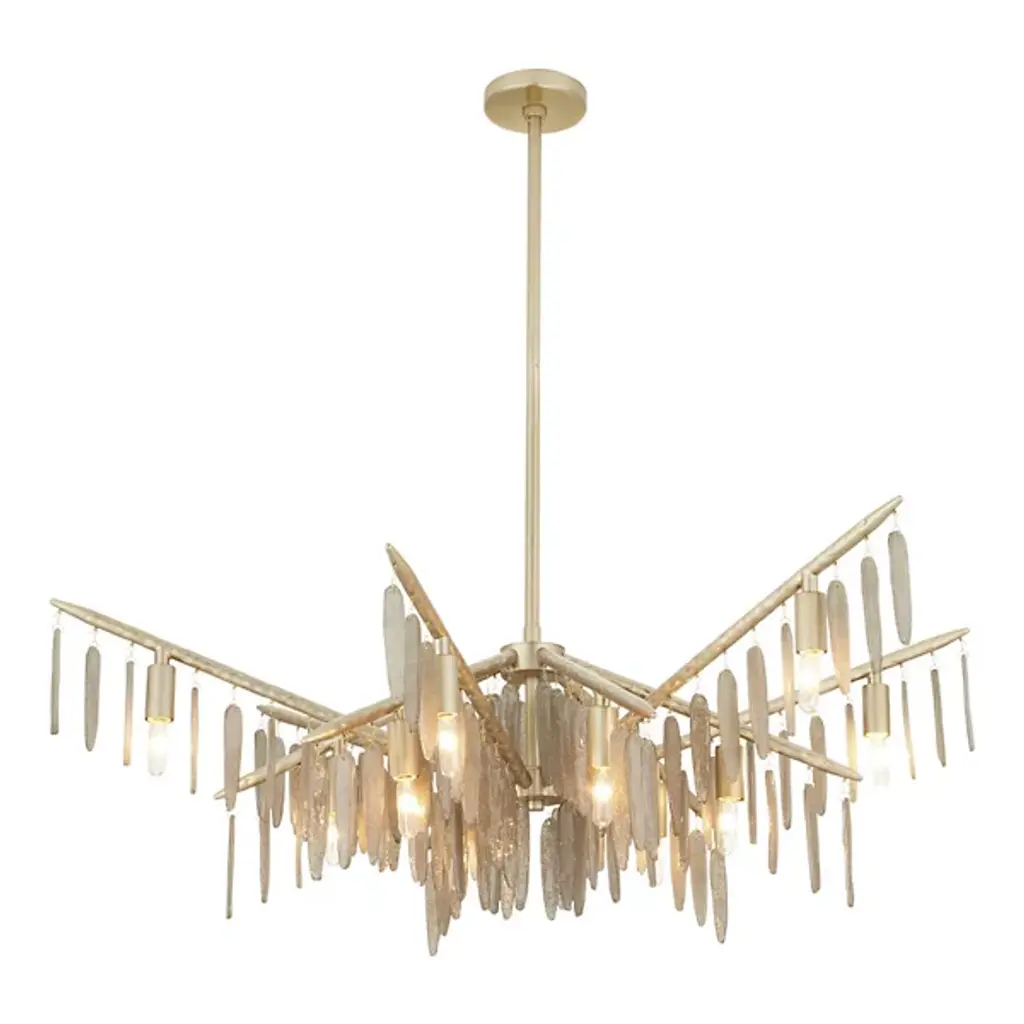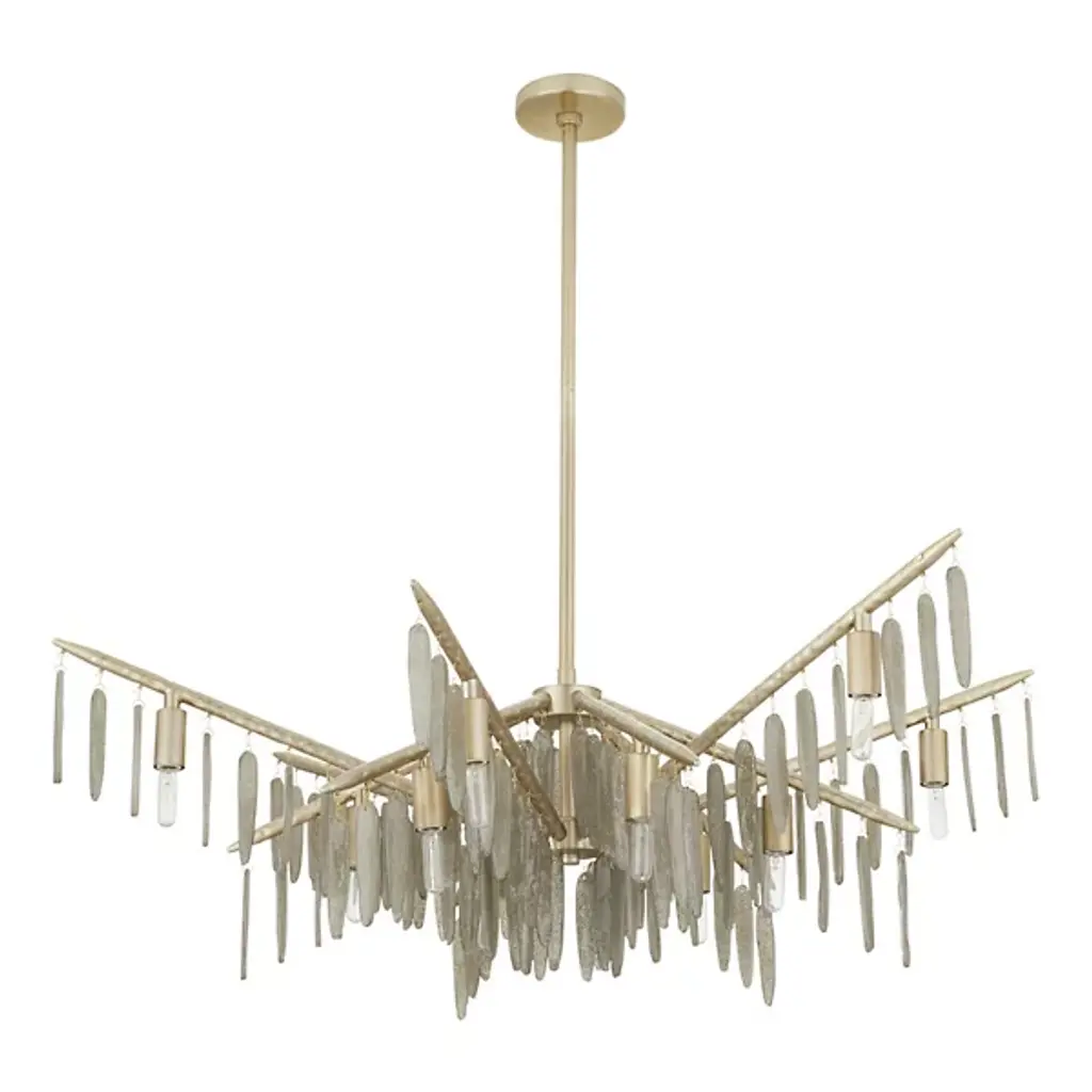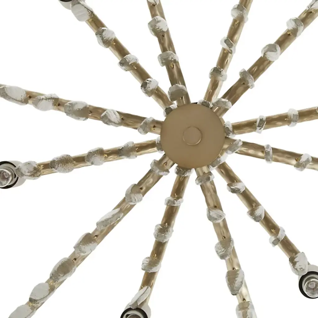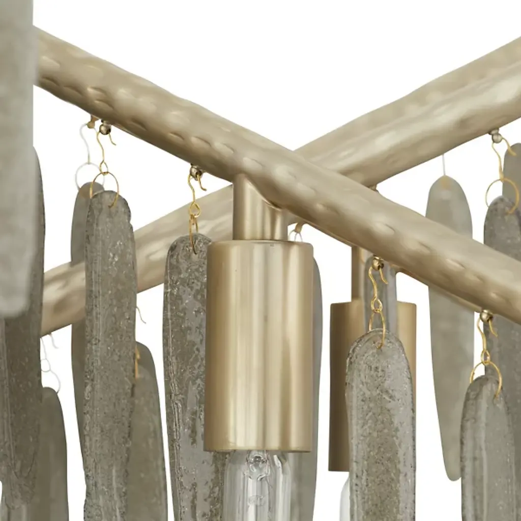 The Gia Chandelier from Arteriors brings winter's magic indoors with glass droplets that mimic frozen icicles clinging to branches. This dimmable showpiece suspends twelve light sources among textured metalwork that recalls tree bark patterns. The hammered iron branches stretch outward, each carrying its crystalline cargo with natural grace. When lit, the seedy glass elements sparkle like morning frost, but even unlit, this nature-inspired piece demands appreciation. Approved for covered outdoor spaces, it's particularly magical in sunrooms or above dining tables.