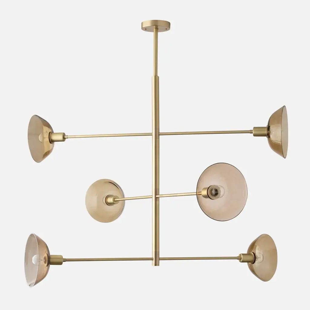 Shade Included, Bulb Sold Separately An iconic, sculptural fixture with a uniquely mid-century feel, the Gillespie Chandelier evokes a modern style with its bold cylindrical rotating hub while casting an elegant, soft glow. The perfect statement piece for any living room, kitchen, or dining area, this sleek light source rotates at each tier, allowing for seamless transitions in form while set screws work to lock the light fixture in place. Vaulted and extended length options allow for expanded use. Available with a clear or bronze glass shade. A Schoolhouse Original. Read our guides on how to hang pendants and chandeliers and how to layer different types of lighting. Sale items and promotional purchases with a discount over 50% are final sale