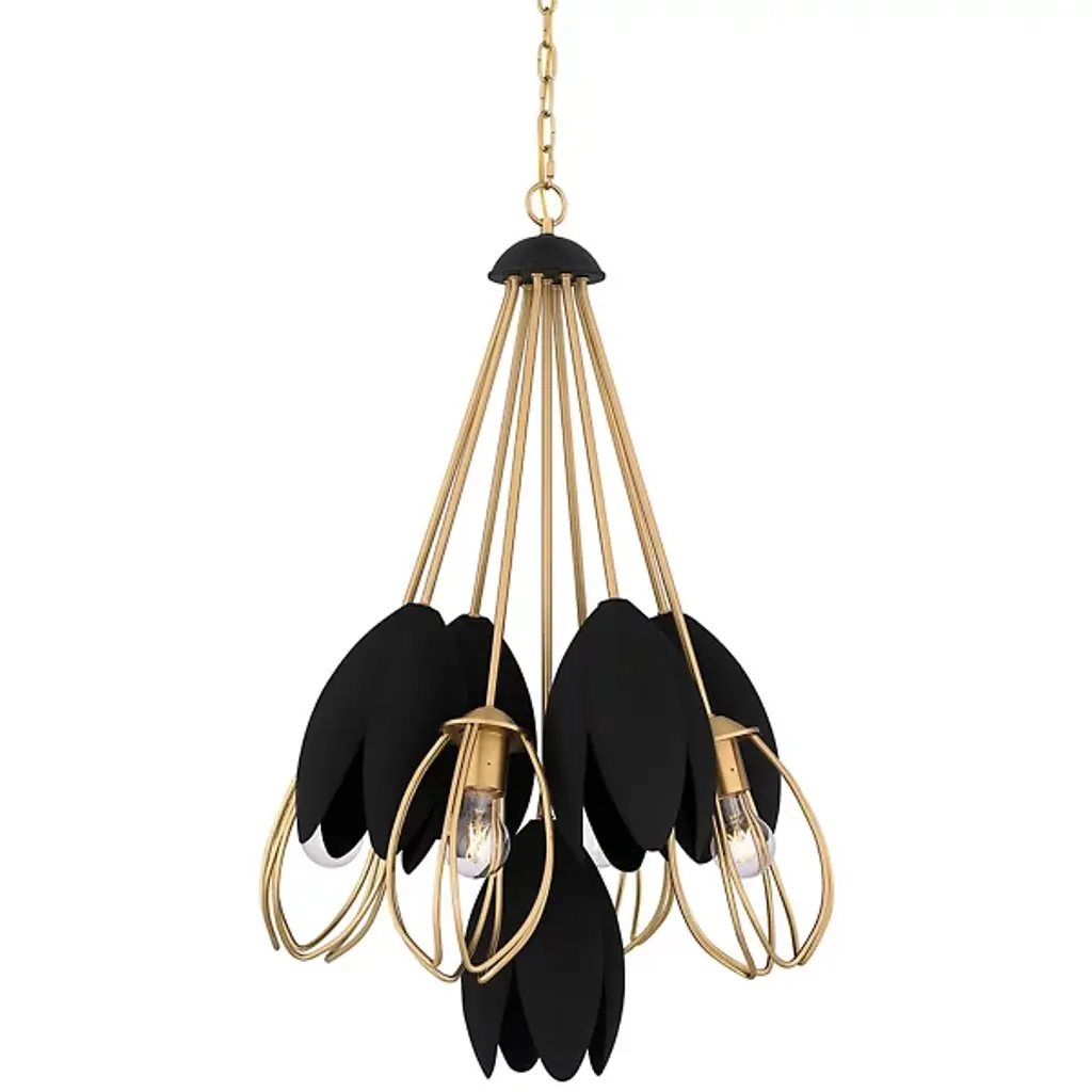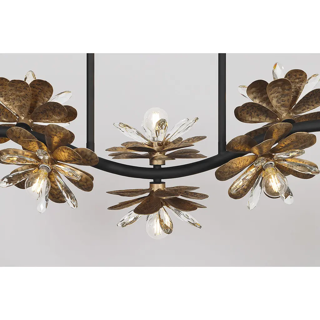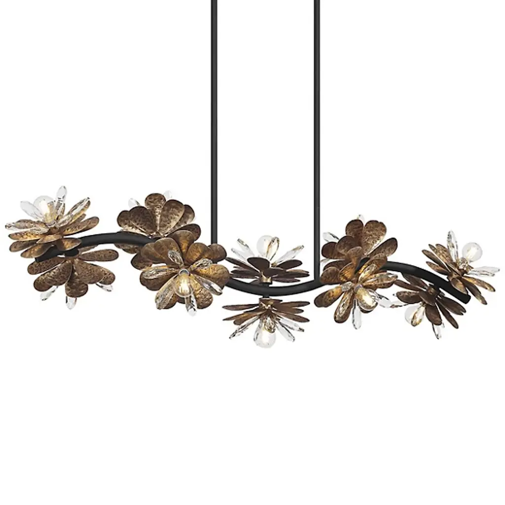 Let the beautiful Savoy House Giselle 10-light linear chandelier blossom in your home Its undulating structure is festooned with flowers and finished in Delphine, a beautiful mix of gold and black tones. Petals of faceted crystal add another dimension of style.