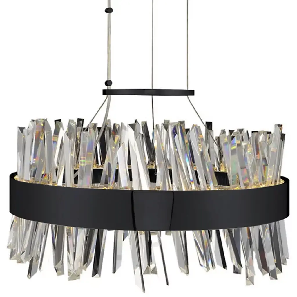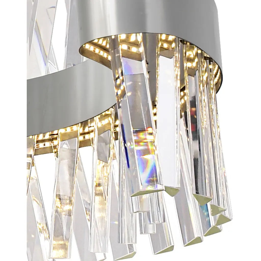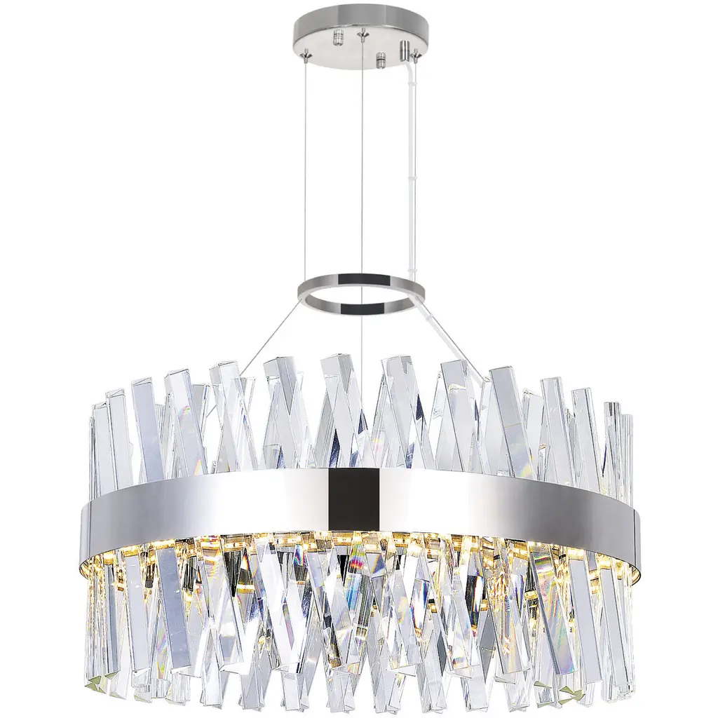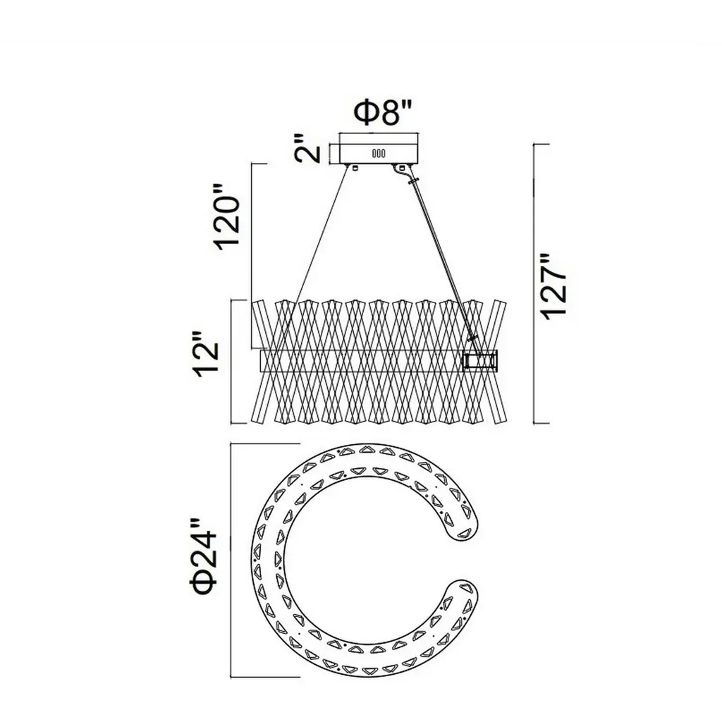 Bring a unique visual interest into your space through the modern sparkle of this Glace 24 inch LED Chandelier. A circular pendant measuring 24 inches in diameter displays a metal band circled by clear crystal prisms with integrated LED. With this light fixture's refreshing presence, expect your space to be illuminated by ample light and dynamic energy. This chandelier has a height that can be extended up to 127 inches.