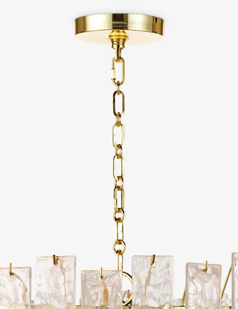 Trying to create glamour in your space? Look up. The Glacier chandelier features water glass panels in an opulent arrangement that catches the light and demands attention. The translucent glass dazzles overhead, pouring a generous pool of diffused light into the room.