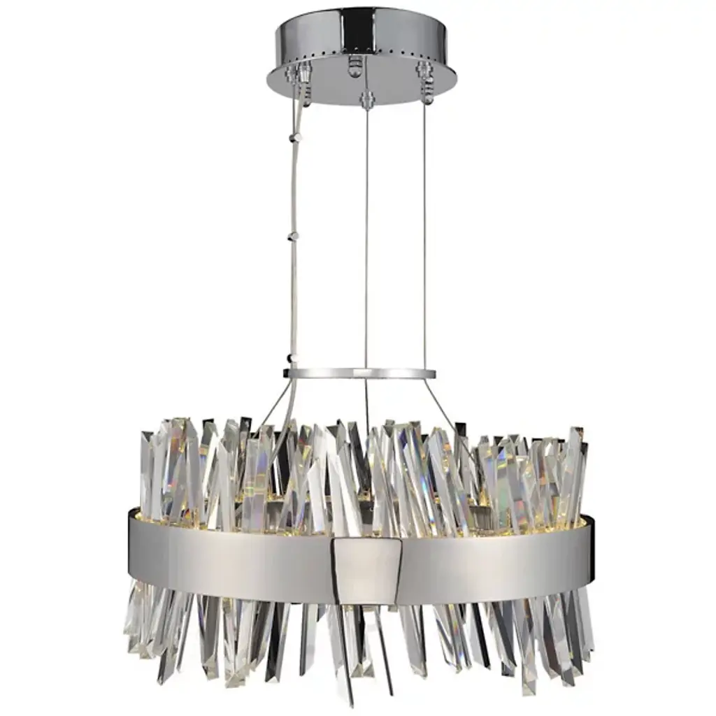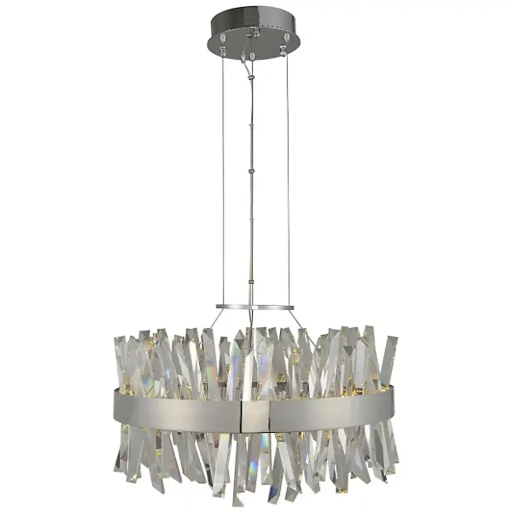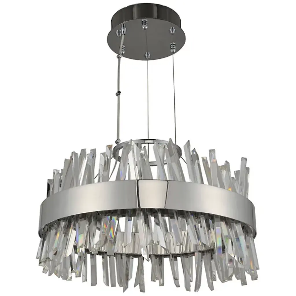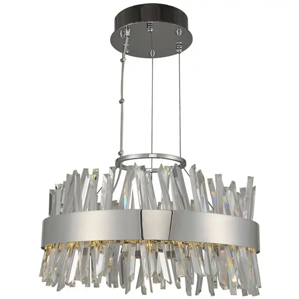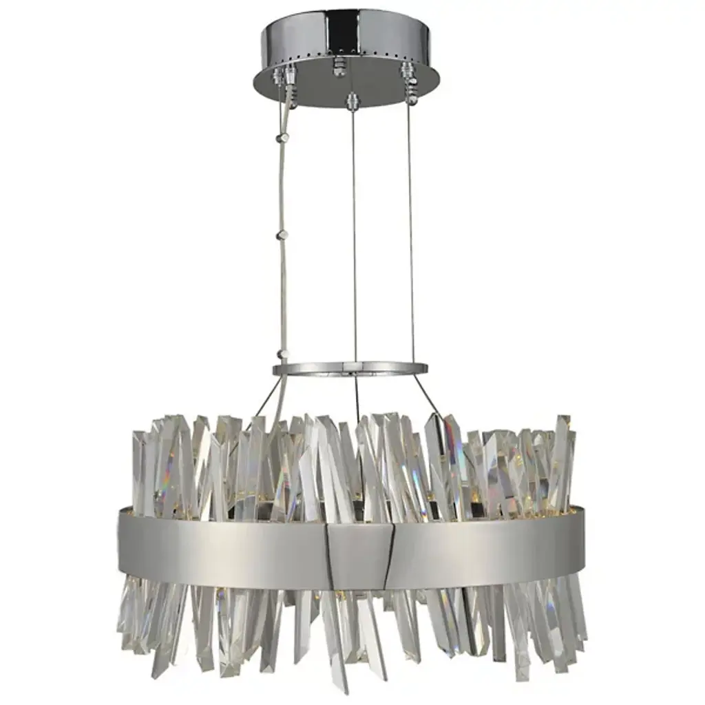 The Allegri by Kalco Lighting Glacier LED Chandelier has a refreshing presence, with clear crystal spears complemented with a thick metallic band. Powered with modern LED lighting, this piece lights the space with dynamic energy efficiency, the illumination refracting and reflecting through the translucent crystals.
