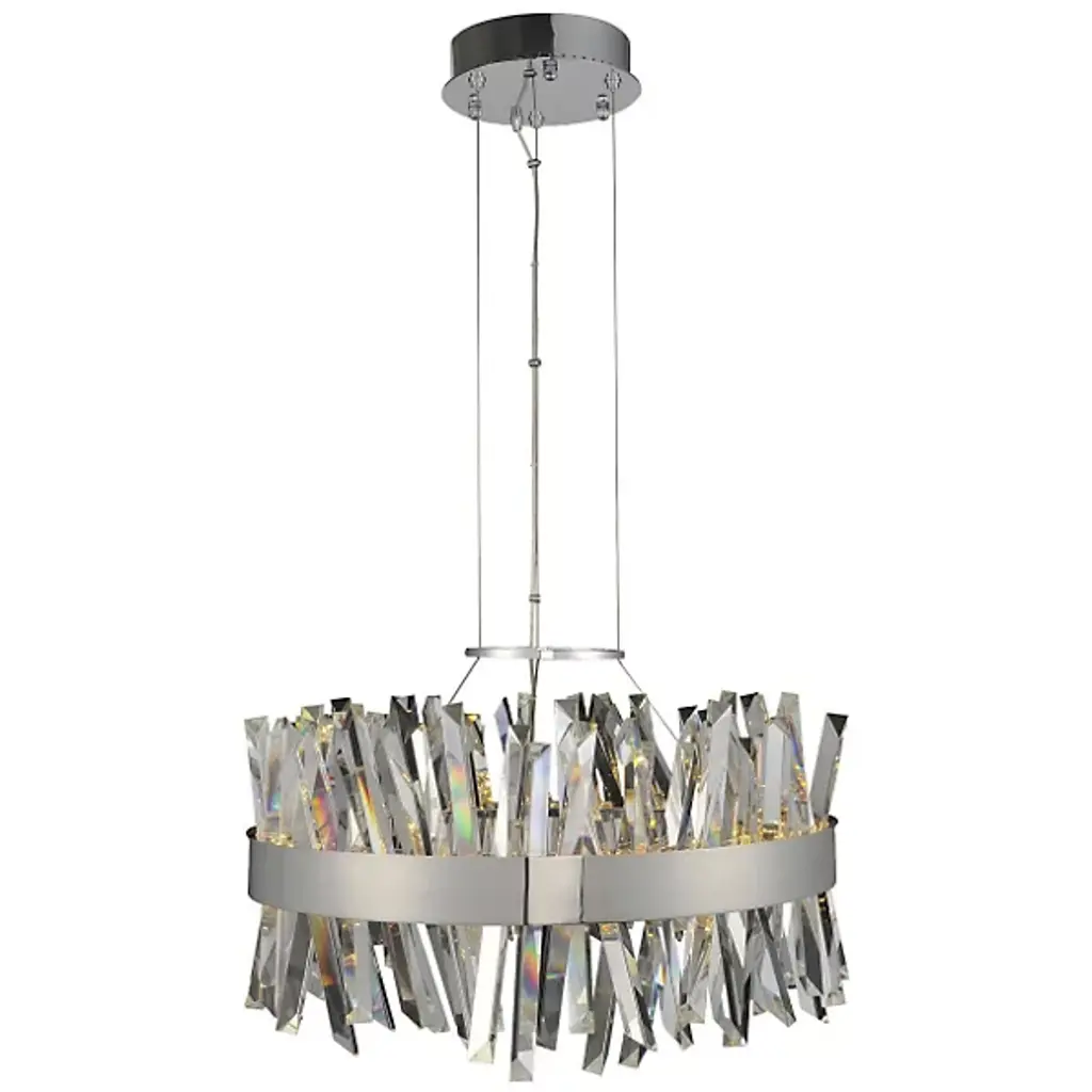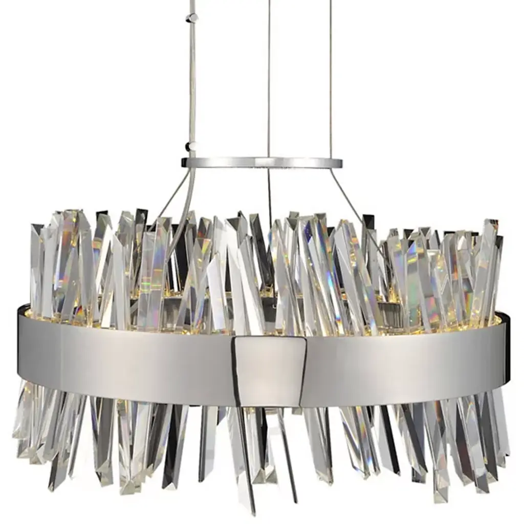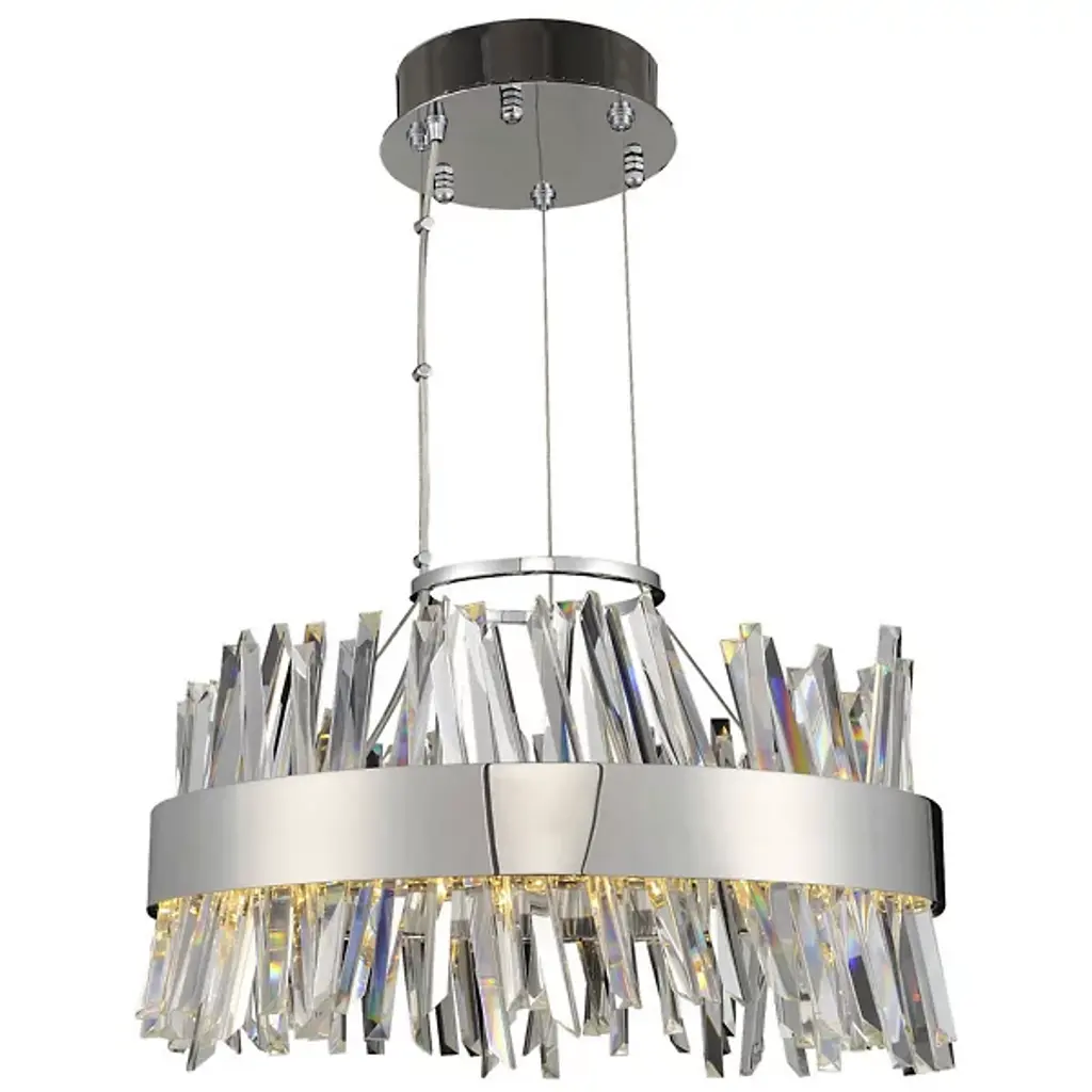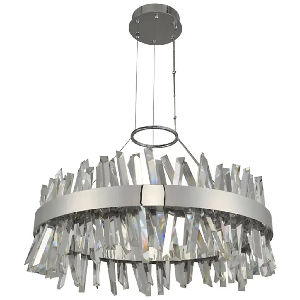 The Allegri by Kalco Lighting Glacier LED Chandelier has a refreshing presence, with clear crystal spears complemented with a thick metallic band. Powered with modern LED lighting, this piece lights the space with dynamic energy efficiency, the illumination refracting and reflecting through the translucent crystals.
