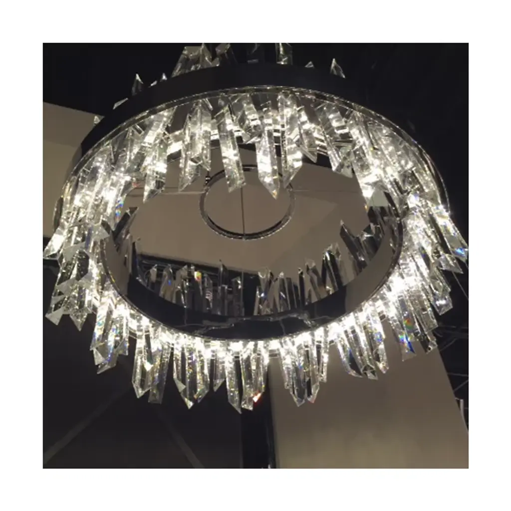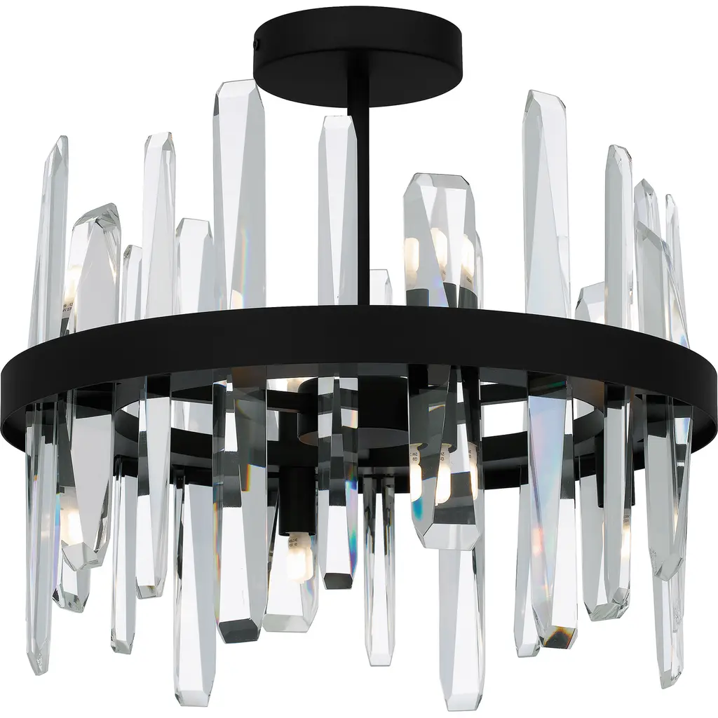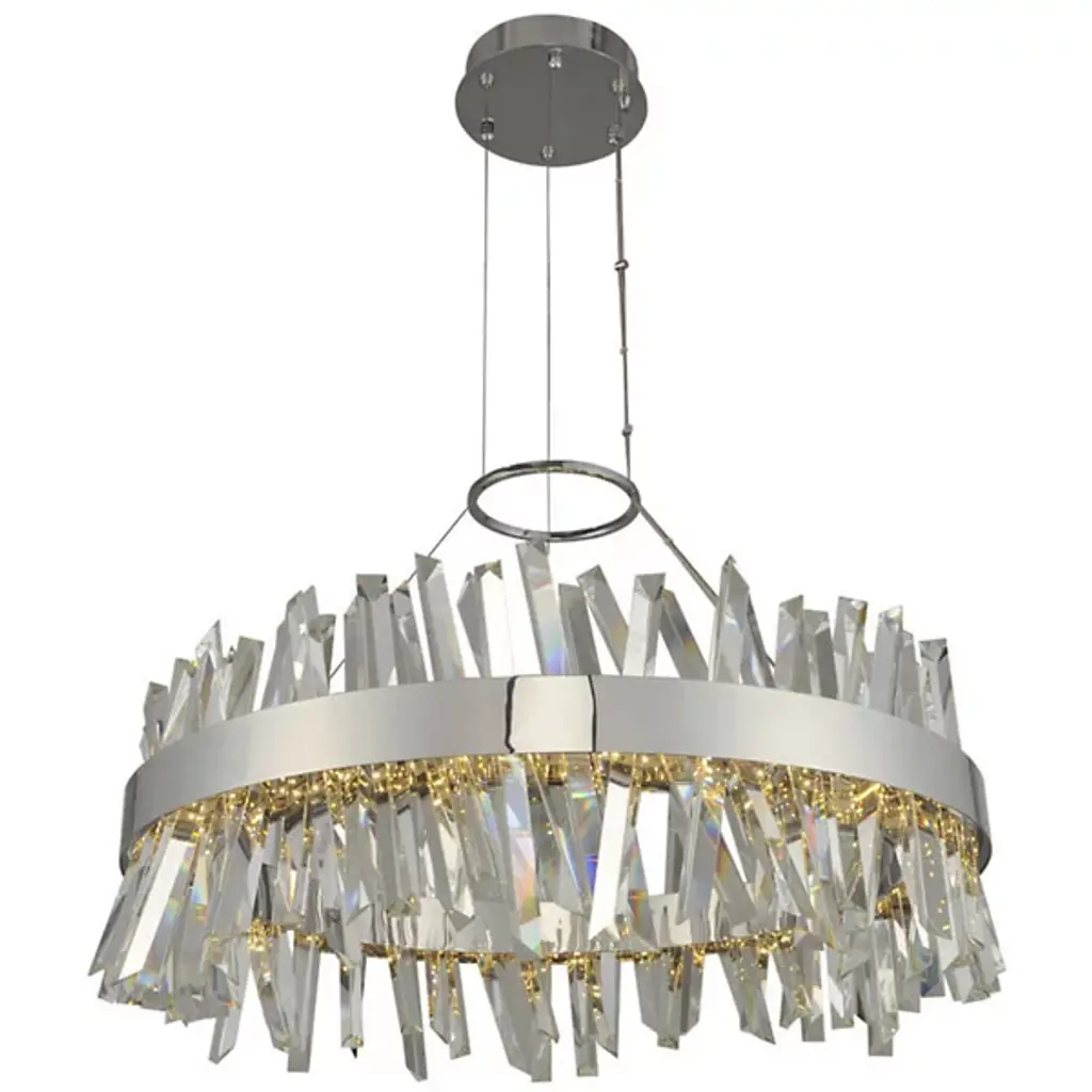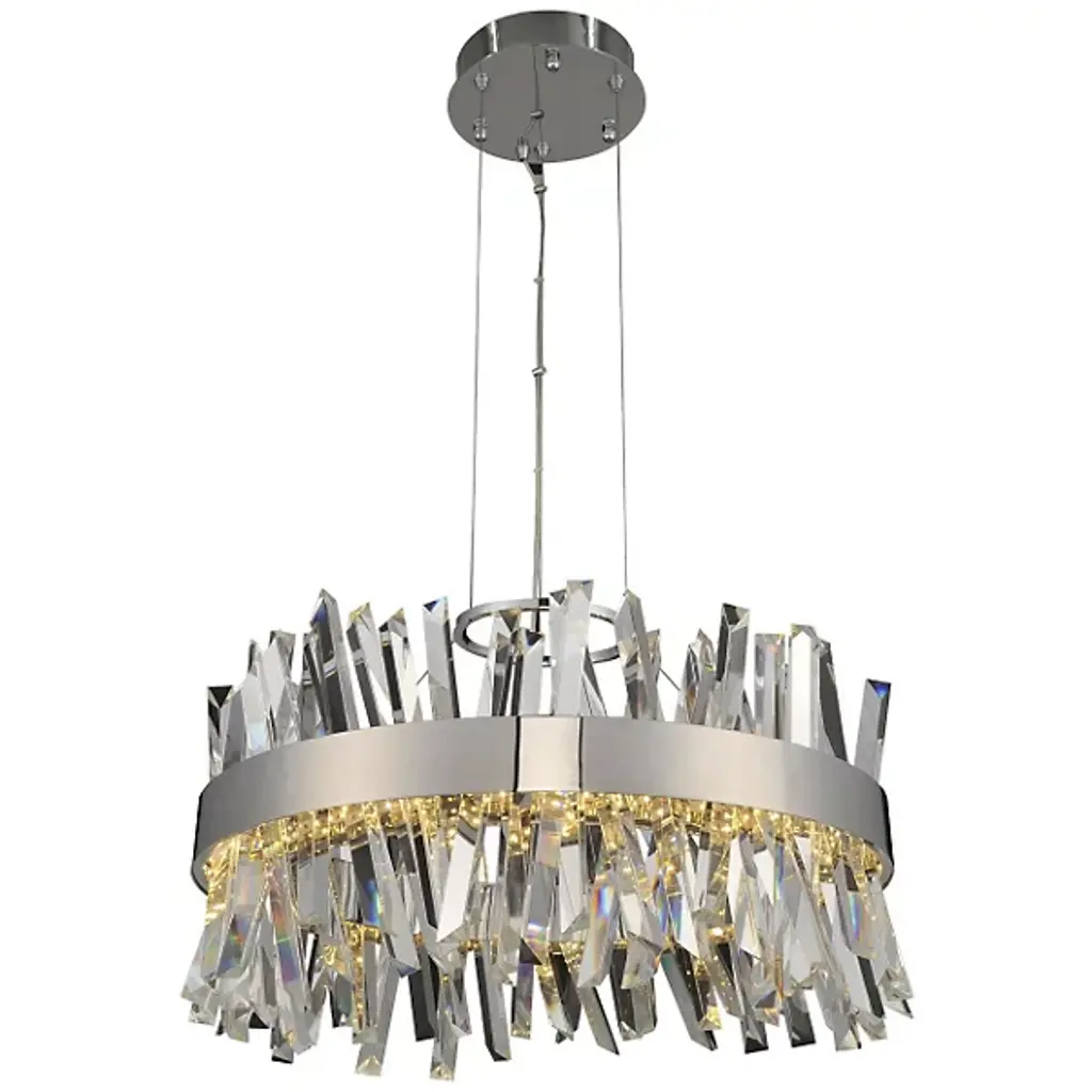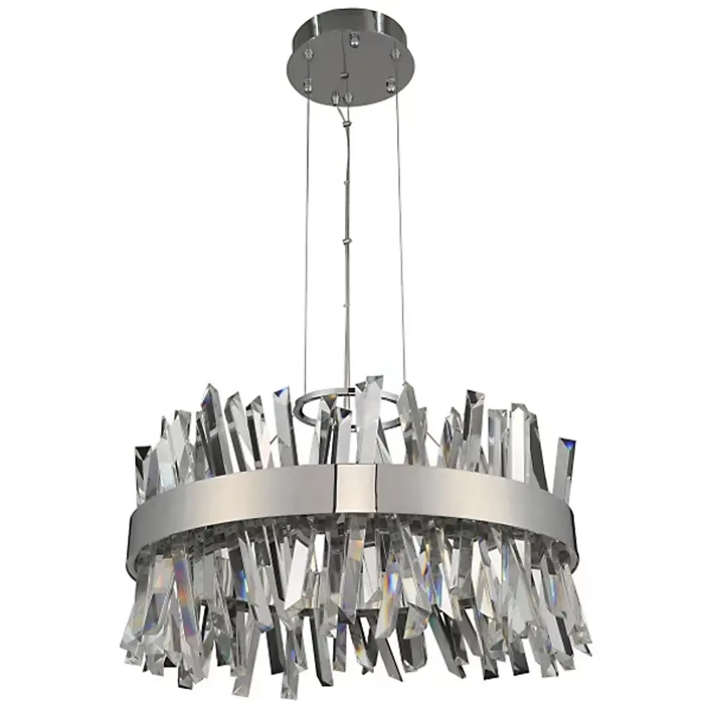The Allegri by Kalco Lighting Glacier LED Chandelier has a refreshing presence, with clear crystal spears complemented with a thick metallic band. Powered with modern LED lighting, this piece lights the space with dynamic energy efficiency, the illumination refracting and reflecting through the translucent crystals.