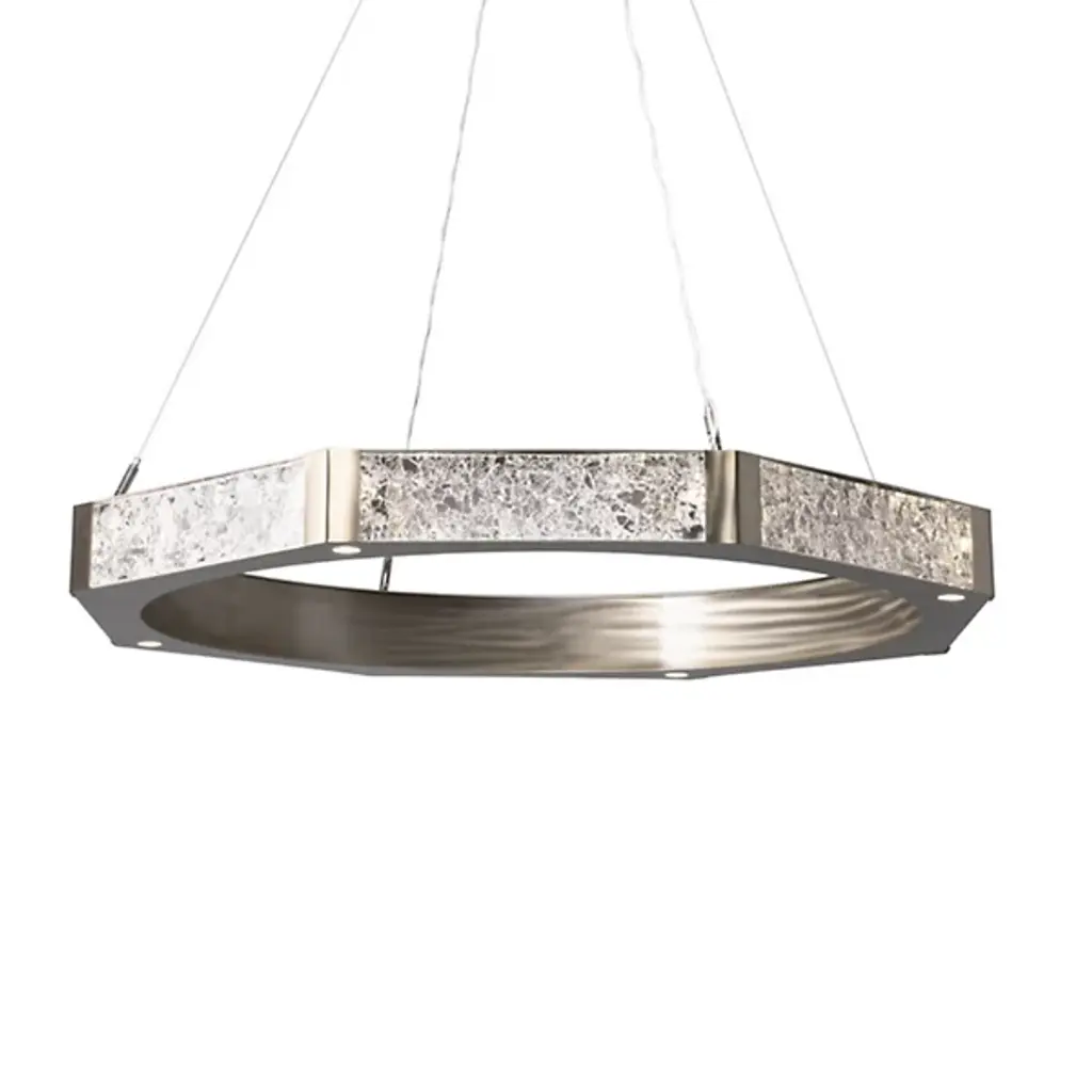 Reduce, reuse, recycle with the Glacier LED Ring Chandelier from Hammerton Studio. A recent design from the mind of Levi Wilson, this contemporary flat ring marries polished metal framing with artisan glass left over from Hammerton’s glassblowing workshops. This gives an individual presence to each fixture, contrasting the eight flat panels on the outside with a smooth round interior. Power-efficient LEDs are set into the ring’s base, shining downward with a brightness that belies their size.