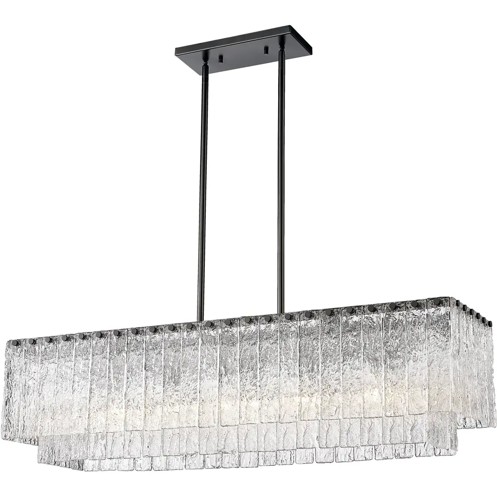 Build an artistic version of frosty ice with this five-light island light beautifully balancing delicacy with rugged industrial personality. The Glacier island light offers a decadent look of individual textured glass panels that emulate melting ice, an extraordinary effect with dramatic impact in a kitchen or bar space. Matte black finish steel creates a bold frame and canopy, adding a contrast in both style and finish, embellishing the optical delight accomplished when the fixture is illuminated.