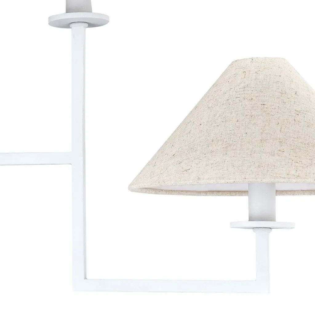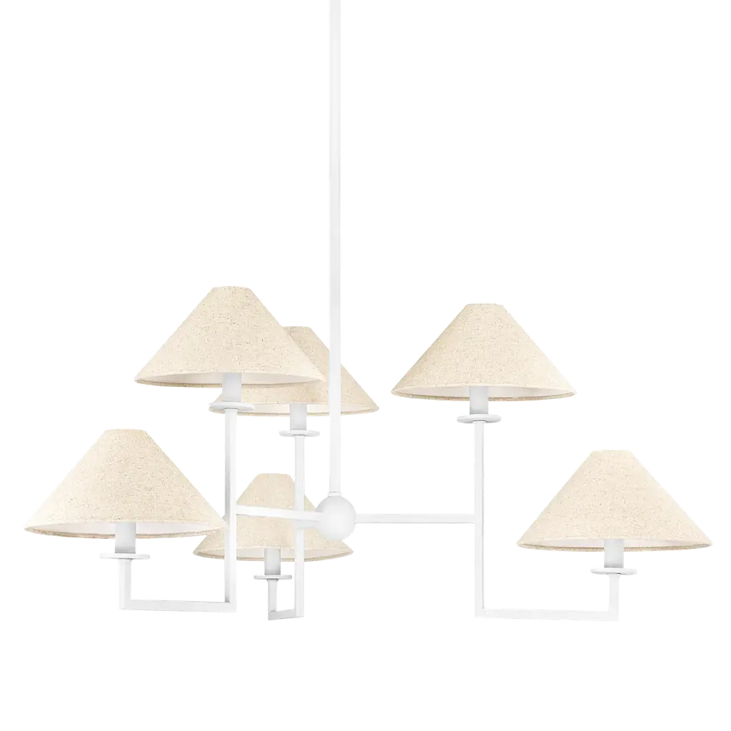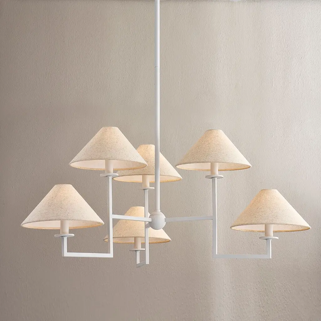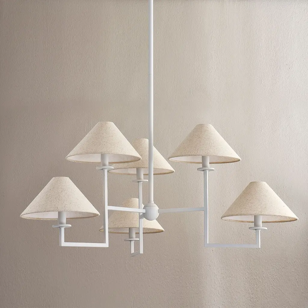 This two-tier chandelier's six precisely angled arms and plasterlike white finish make it a bright spot in a room even when turned off. The linen shades provide a subtle but welcome tonal and textural contrast.