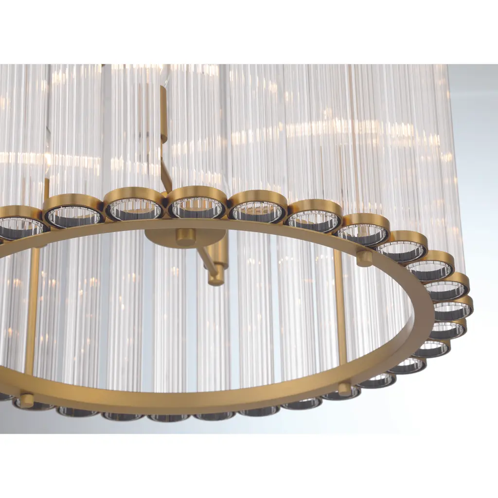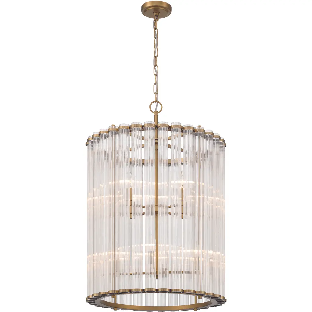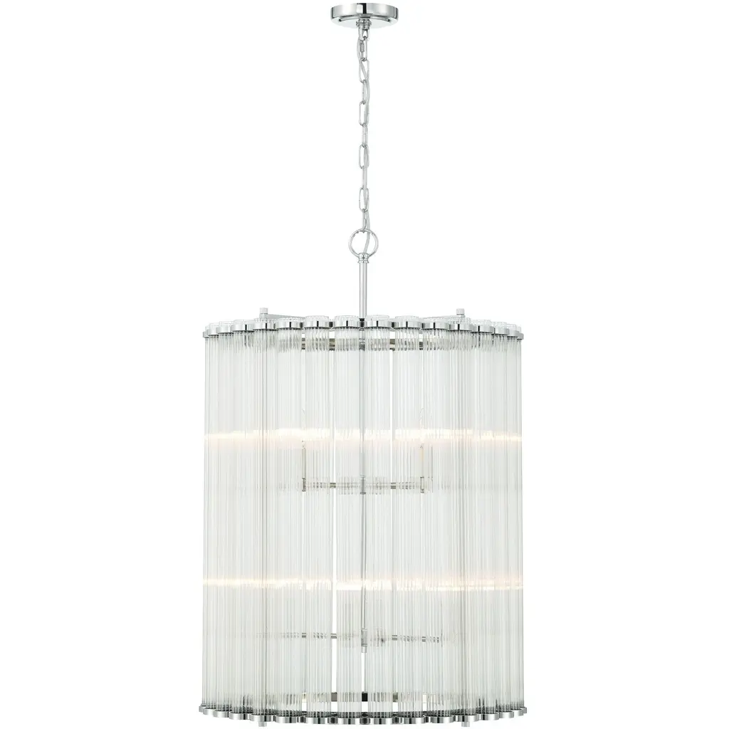 A regiment of ribbed cylinders, linked together at the top, encircle the central light sources to soften and diffuse, unveiling a stately, transitional allure that lends charm to living, entry and dining spaces.