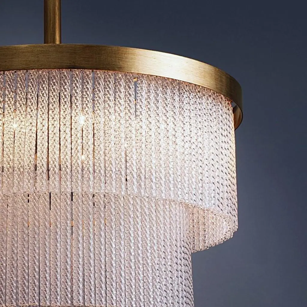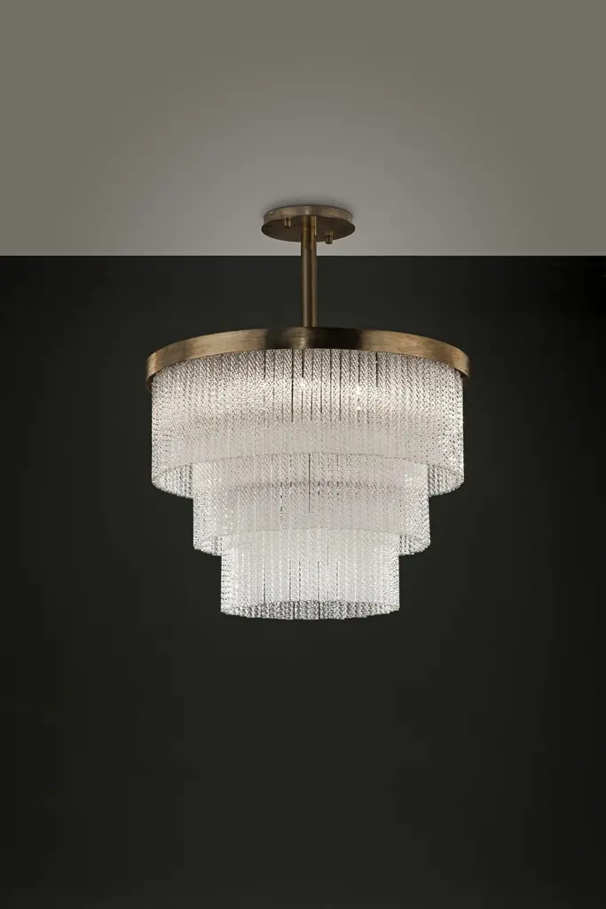 Glass Chandelier by AverDimensions: D 78 x H 45 cmMaterials: Glass, metal.Finishes: Gold Leaf, Silver Leaf, Warm Gold Leaf, Warm Silver Leaf, Warm Copper Leaf, Dark Gold Leaf, Dark Silver Leaf, Bronze Leaf, Antique Bronze, Antique Golden.Collection of Aver lamps made with handmade twisted glass tubes. In this version we have the classic layered pendant.Aver Design offers a possibility to really differentiate an interior project through decorative lighting. Our pieces are striking and timeless, they remain elegant regardless of the “trend” that in a short time will already be saturated and without personality.All our lamps can be wired according to each country. If sold to the USA it will be wired for the USA for instance.