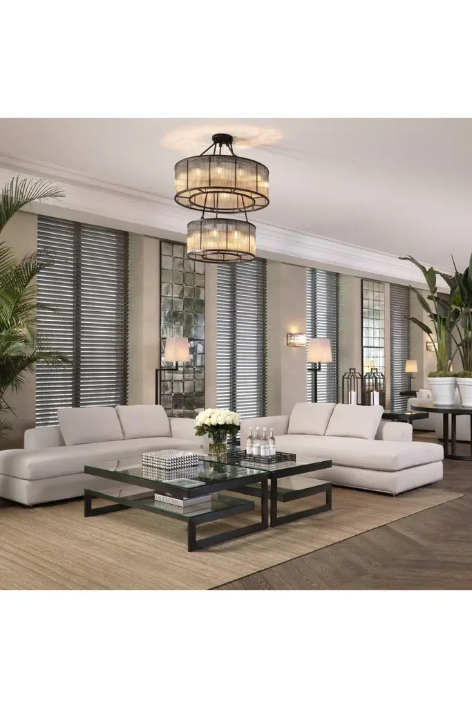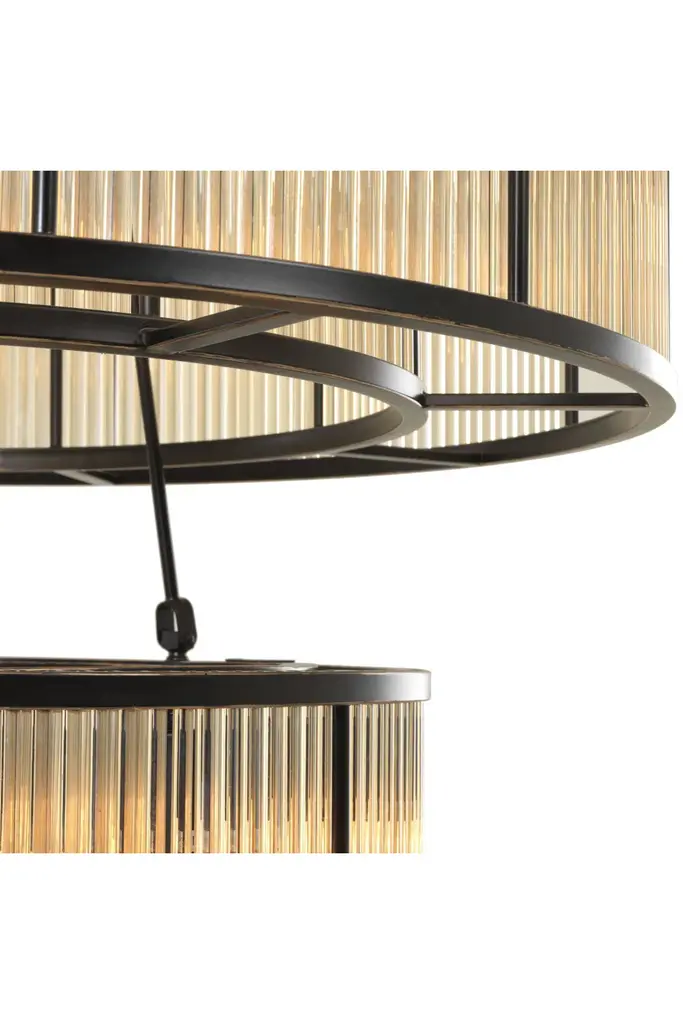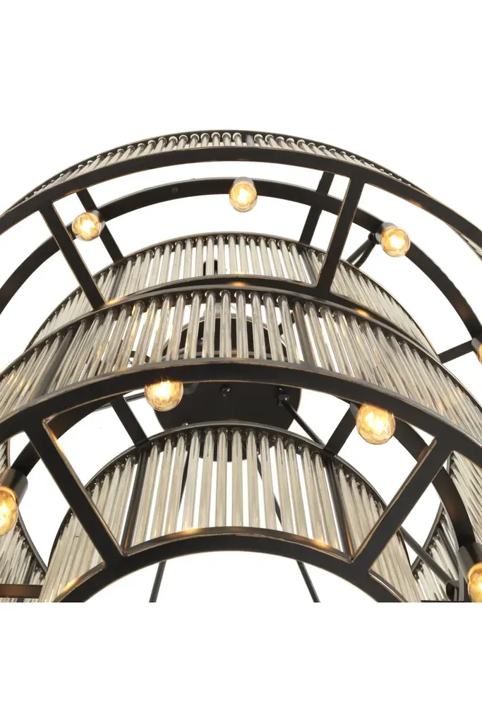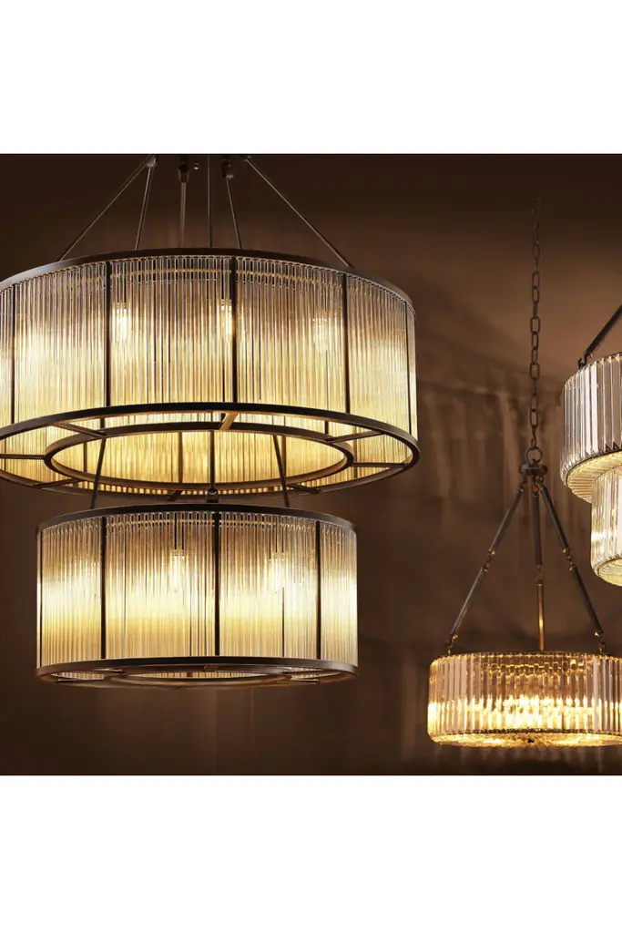 eaturing a pronounced 1920s appeal this enthralling Art Deco-inspired Bernardi Chandelier will enliven each space in a sparkling way. With two ascending tiers of sparkling glass shades, each shade is encased in drum-like dark bronze fittings for an elegant contrast. Fits any interior and brings a luxurious touch to each home.