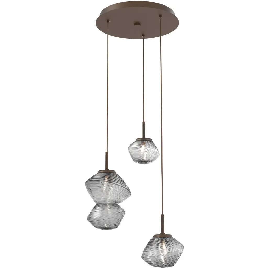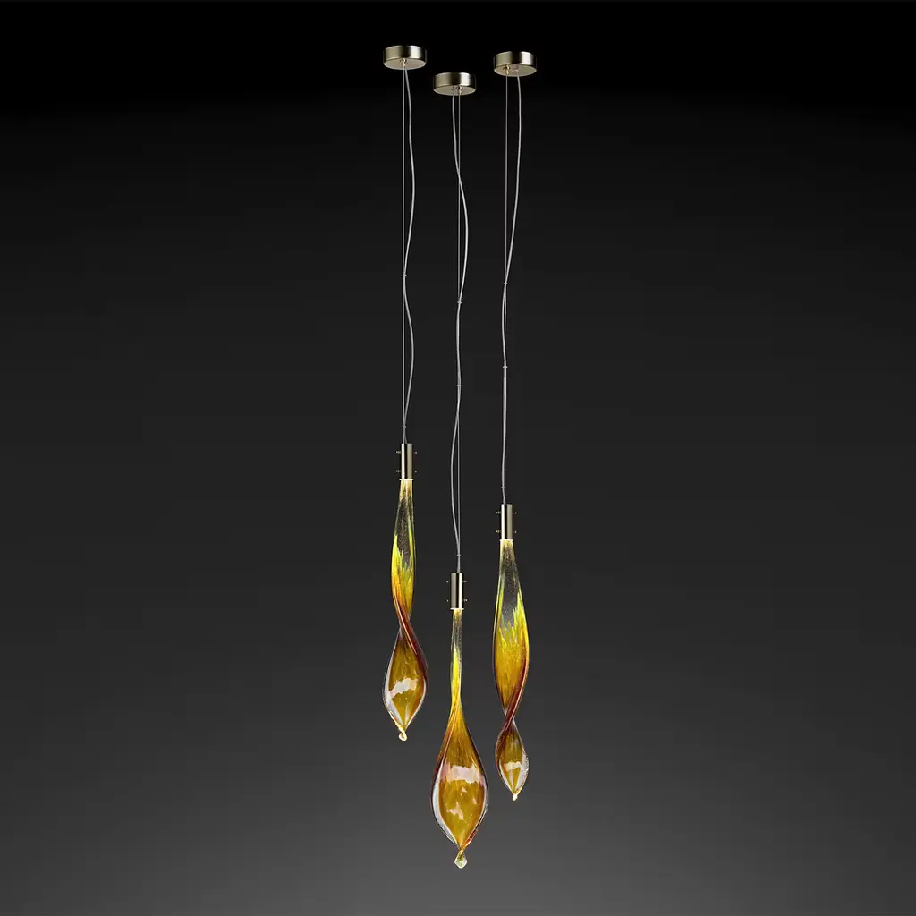 Sleek and timeless, this stupendous three-light chandelier will imbue a modern interior with warm sophistication. Its sinuous, leaf-shaped pendants are handmade of Murano glass, colored in a warm and soft amber hue, each hanging from a slim thread attached to a small round metal ceiling rose. Perfect for both private and hospitality interiors, it supports three LED bulbs (1.5 watts - 90 lumens + Included Driver). Please consult the Concierge for further information.