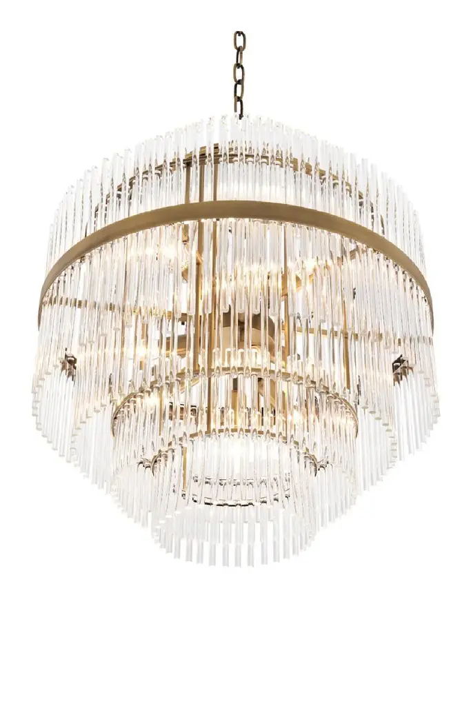 hannel glamorous Art Deco style into your home with the East Chandelier. This stunning vintage replica chandelier with antique brass finish exudes the vibrant atmosphere of the roaring 1920s. Several tapered levels of clear glass rods emanate a captivating illumination.