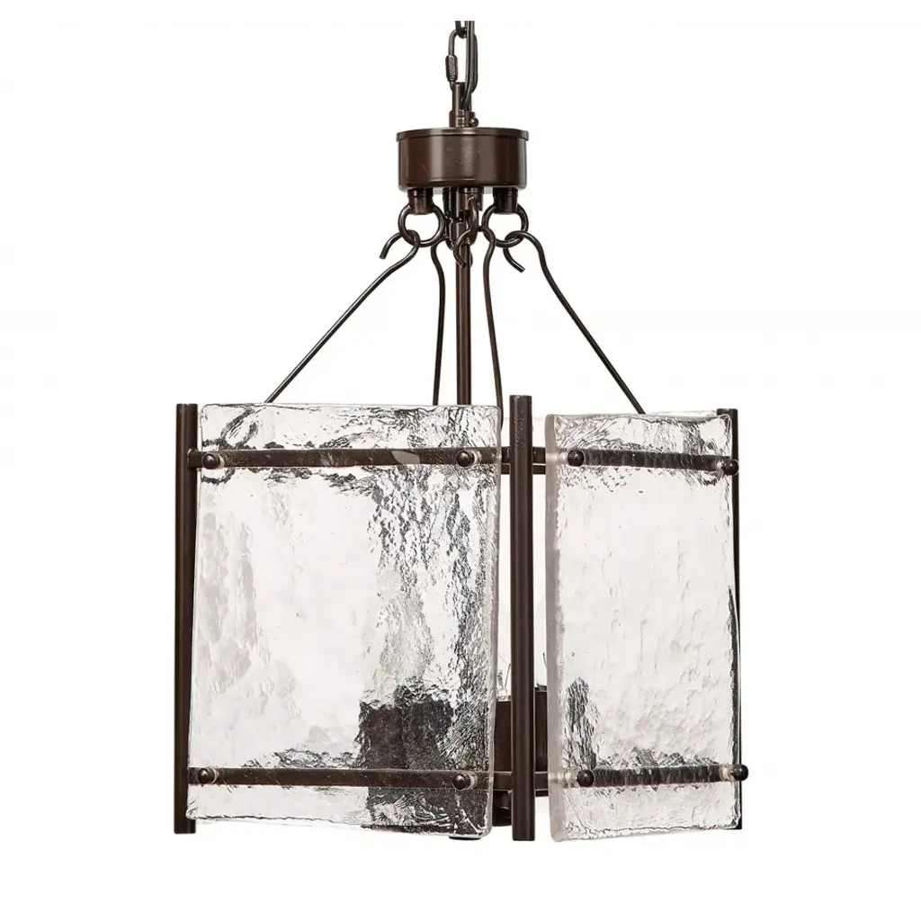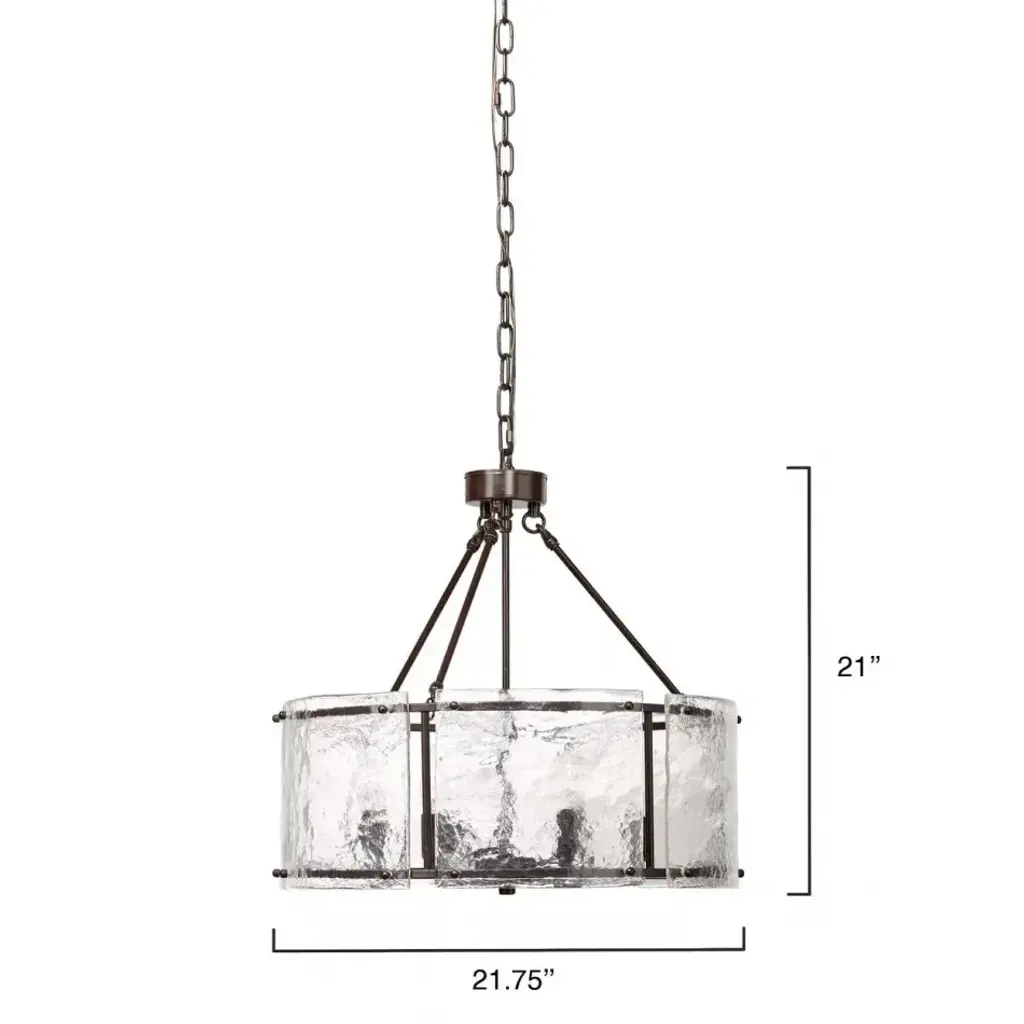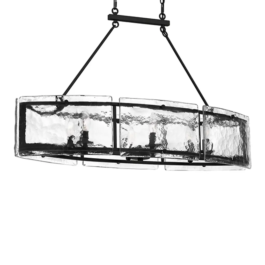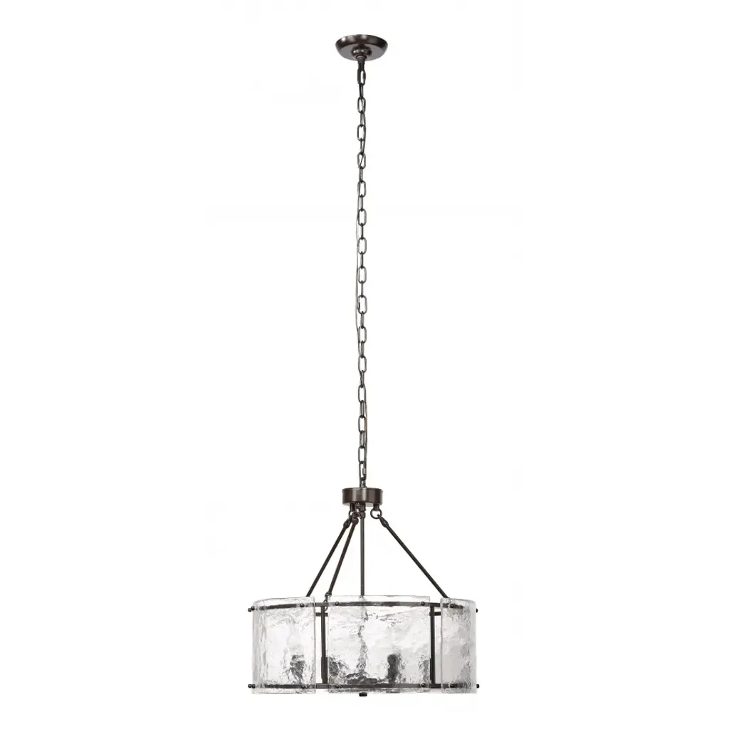 A refined study in contrasts, this striking chandelier features a softly curved slice of icelike glass that softens and diffuses the "flame" of the bulbs behind it. A smooth oil-rubbed bronze canopy and chain beautifully complement the richly textured glass. Sophisticated yet simple, this is a beautiful choice for above a dining table or to add drama to an entryway.