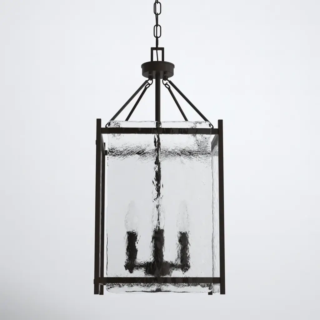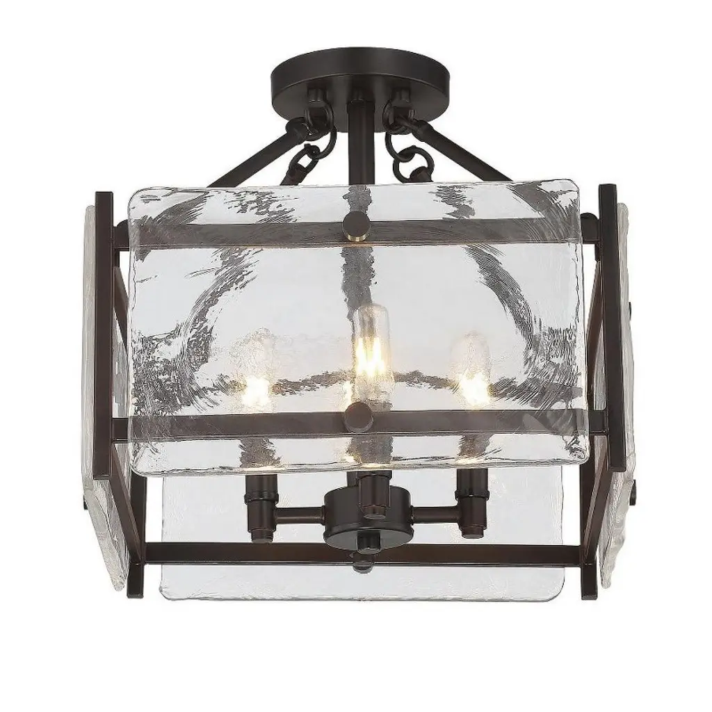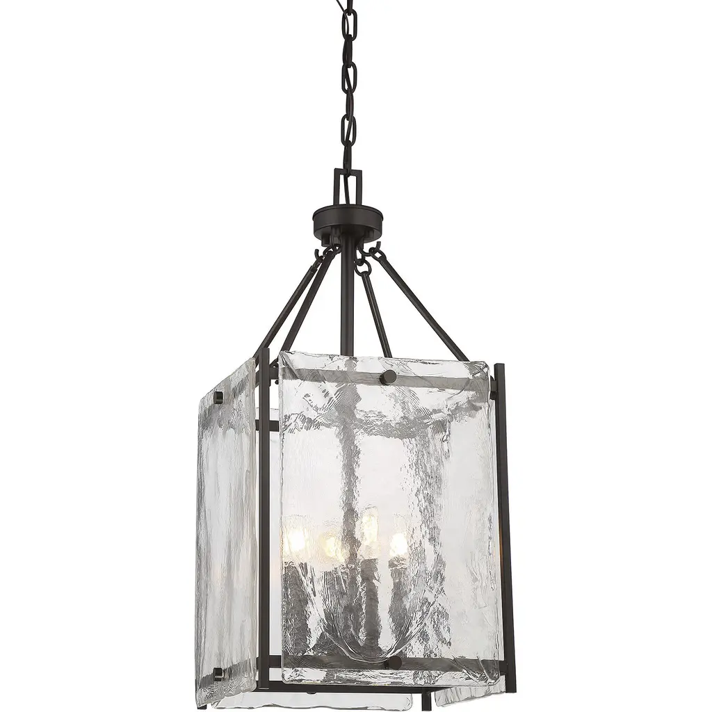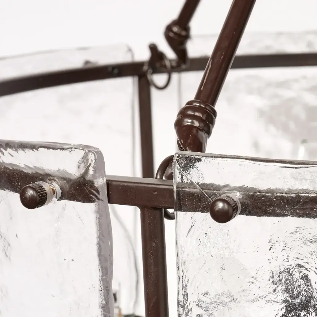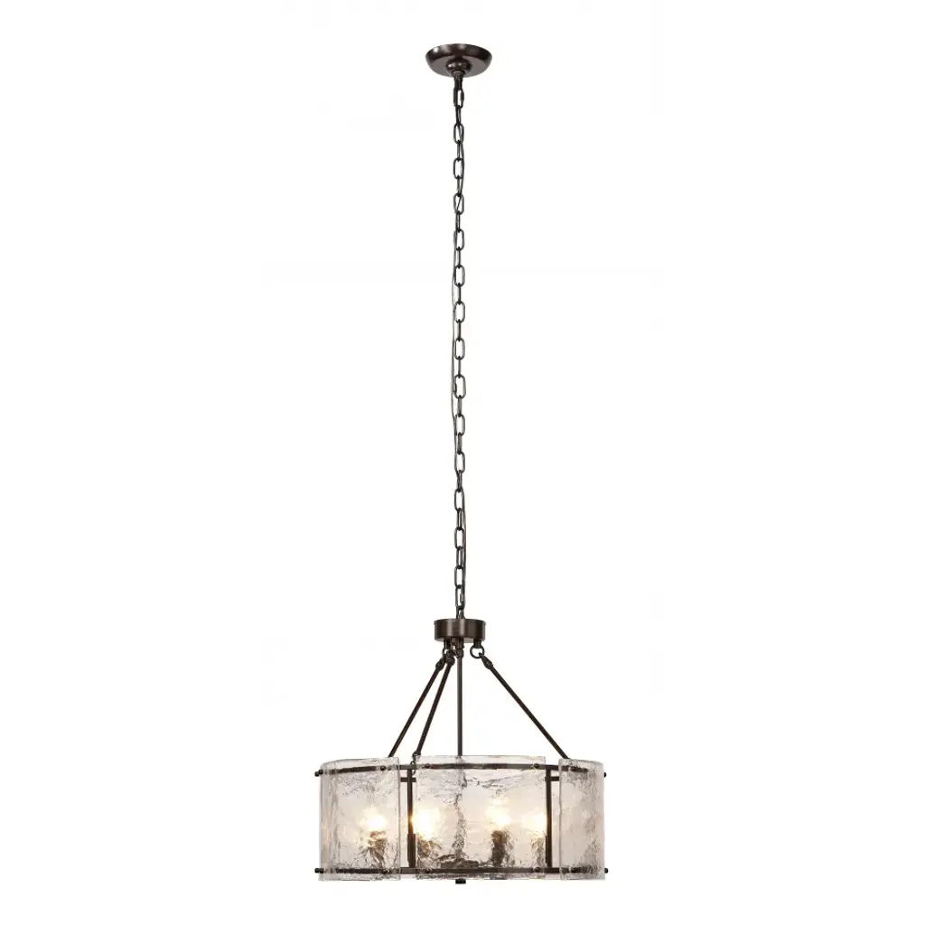 A refined study in contrasts, this striking chandelier features a softly curved slice of icelike glass that softens and diffuses the "flame" of the bulbs behind it. A smooth oil-rubbed bronze canopy and chain beautifully complement the richly textured glass. Sophisticated yet simple, this is a beautiful choice for above a dining table or to add drama to an entryway.