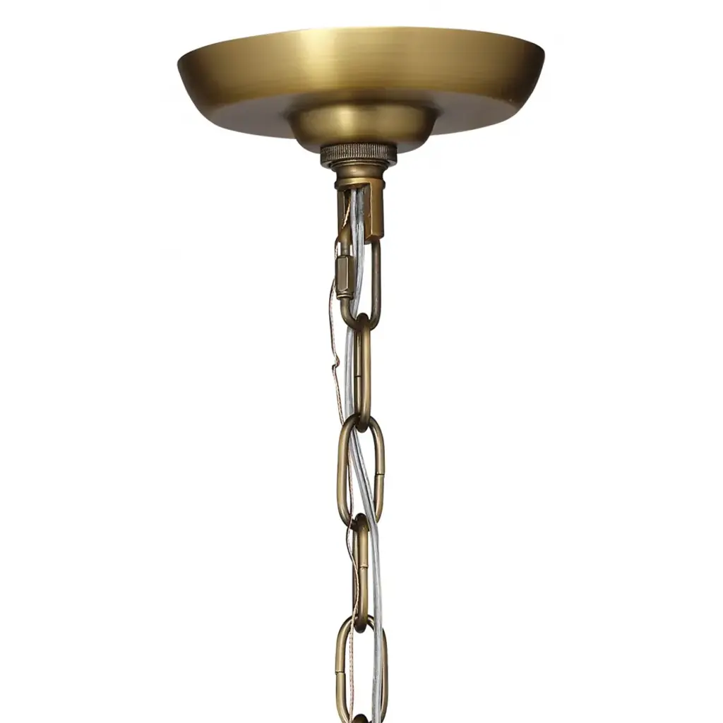 A refined study in contrasts, this striking chandelier features slabs ice-like glass that soften and diffuse the "flame" of the bulbs behind it. A burnished metal canopy and chain perfectly complement the richly textured glass. Sophisticated yet simple, it is a wonderful choice above a farmhouse dining table.