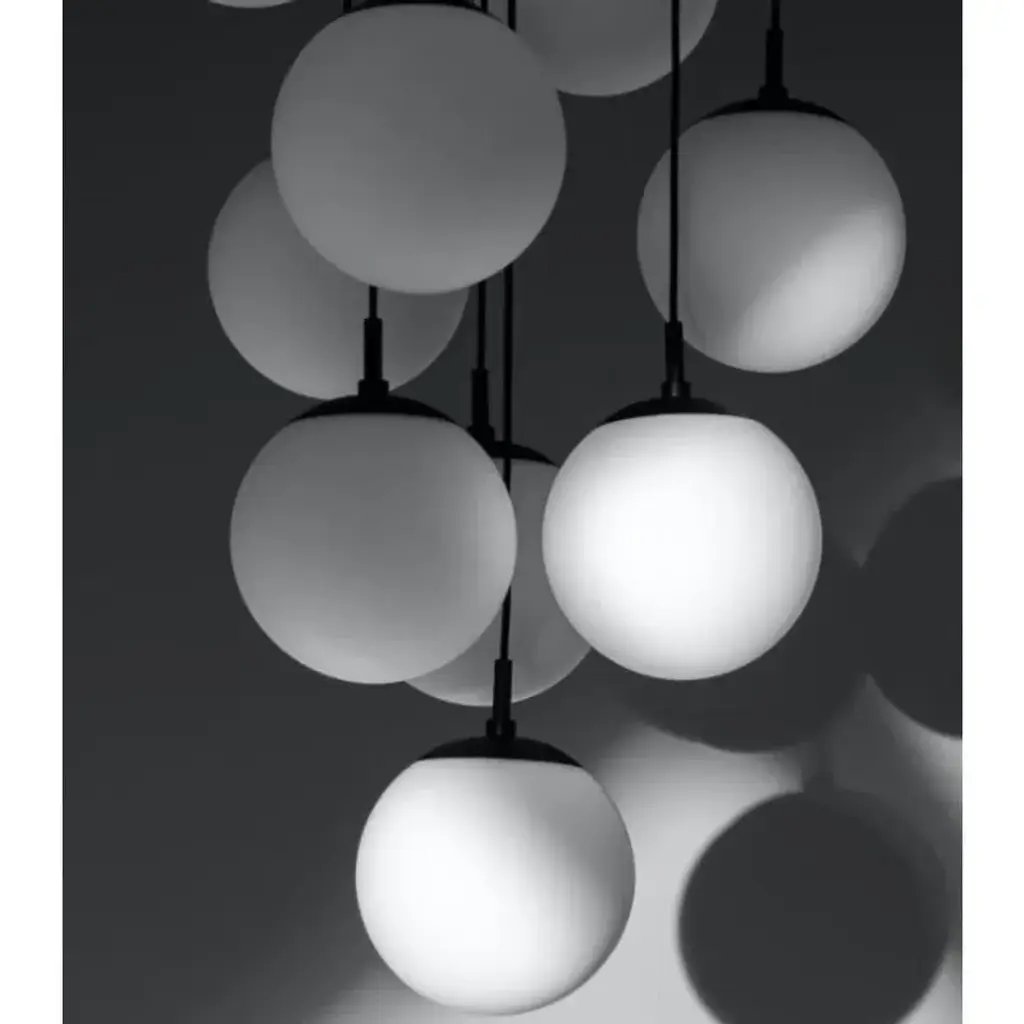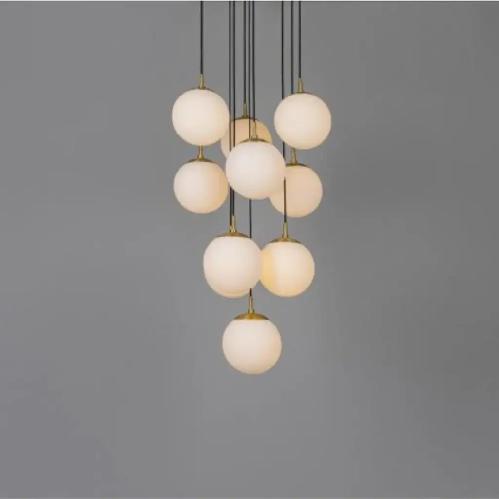 Globe cluster 10 chandelier by Schwung Dimensions: D 60 x H 155.4 cm Materials: Brass, opal glass Weight: 20.2 kg Finishes available: Black gunmetal, polished nickel, brass Other sizes available. Schwung is a german word, and loosely defined, means energy or momentumm of a positive manner. synonyms: verve, zest, panache, momentum. Mission Developing lighting fixtures through simple and timeless materials, sustainably; We are committed to creating quality products that last. Beginning with the design we are constantly refining aesthetic and function. Both in the lamps themselves and throughout the manufacturing process we pursue a holistic approach to efficiency, and the reduction of environmental impact. Up to 250V (Europe/UK Standard).
