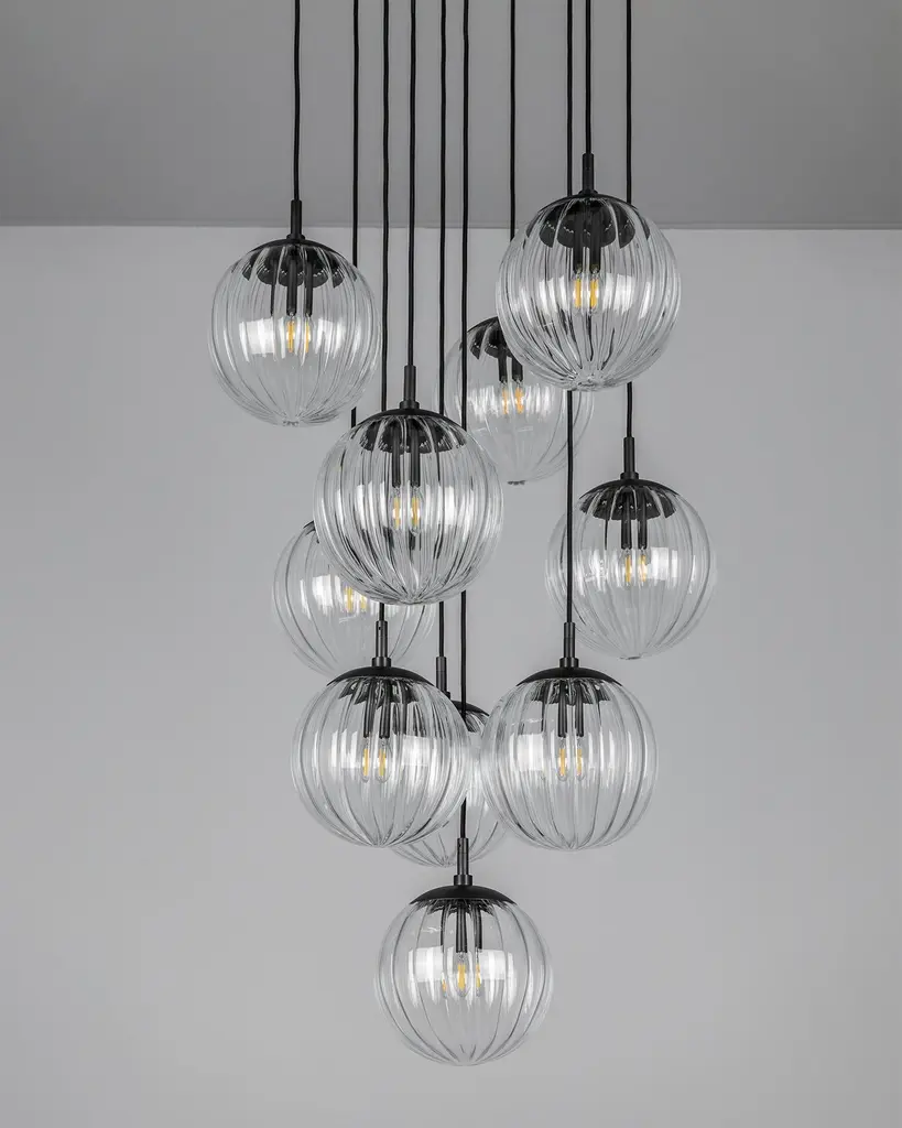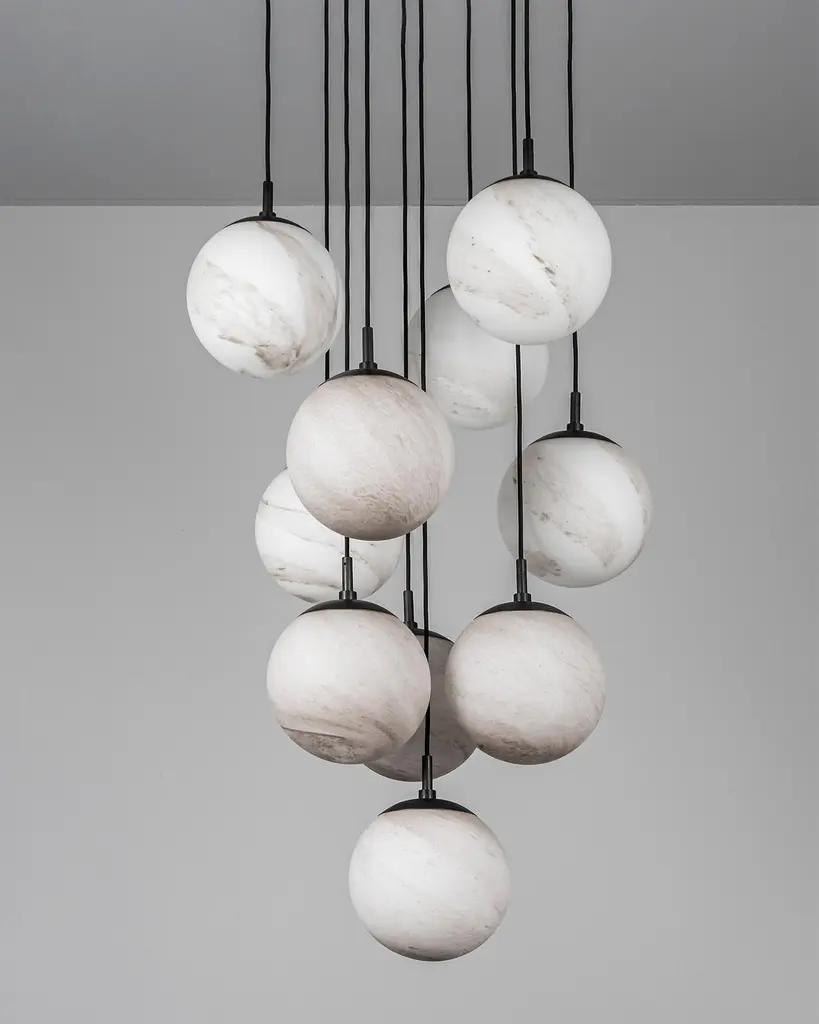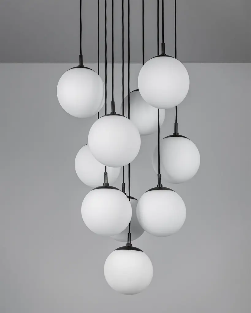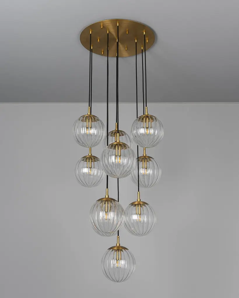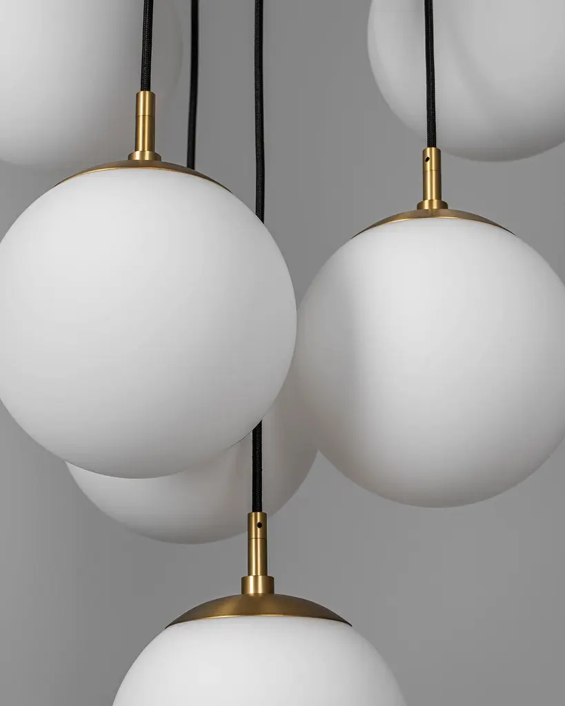 A cascade of ten glass spheres is suspended from a circular brass plate. Available in three types of signature glass, this effervescent vision hovers weightlessly like a cloud.Available in our three signature finishes: Lacquered Burnished Brass (LBB); Black Gunmetal (BGM); Polished Nickel (PN)And a selection of three distinctive glass globes: Opal Mat; Marbled; ‘Dries’ Ribbon GlassGlobeRather than a singular collection, ‘Globe’ is an expansive framework, a lighting concept that guides our design through endless possibility. A time-bending journey exploring 19th & 20th Century lighting, this adaptable concept gives you the freedom to create the piece of your desires, tailored to your individual taste and style. Technological innovations and historical techniques amplify the distinct personality of every interior with three types of signature glass: Opal Mat, Marbled and ‘Dries’ Ribbon Glass; and three brass finishes: Lacquered Burnished Brass, Black Gun Metal and Polished Nickel. A sophisticated palette of brass and glass was born through our research into the language of design and the codes of every era – distilling and combining forms to envision possibilities for the future.Dimensions:Diameter: Ø 600 mm / Ø 23.6''Height: 1554 mm / 60.8''Weight: 20.2 kg / 44.5 lbLight sources available:LED Bulb (included) 10 x 5 W.