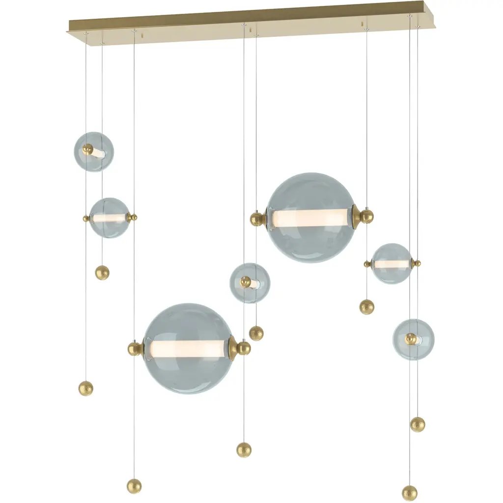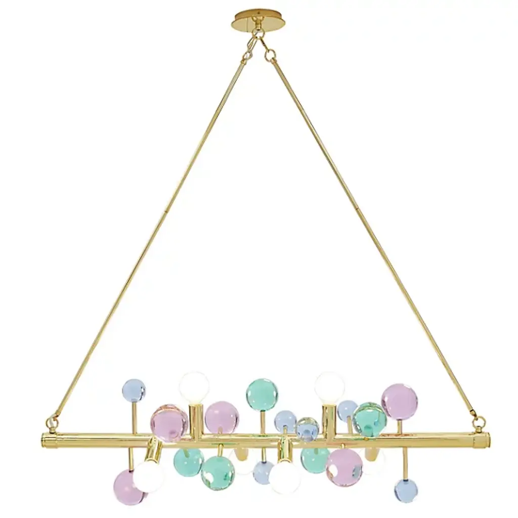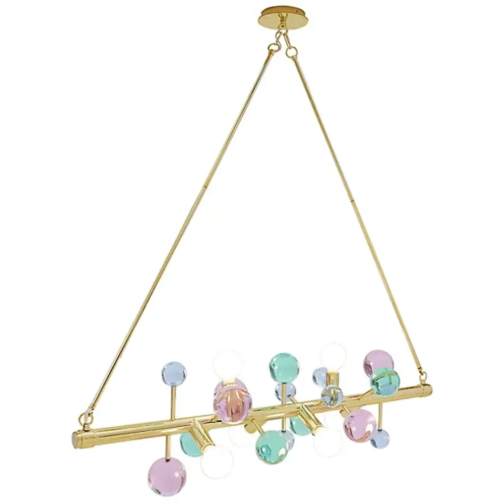 The Globo Six-Light Linear Chandelier from Jonathan Adler features downrods formed of fine steel that are sharply angled, uniting with a linear framework to form a beautiful triangular profile. Meticulously crafted, this fixture is lined with a collection of glass globes that radiate a bright glow overhead, enhancing the visibility of your surroundings. Globo is a statement piece, capturing attention with its distinctive design. Easily adjust its brightness level with a separately sold ELV dimmer.