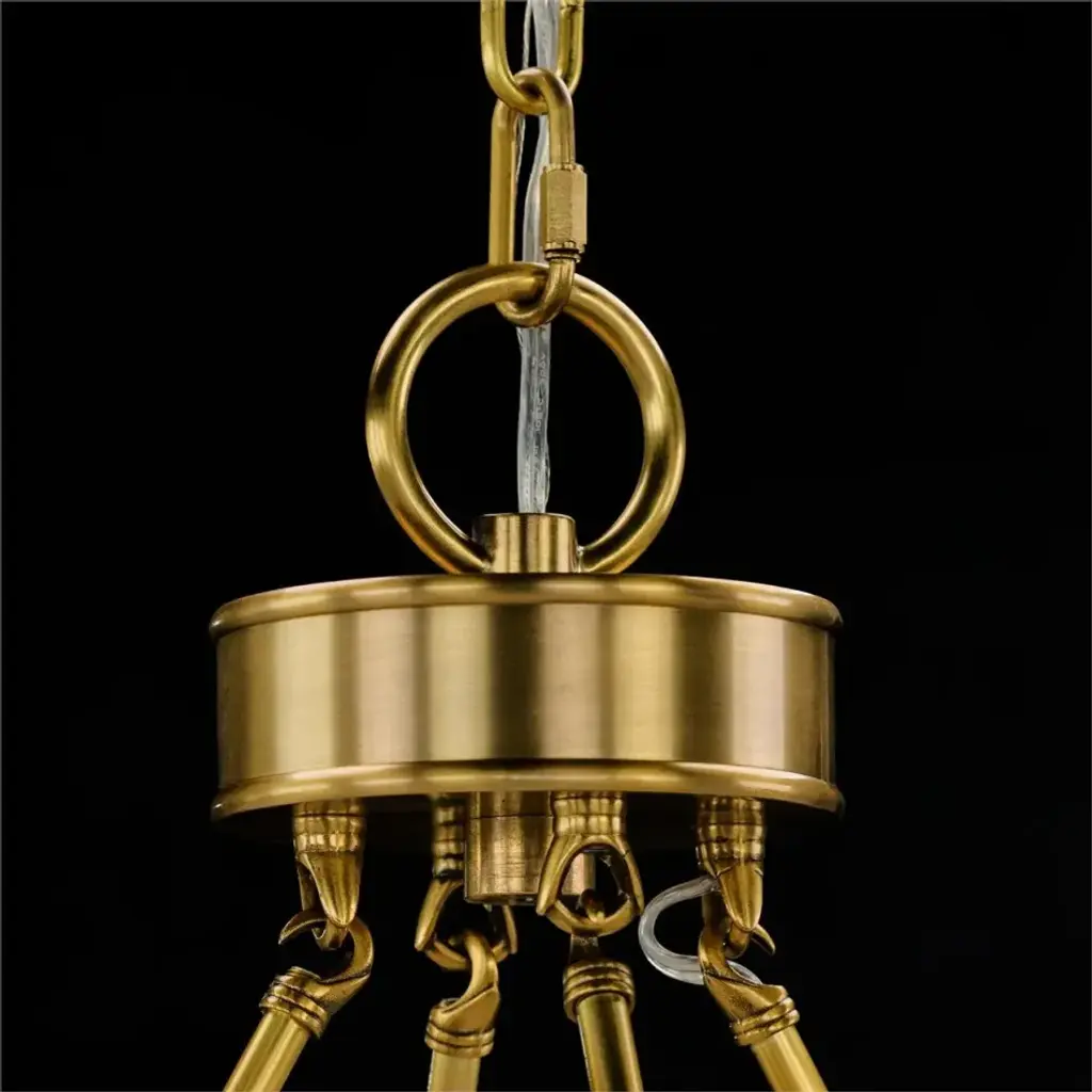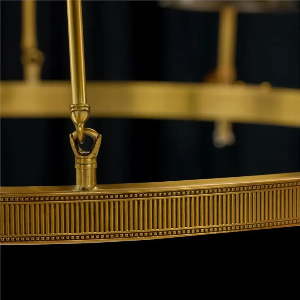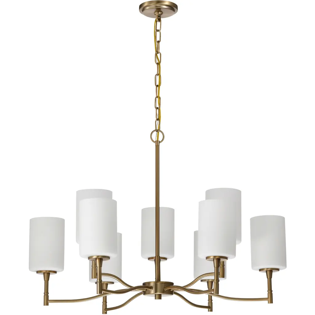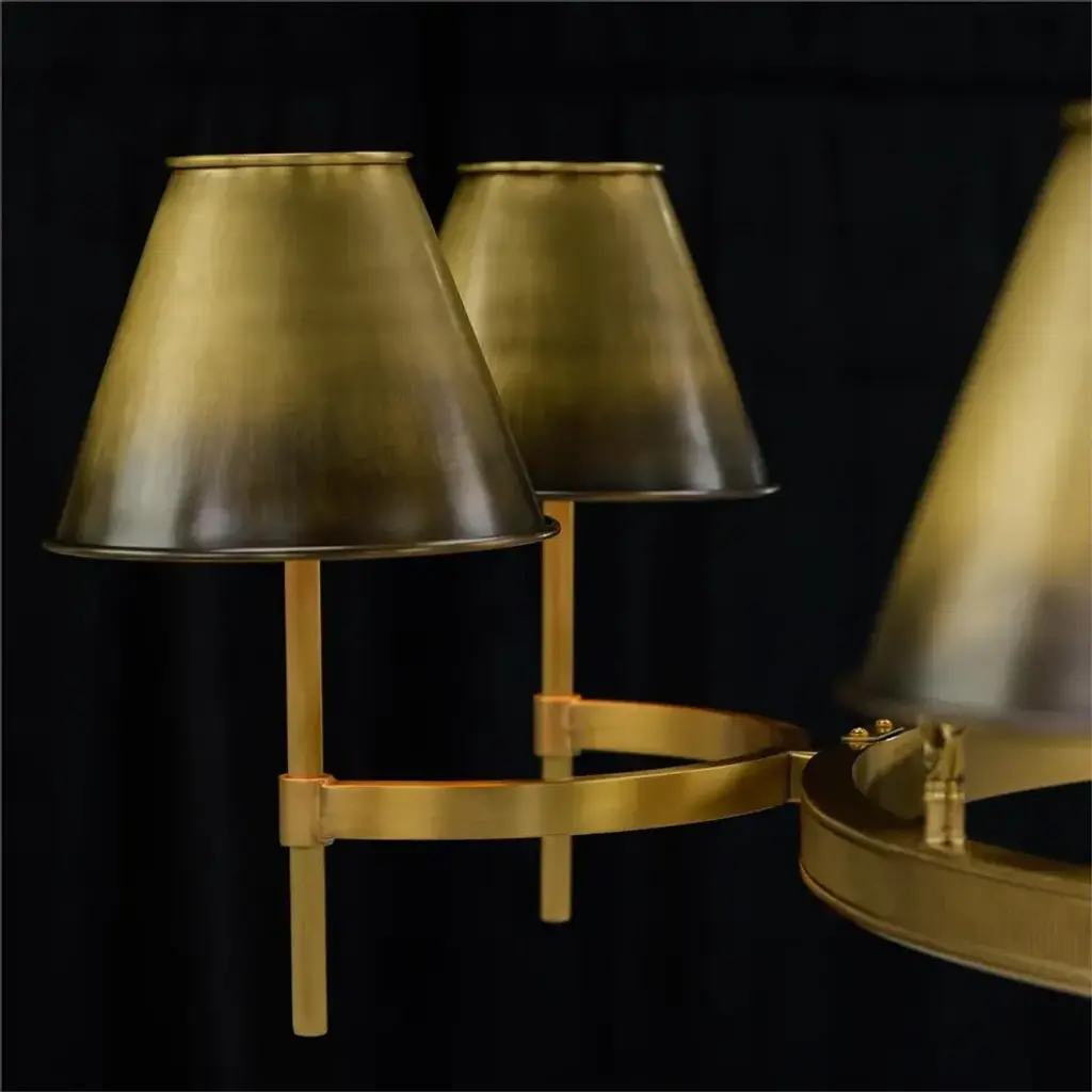 The Glory Eight-Light Chandelier is a stunning light fixture that displays opulent tones and a wealth of visual depth. Crafted from brass, the round frame showcases textural striations and features four semi-circle mounts on each side. Each mount houses two lights each with a brass shade and a gorgeous ombre look. The piece hangs from a small round canopy in matching brass.