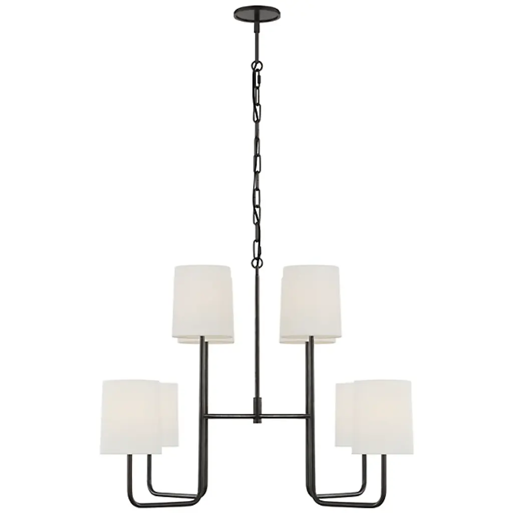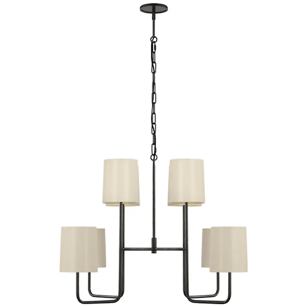 Unclutter your décor with the Go Lightly Chandelier by Visual Comfort Signature, formerly known as Visual Comfort, Its minimalist design features a slim metal frame that supports two tiers of Silk shades. The fixture’s openness brings a natural warmth and levity to your living space while providing a soft, even illumination. Ideal for contemporary and traditional settings, either over a dining room table or spacious living room.