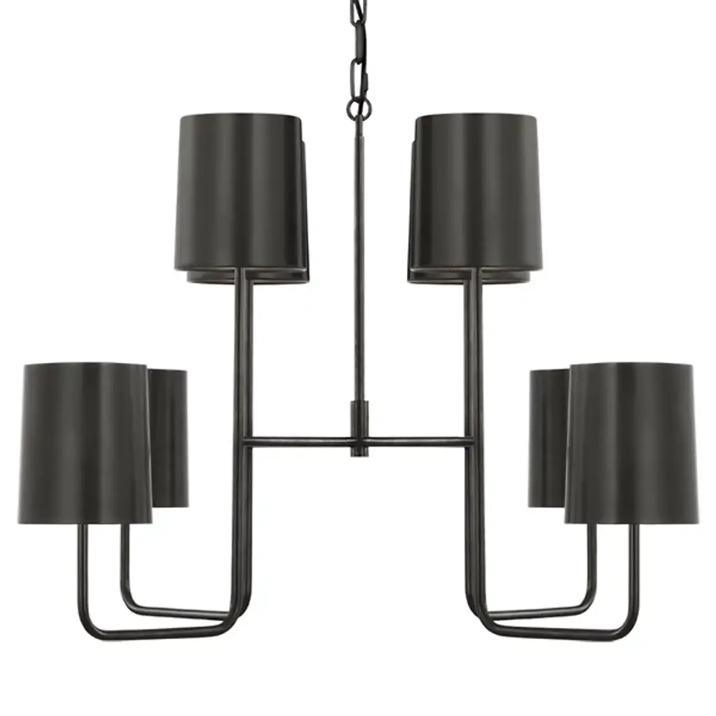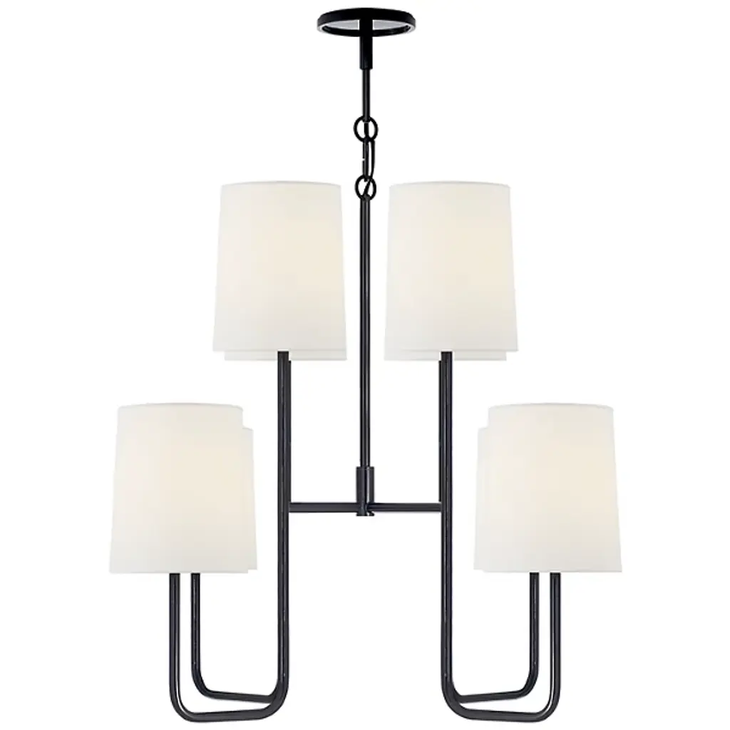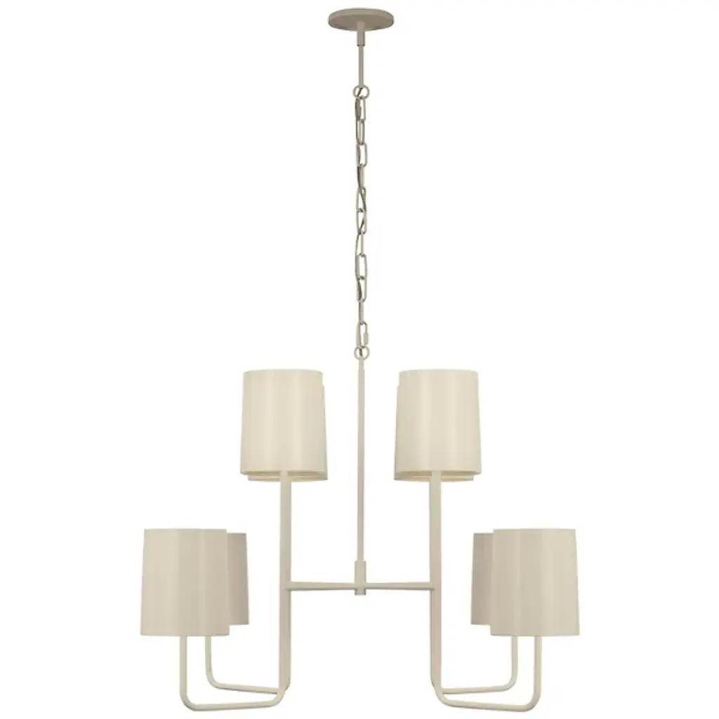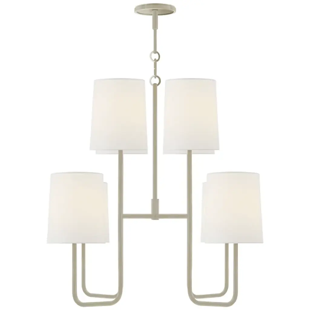Unclutter your décor with the Go Lightly Chandelier by Visual Comfort Signature, formerly known as Visual Comfort, Its minimalist design features a slim metal frame that supports two tiers of Silk shades. The fixture’s openness brings a natural warmth and levity to your living space while providing a soft, even illumination. Ideal for contemporary and traditional settings, either over a dining room table or spacious living room.