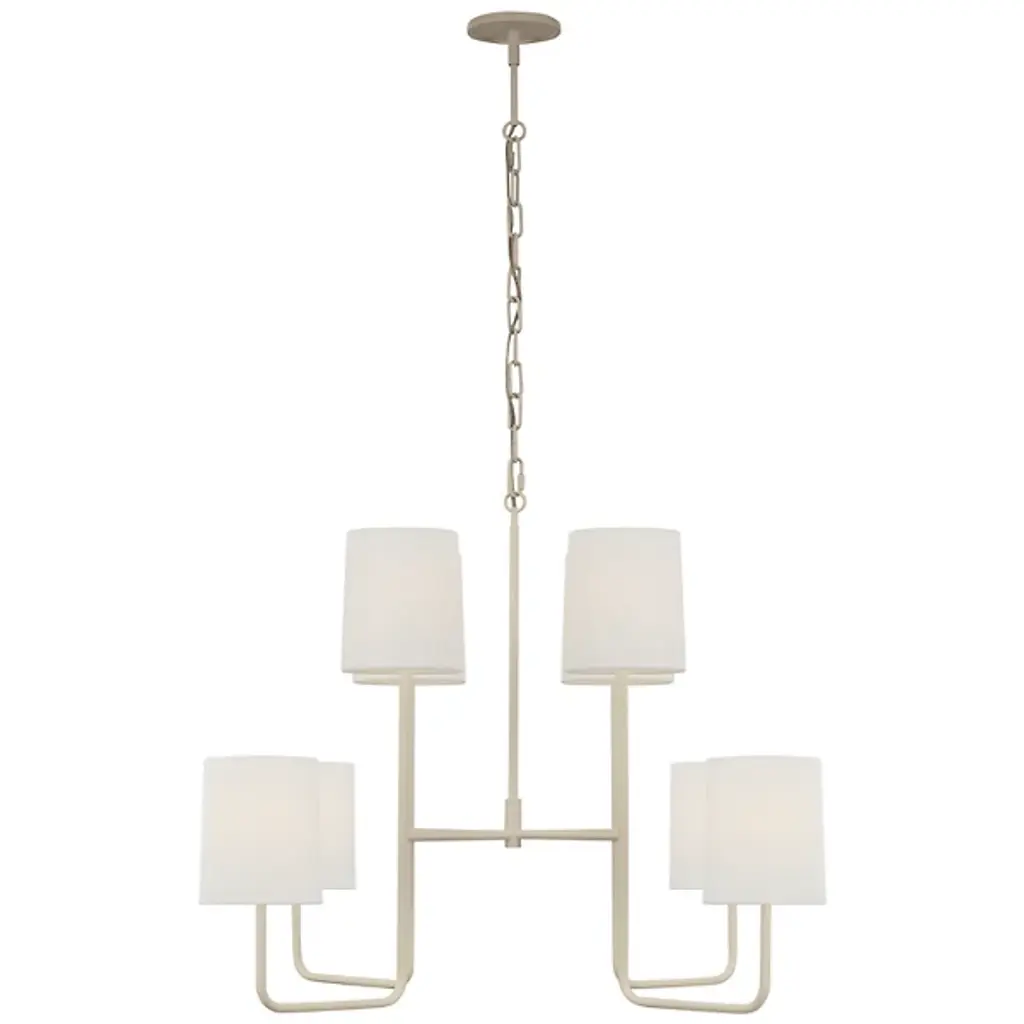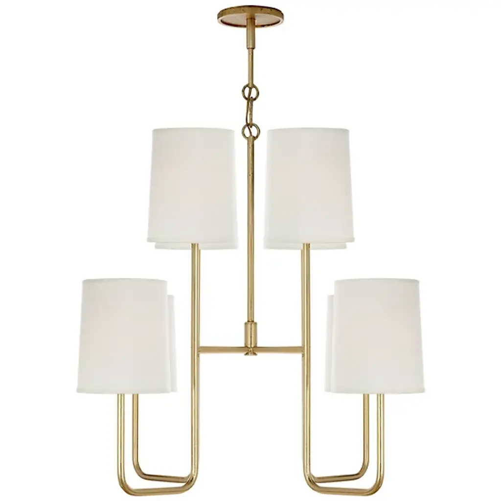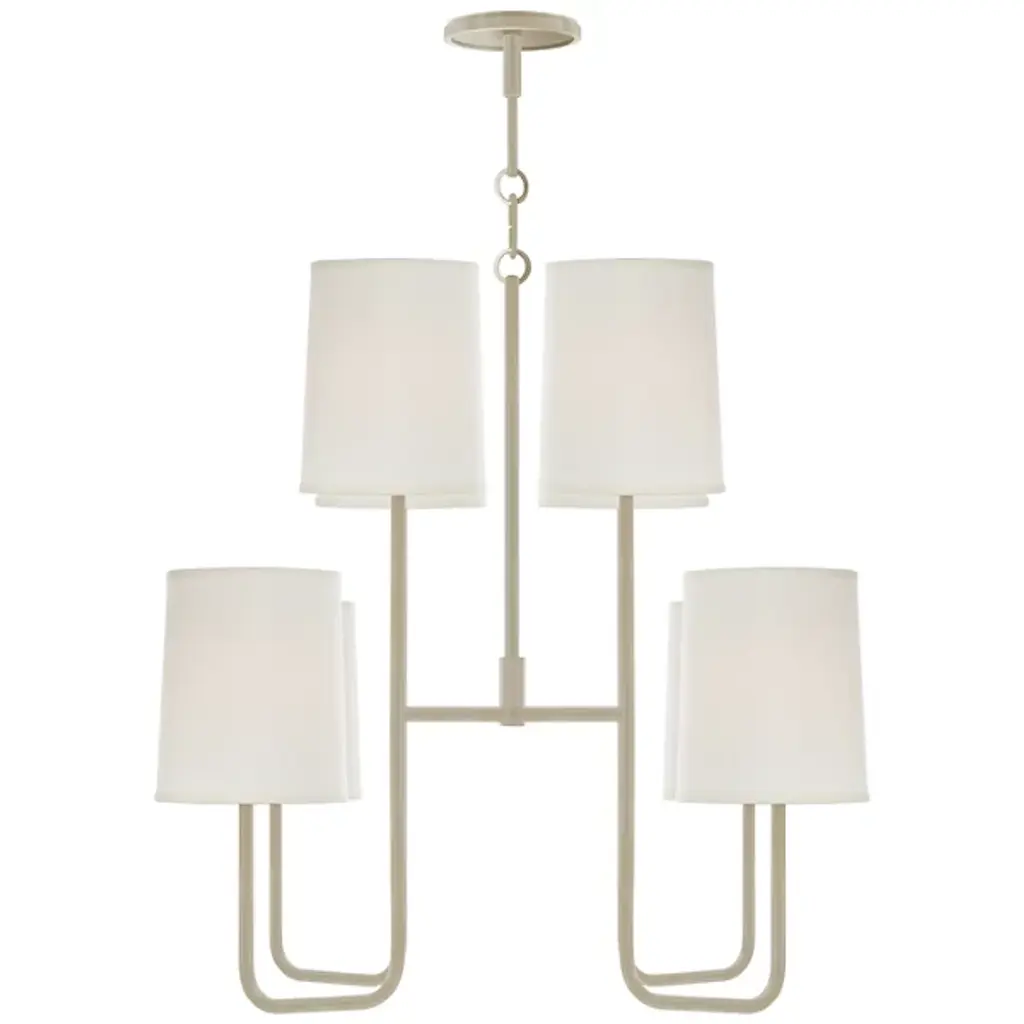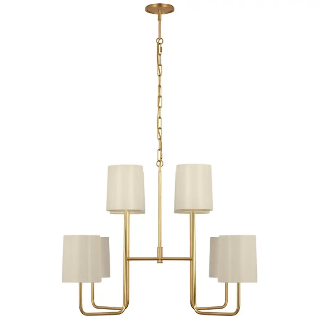 Unclutter your décor with the Go Lightly Chandelier by Visual Comfort Signature, formerly known as Visual Comfort, Its minimalist design features a slim metal frame that supports two tiers of Silk shades. The fixture’s openness brings a natural warmth and levity to your living space while providing a soft, even illumination. Ideal for contemporary and traditional settings, either over a dining room table or spacious living room.