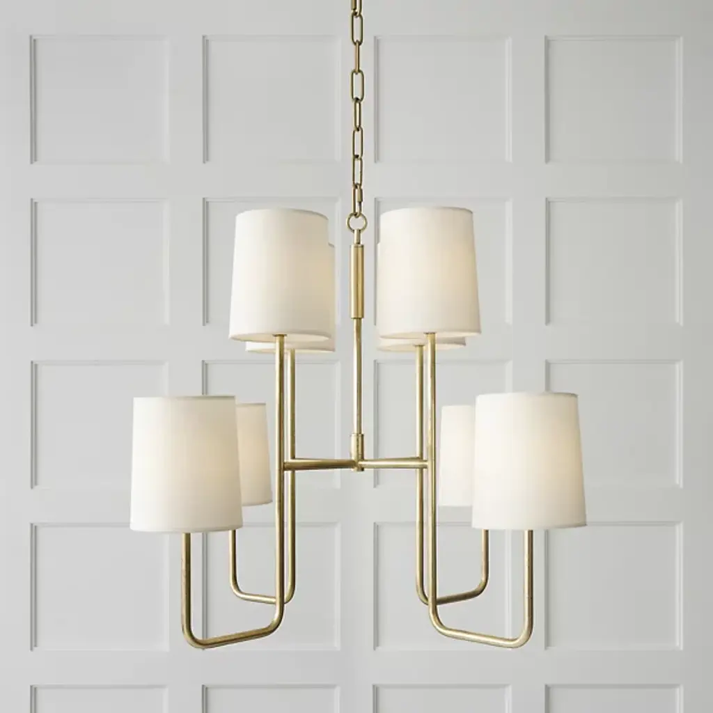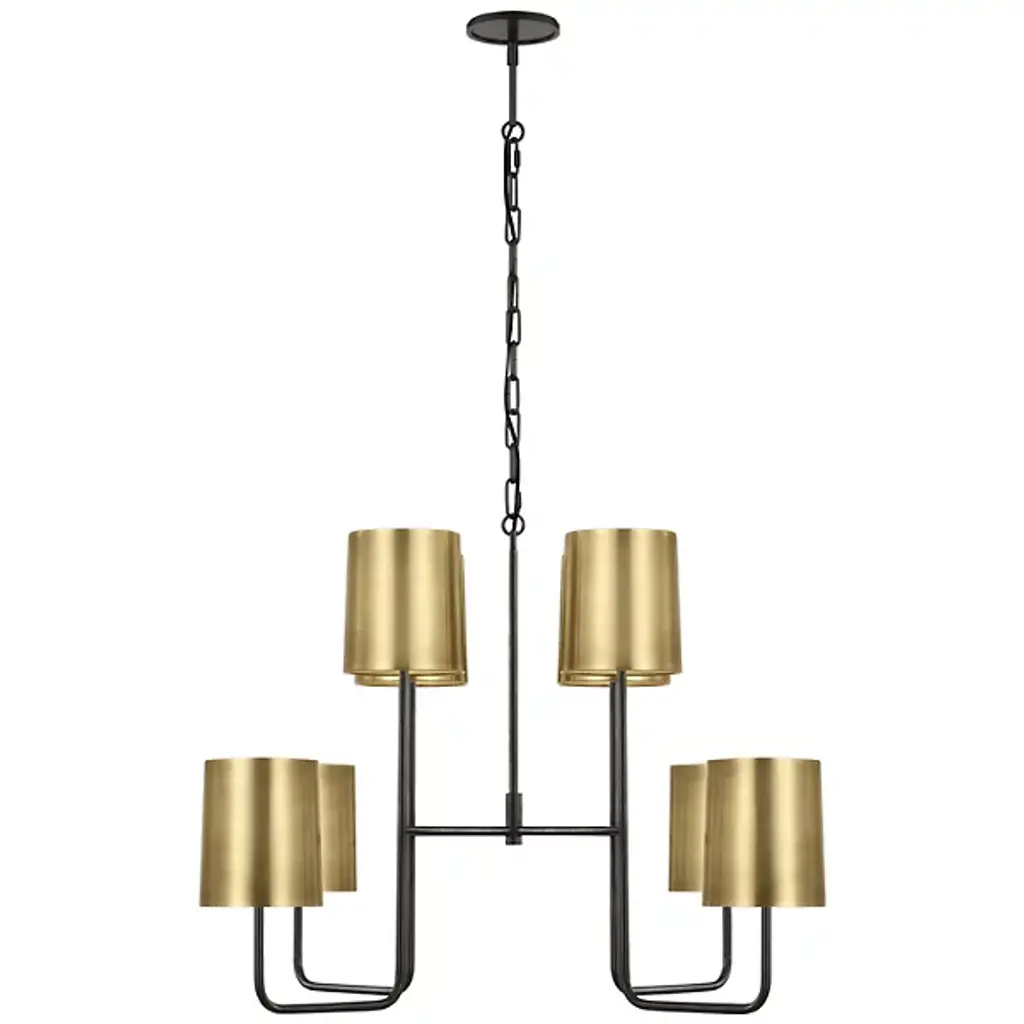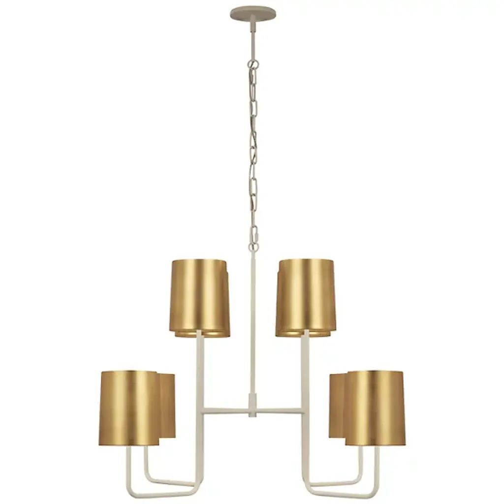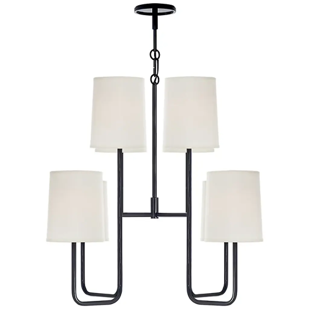 Unclutter your décor with the Go Lightly Chandelier by Visual Comfort Signature, formerly known as Visual Comfort, Its minimalist design features a slim metal frame that supports two tiers of Silk shades. The fixture’s openness brings a natural warmth and levity to your living space while providing a soft, even illumination. Ideal for contemporary and traditional settings, either over a dining room table or spacious living room.