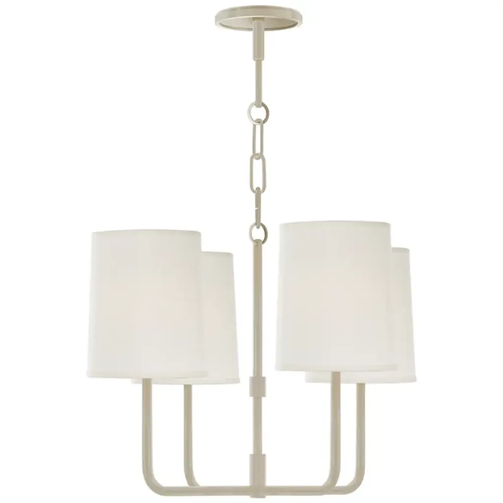 The Go Lightly Small Chandelier by Visual Comfort Signature, formerly known as Visual Comfort, strips down lighting to its essential elements, bringing you a bold minimalist piece fit for traditional and contemporary settings. Its body consists of slim metal arms which extend from a central stem and curve up, culminating in a series of decorative Silk shades. The shades help diffuse light from internal sources, creating a warm, even ambiance that is both pleasant and useful.