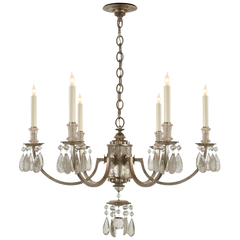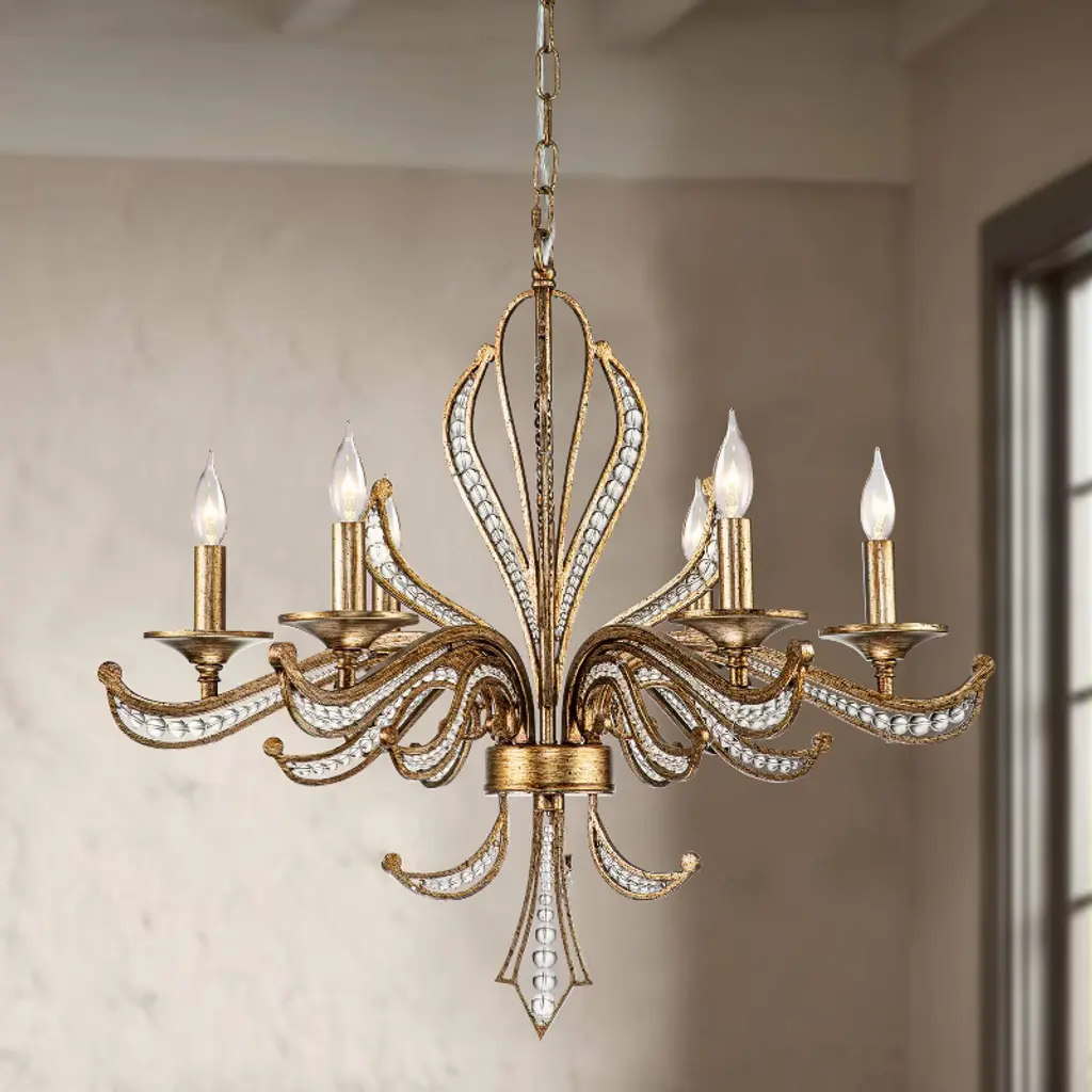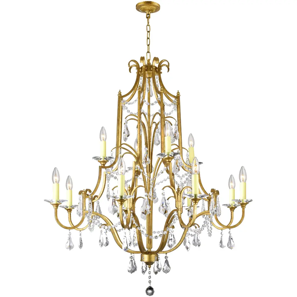 A graceful eight-light chandelier in a gold-leaf finish that has tapered candles and is adorned with polished, smooth crystal drops. Candelabra Base, 60 Watt Max, 8 Type B Bulbs, Canopy: 5", Chain: 13'