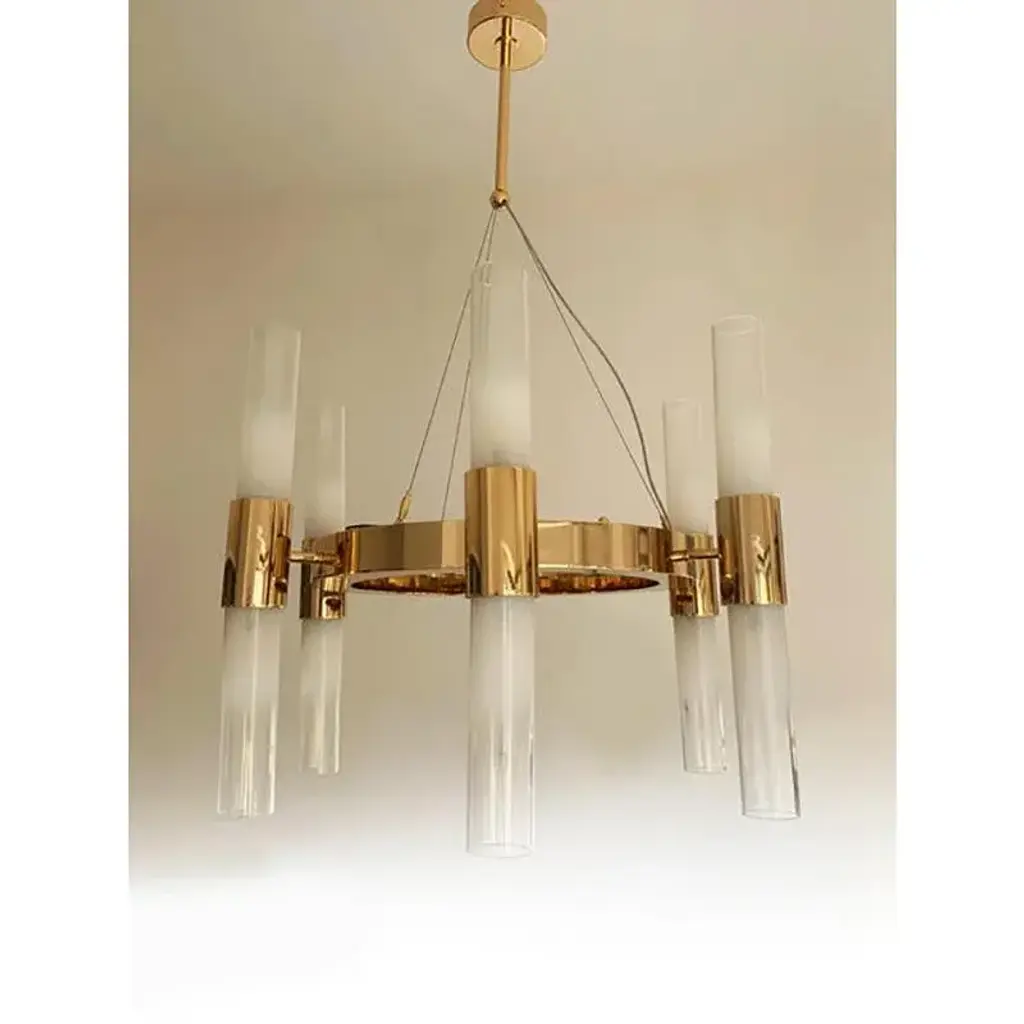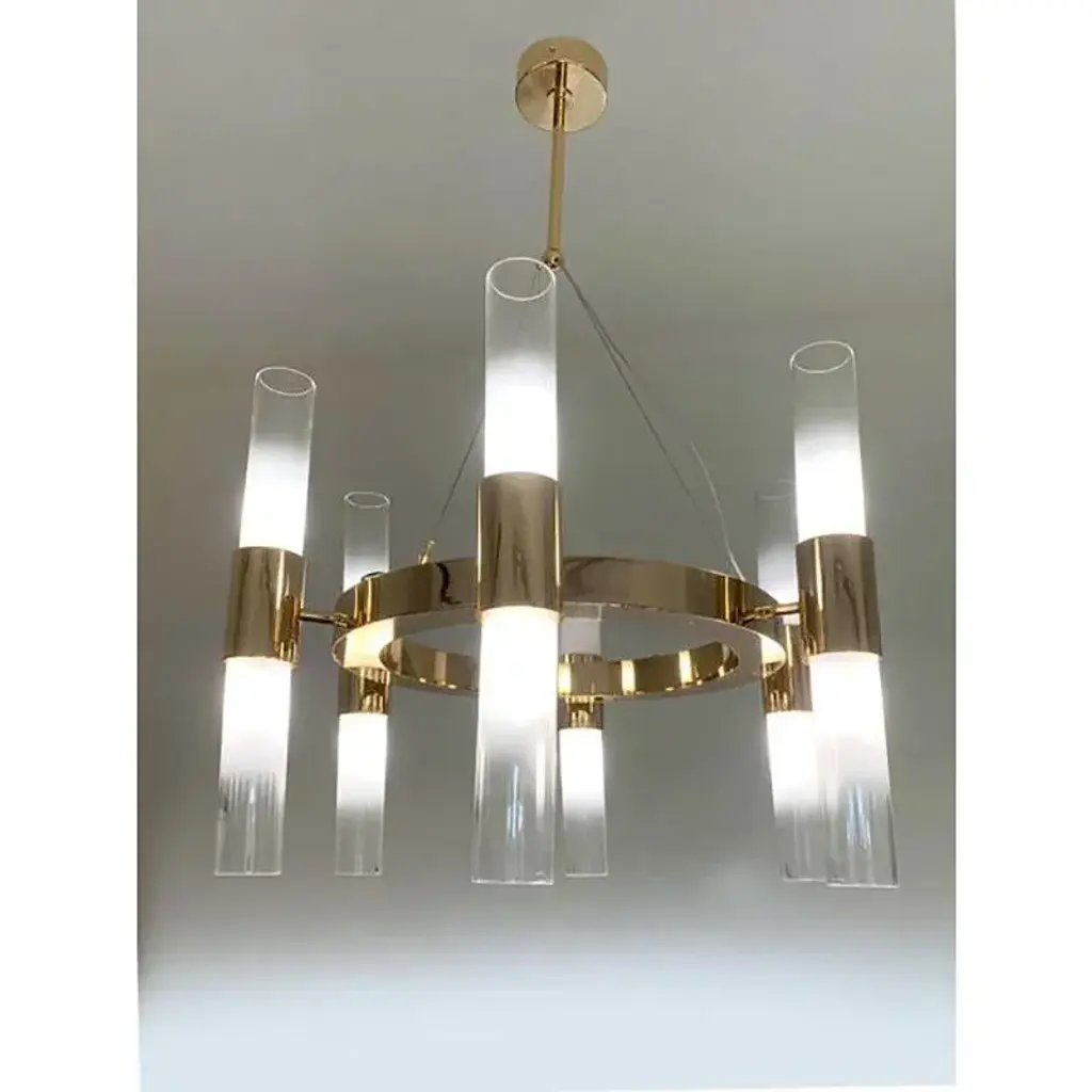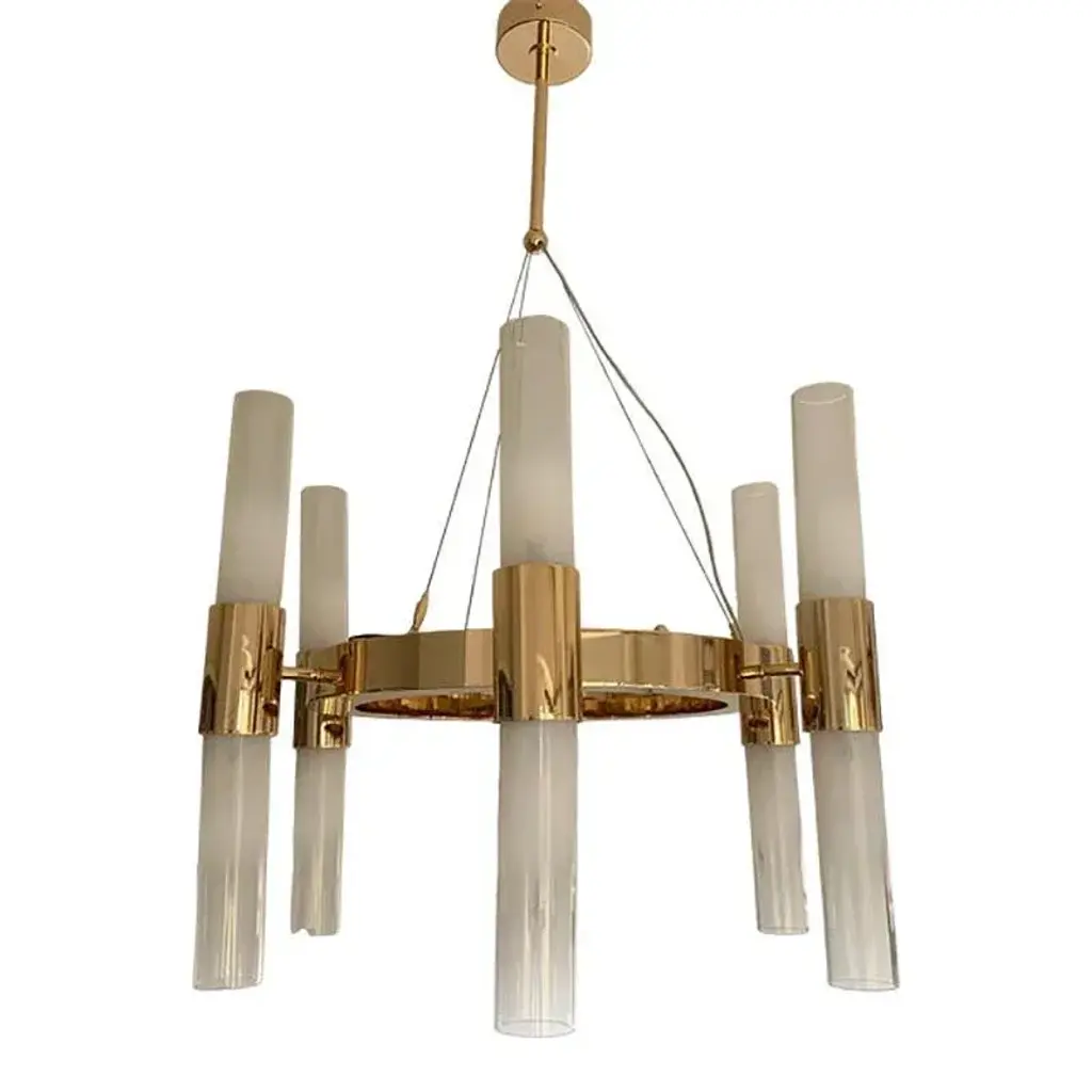 Luxury gold ring chandelier with scenographic gradient white glasses. impressive metal frame in gold 24k plating bath. exclusive design by simoeng ,exclusive made in italy. softly luminous cilinders of glass : a thouch of contemporary and luxury in your home. entirely made in italy fruit of hight italian hand-craftsmanship. adjustable height with steel cables, standard 100cm/39.3″ dimensions (cm/in): d 75cm h 55cm/ d 29.5 ” h 21.6″ finiture: gold 24k plating bath. 12 x g9 led. Bulbs not included, compatibles with led sustainability all made in italy, ship from italy us plug (up to 110v).
