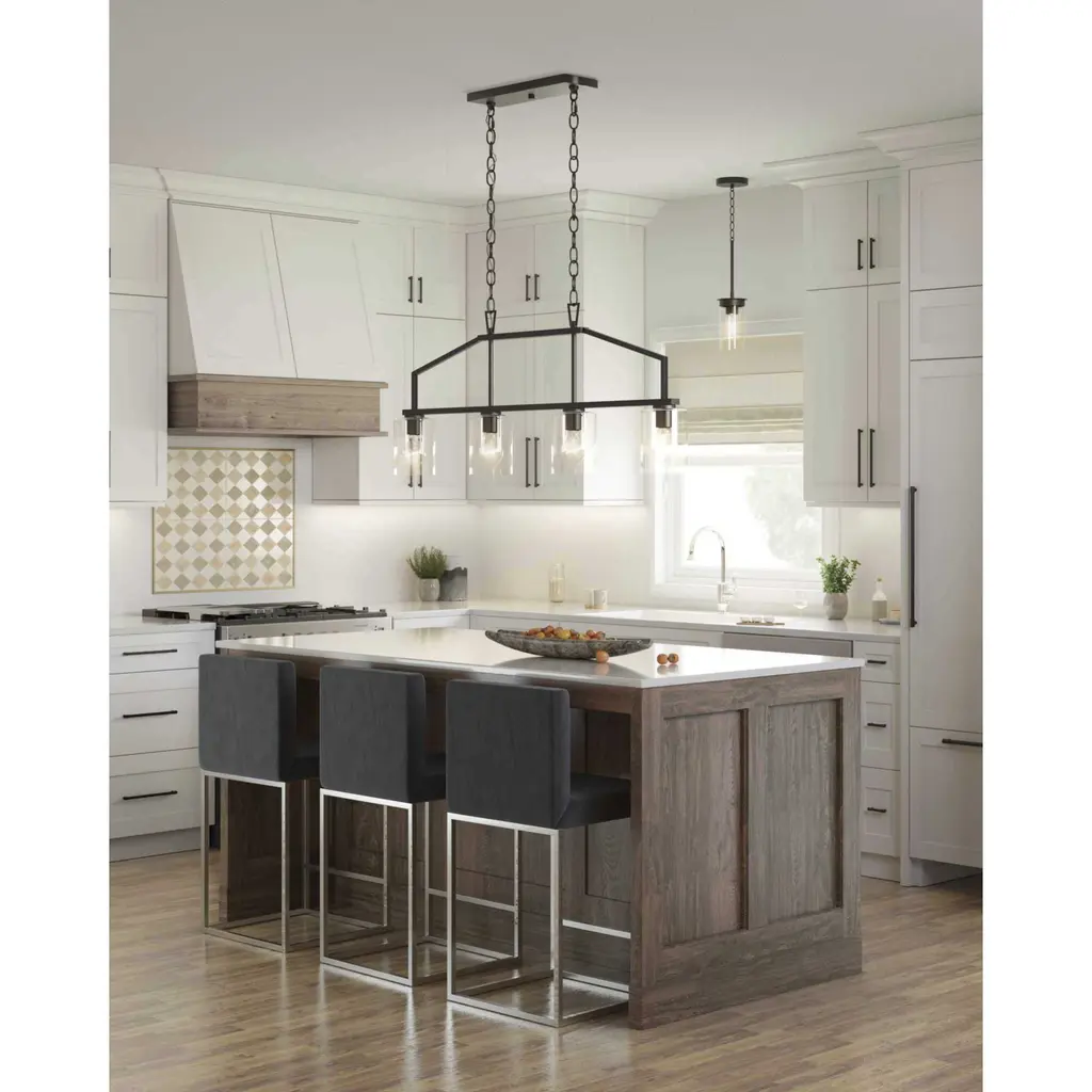 The Goodwin Island Light features a clean design that seamlessly blends with today's modern decor. Angular, crisp lines highlight the frames modern profile. Columns of clear glass shade offer bright illumination for dining rooms, kitchens and bars in modern farmhouse settings.
