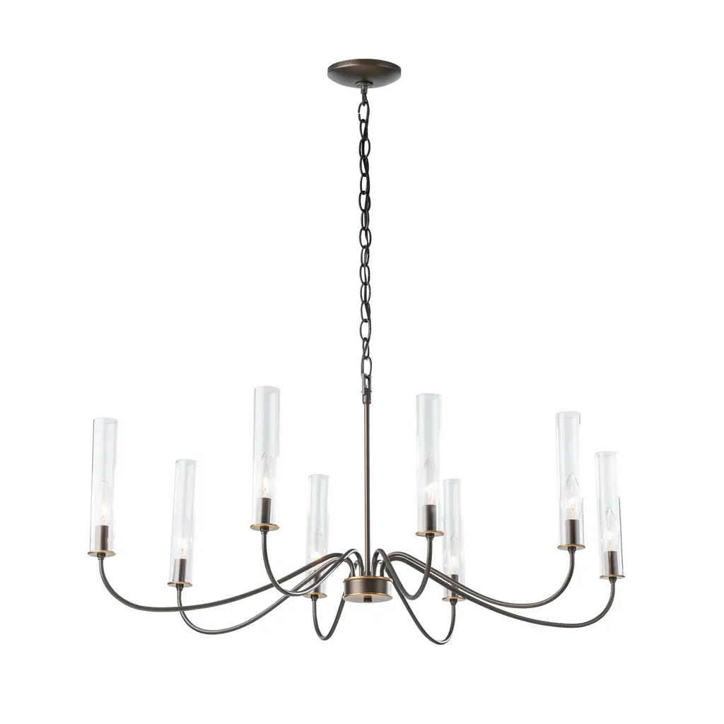 The Grace Chandelier showcases all of the poise and elegance that a designer lighting fixture commands. Clean traditional lines are artfully hand-forged in a steel oval form with accents of brass here and there. Eight clear glass tubes encase delicate light bulbs, completing the timeless design. The Grace Chandelier is classic in all the right ways.Hubbardton Forge lighting is handcrafted in Vermont, USA by highly skilled artisans. Every lamp is made-to-order and handmade using environmentally friendly metal forging techniques. Powder coatings and aqueous metal cleaning are used in the production of every lamp.Shown in Dark Smoke finish with Clear glass
