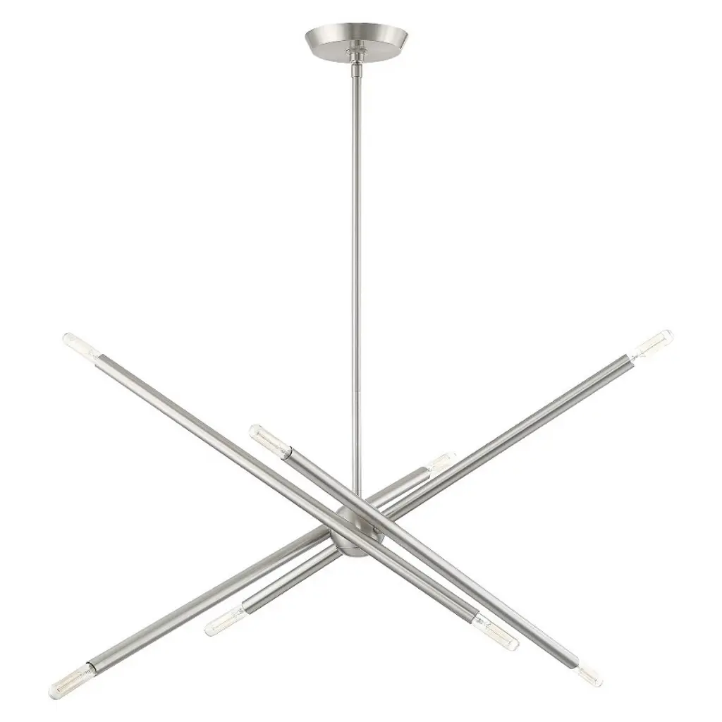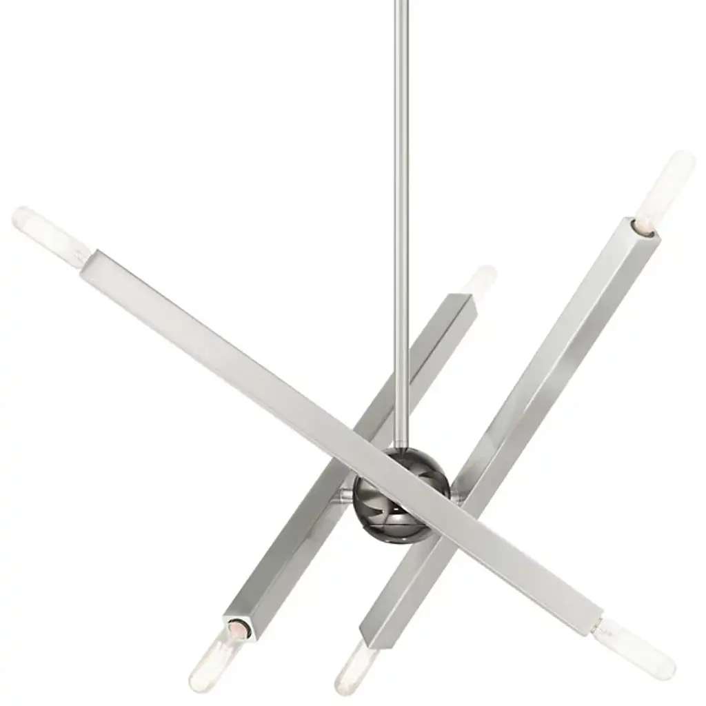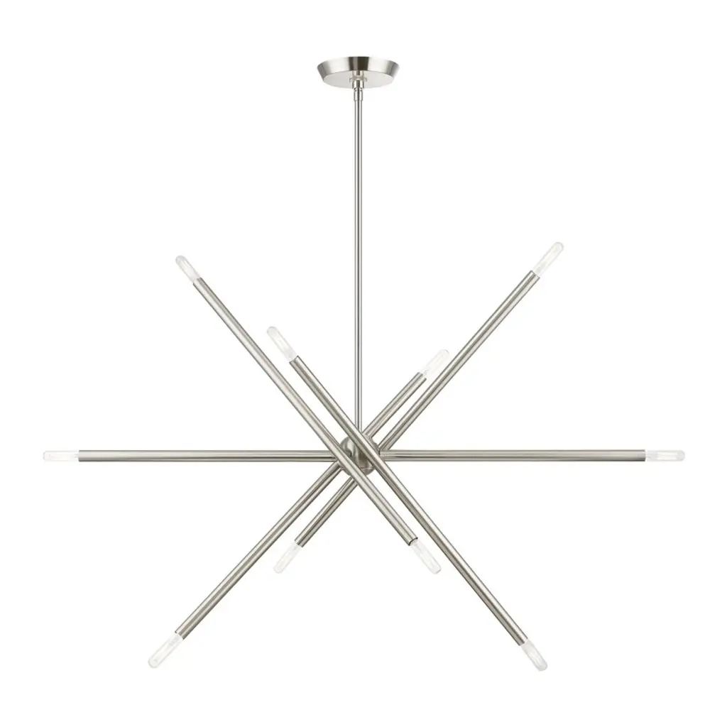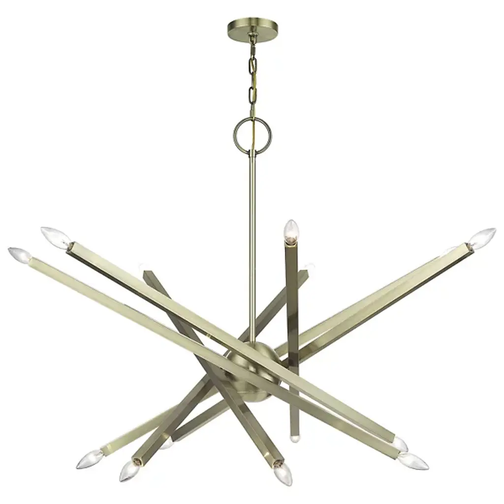 The eyes can’t stay still as they follow the graceful movement of the Grace Chandelier from Alder & Ore. Evoking the starburst, multi-directional design of the mid-century sputnik, this piece sets itself apart with a sculptural composition that appears to change at every glance. The chandelier’s globe body arouses one’s curiosity as it hides behind a dynamic array of lines. The linear arms appear erratic in movement yet come together to create a balanced, graceful silhouette. Each arm features dual, exposed bulbs for a truly multi-directional light. The topping candelabra bulbs create an inviting ambiance while producing an artful play of shadows.