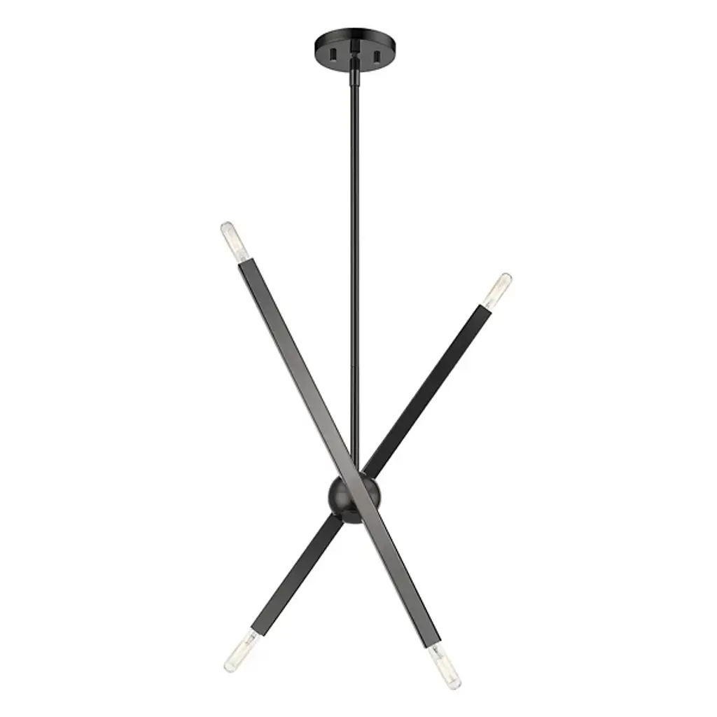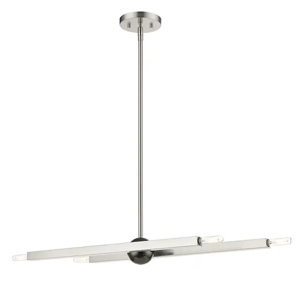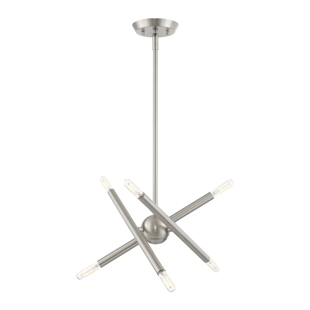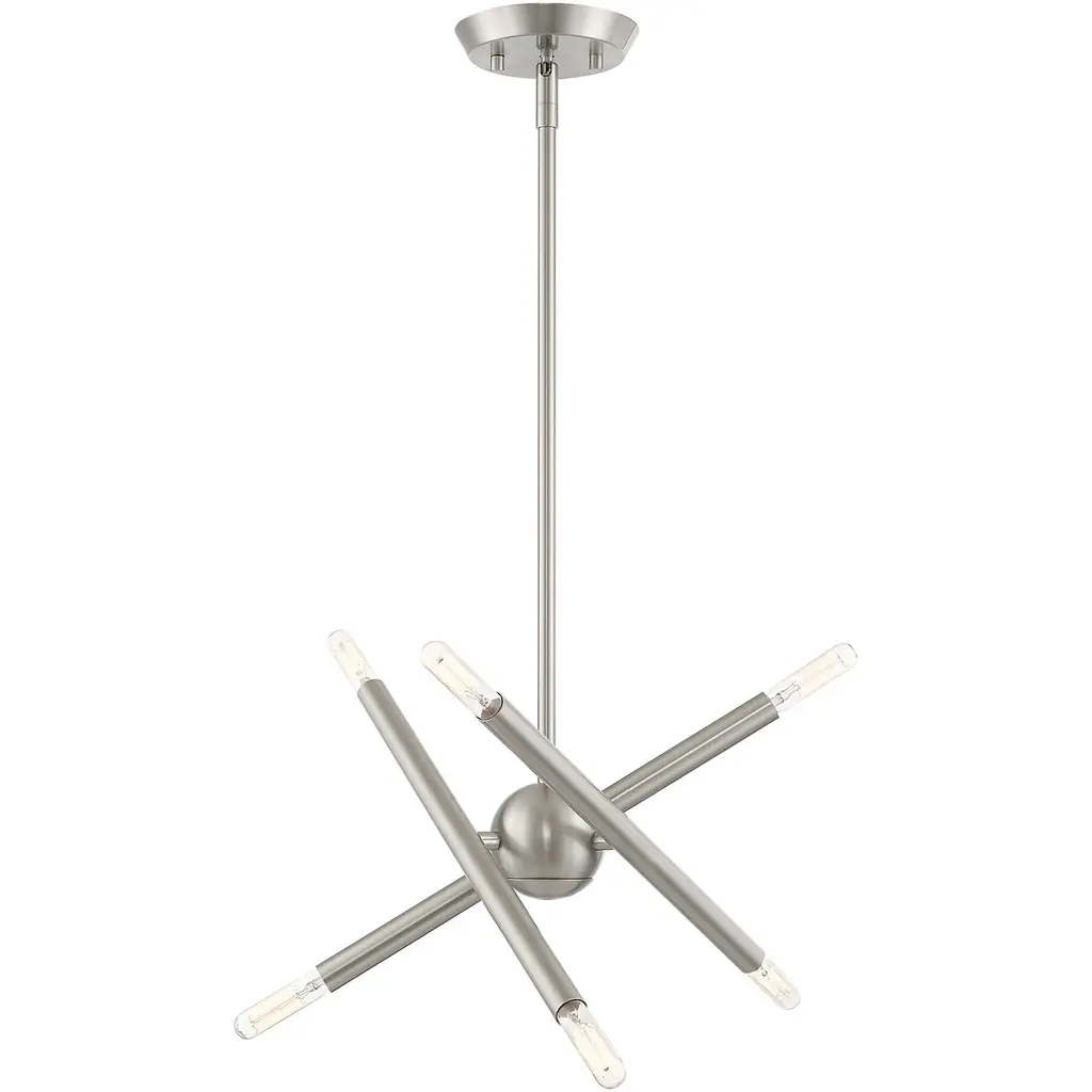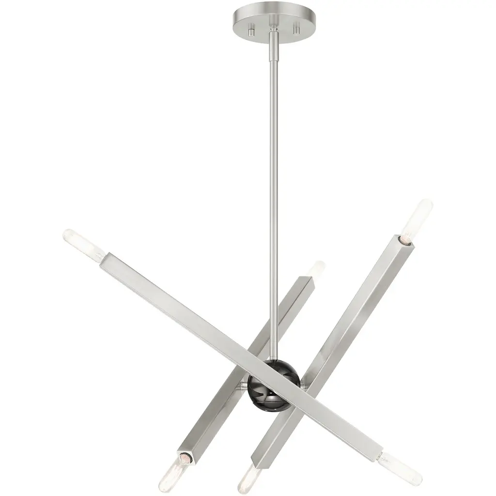 The eyes can’t stay still as they follow the graceful movement of the Grace Chandelier from Alder & Ore. Evoking the starburst, multi-directional design of the mid-century sputnik, this piece sets itself apart with a sculptural composition that appears to change at every glance. The chandelier’s globe body arouses one’s curiosity as it hides behind a dynamic array of lines. The linear arms appear erratic in movement yet come together to create a balanced, graceful silhouette. Each arm features dual, exposed bulbs for a truly multi-directional light. The topping candelabra bulbs create an inviting ambiance while producing an artful play of shadows.