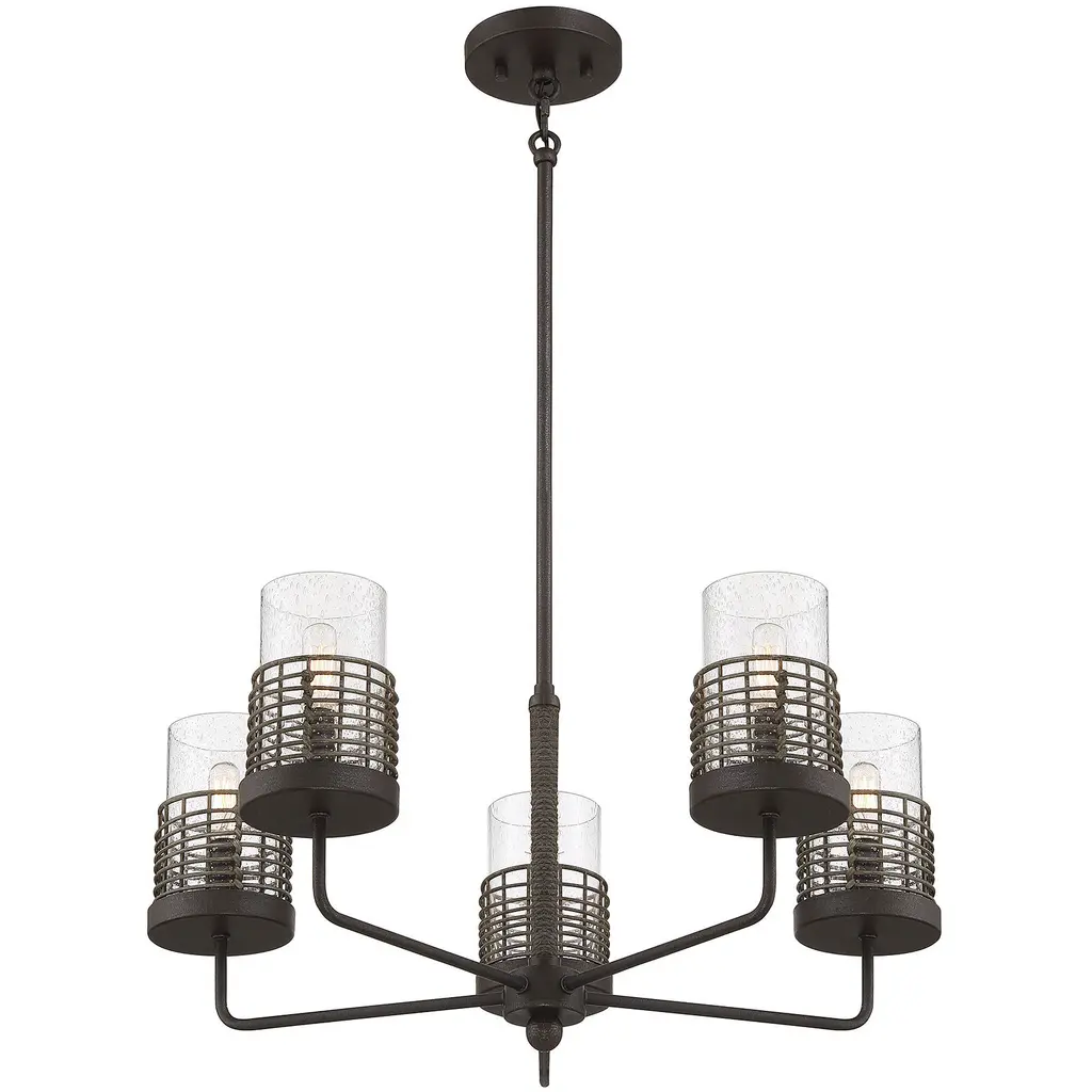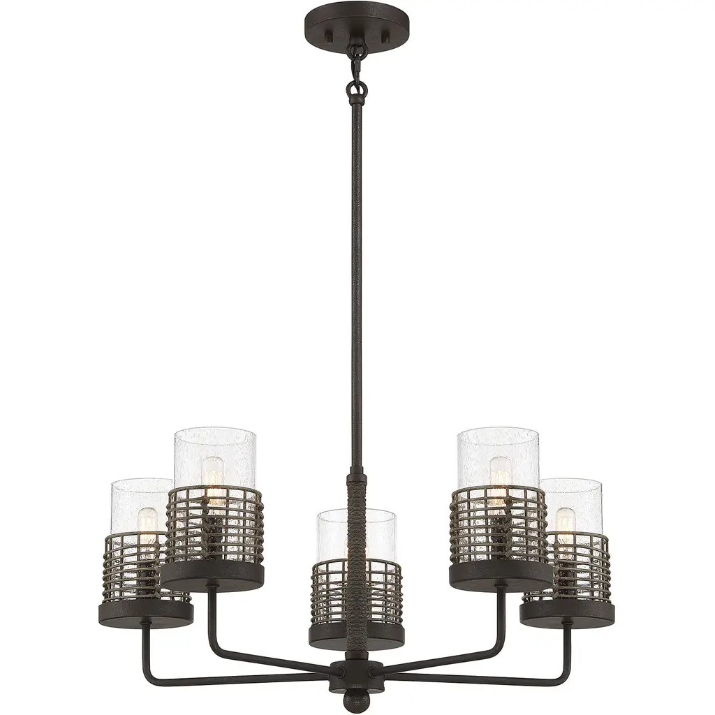 Pairing the industrial ruggedness of metal with the soft organic look of rattan, the Granada collection features a textured Gunsmoke with Gray Rattan finish, clear seeded glass shades and natural rope accents that add depth to the design. Measuring 25" wide x 10" high, this five-light chandelier provides ample illumination from five 60-watt candelabra bulbs. Adding to the versatility is the adjustable hanging height from 16" to 62".