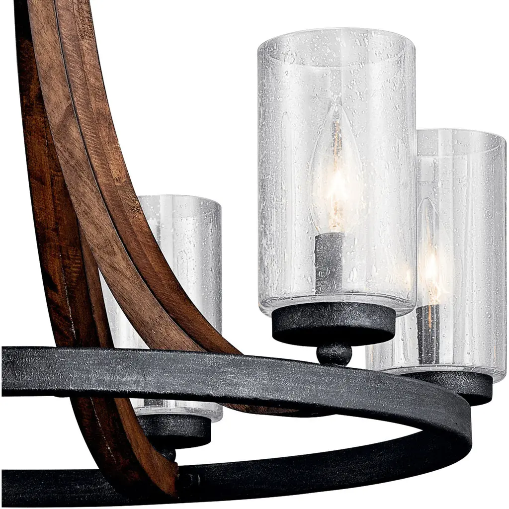 This distinctive 6 light chandelier from the Grand Bank(TM) collection creates a bold statement. The rich, Auburn Stained finish and Clear Seedy Glass will accent any space in your home.
