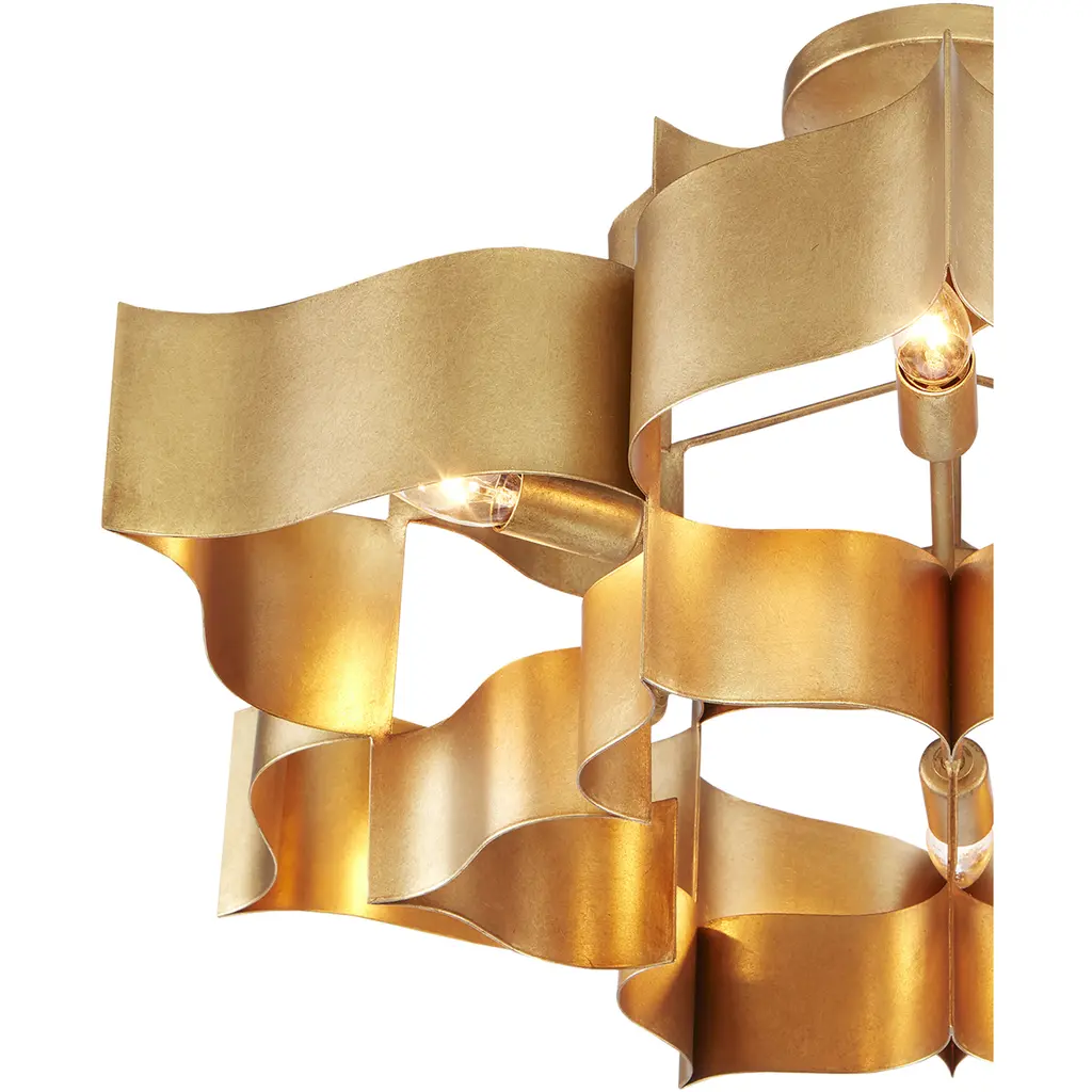 The gold version of the Grand Lotus Chandelier receives its majestic good looks from a combination of stunning workmanship and an antique gold leaf finish. Skillfully fashioned from wrought iron, the fixture is a gorgeous interpretation of the blossom upon which Asian deities are known to pose. The six-light chandelier measures 30 inches in diameter and is adjustable in height. We also offer this fixture, which is one of several fixtures in the Grand Lotus collection, in a contemporary silver leaf finish.