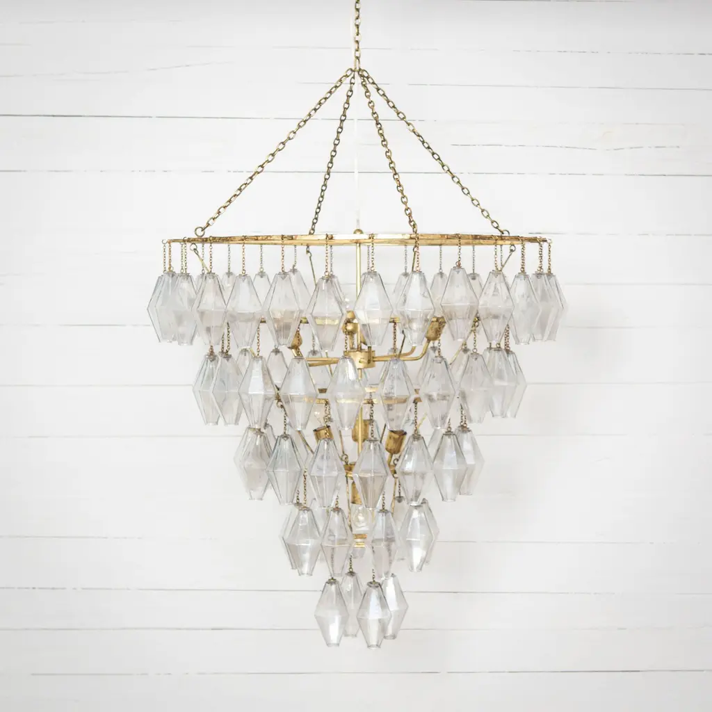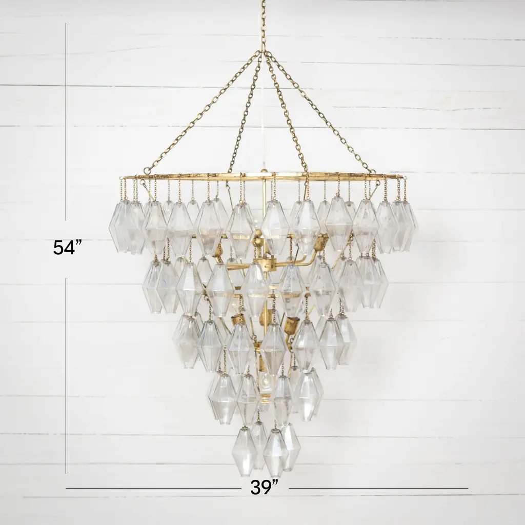 Rows of clear, cascading glass held together by polished iron make our Grand Waterfall Chandelier equal parts elegant & industrial. Each crystal is hand finished and faceted, making it a perfect eye-catching accent for grand entrances, kitchens and living rooms.