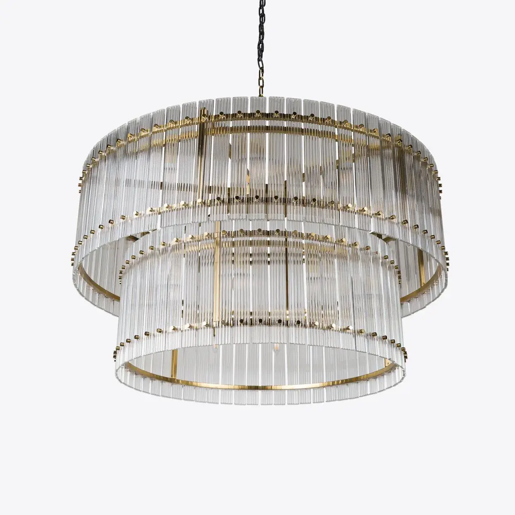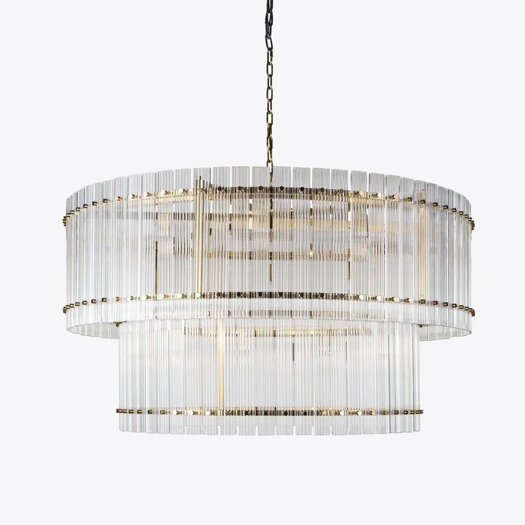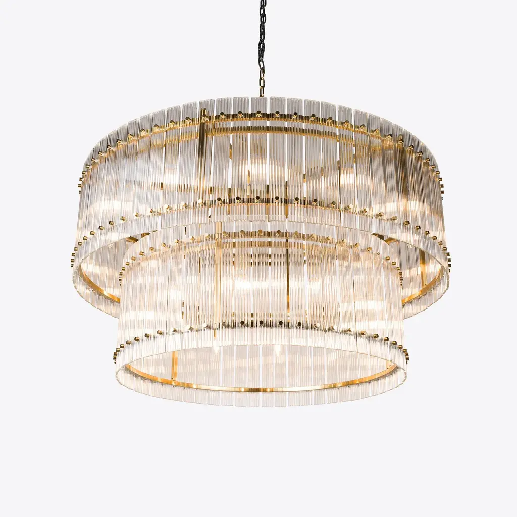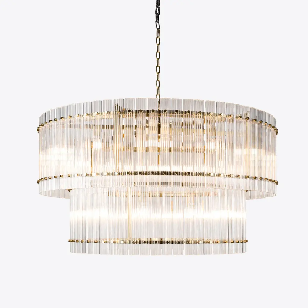 The perfect statement lighting piece, the Grande Double San Francisco features two tiers of ribbed glass panes in a drum formation, secured to a studded brass frame. This large-scale chandelier provides a warm luxurious glow and is ideal for a wide range of interior styles and rooms. UK Plug (up to 250V).