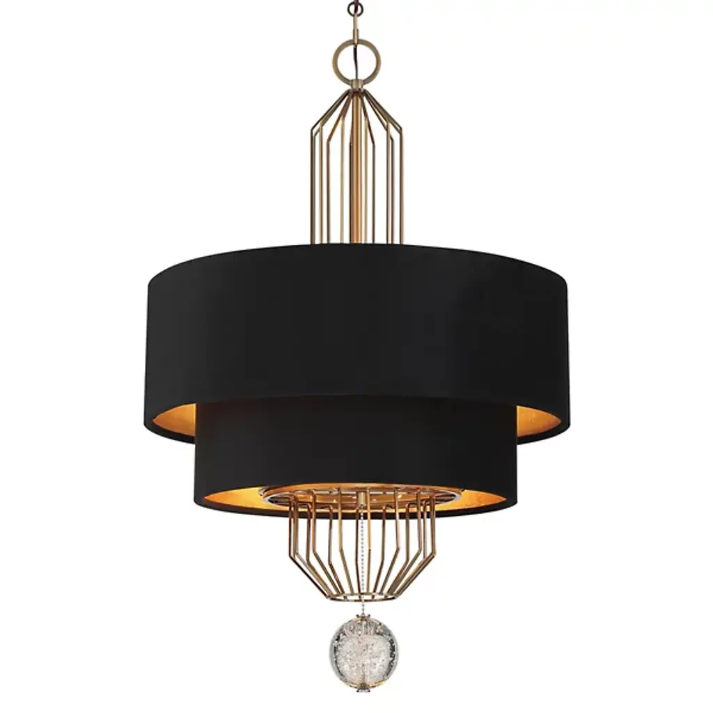 A grand cascade. The Grandeur 2-Tier Chandelier from Metropolitan Lighting raises one’s spirits with a balanced composition of distinct shapes. The clean, dressy look of the piece evokes Art Deco style. It descends overhead with a streaming wire structure. A crystal finial at the base creates wonder through its bubbly details. The tiers of velvet drum shades help produce a vertical glare-free glow.
