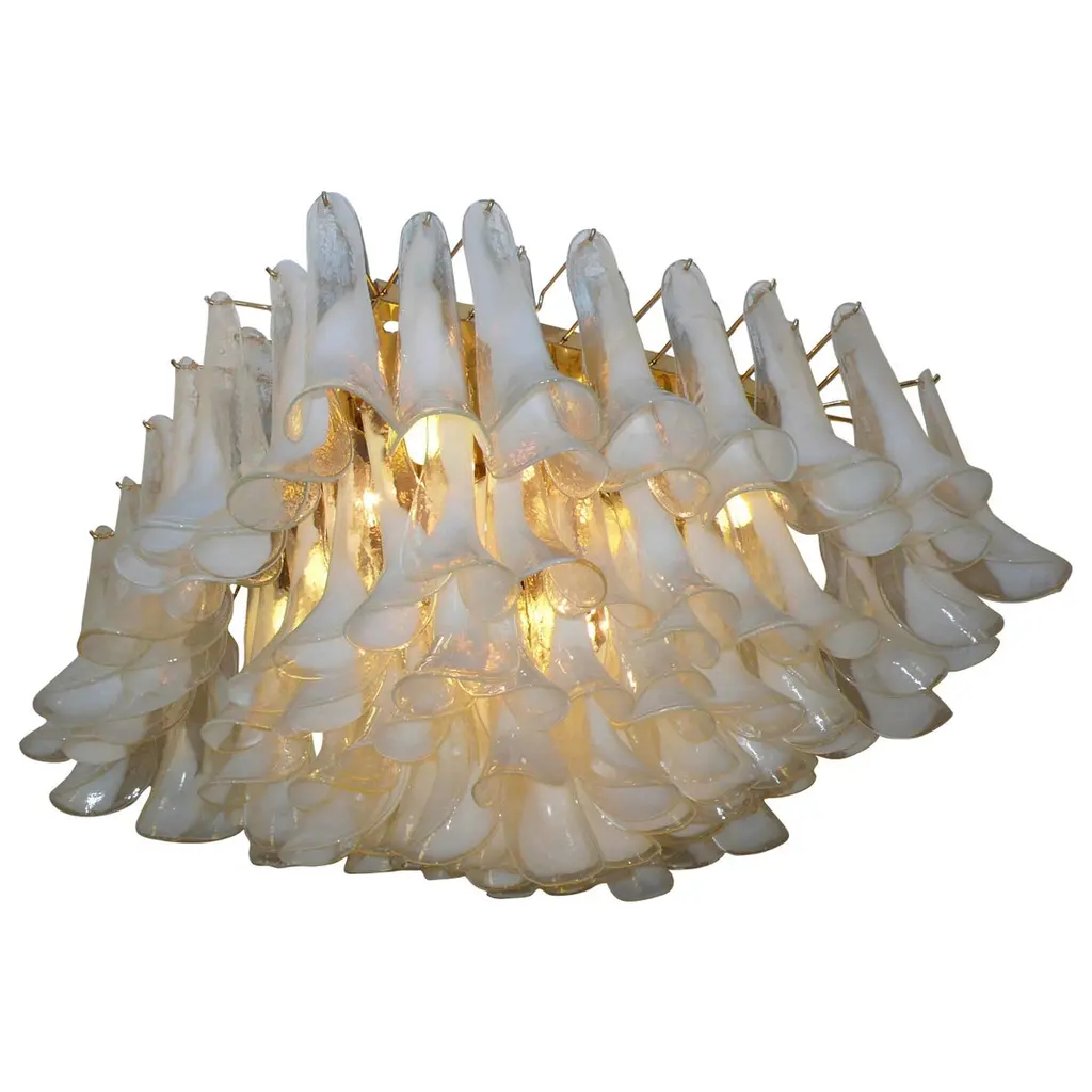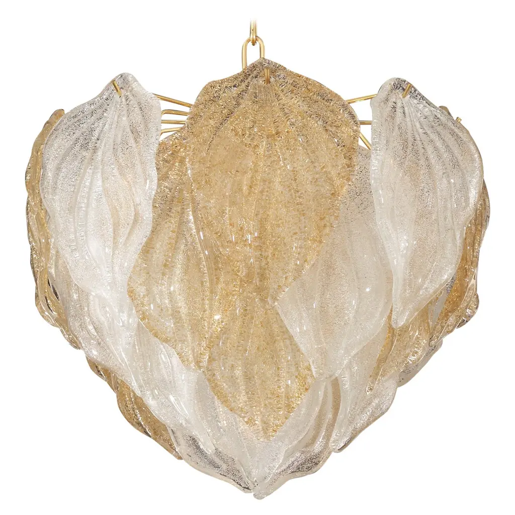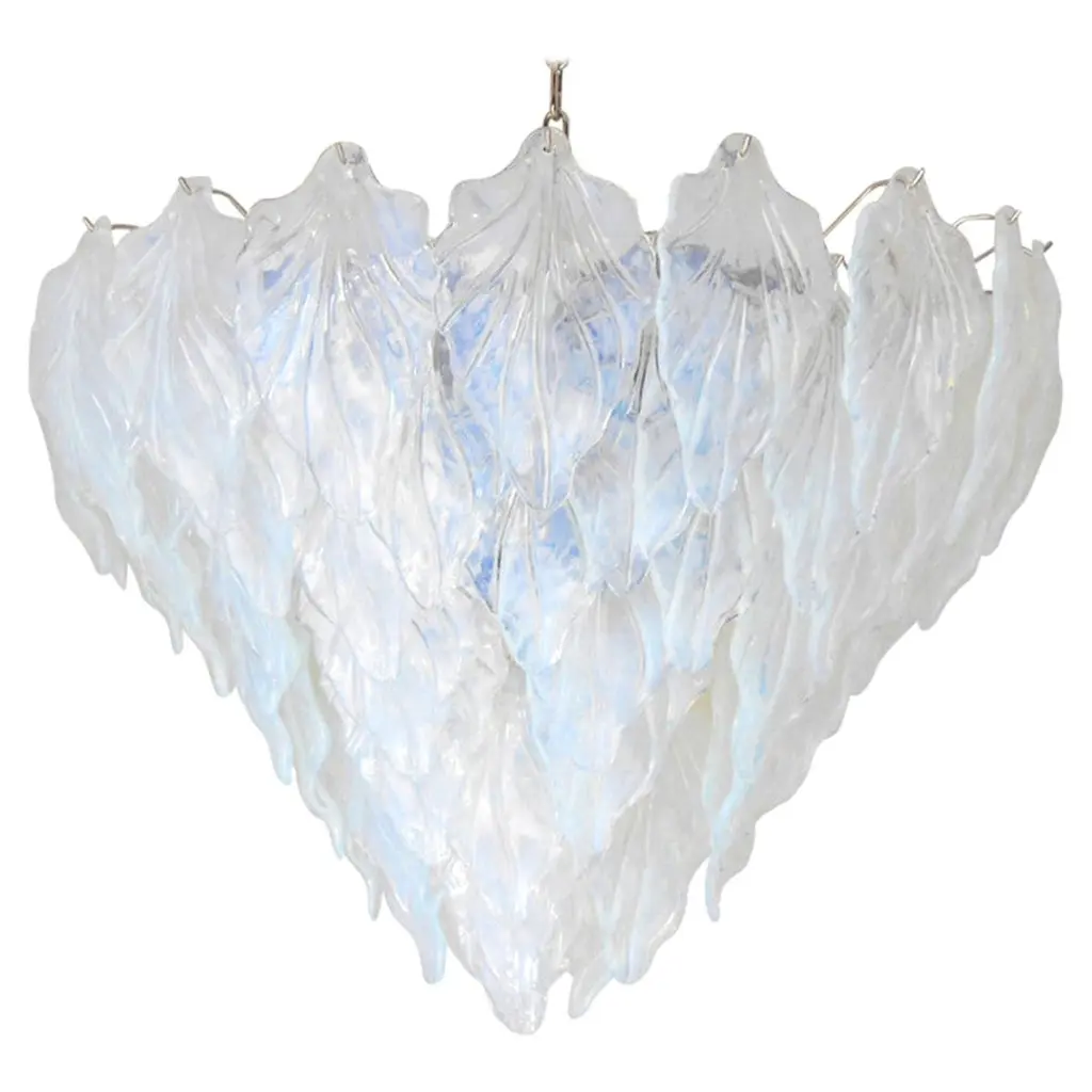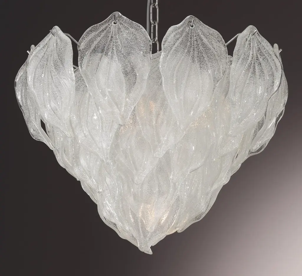 Italian chandelier shown with clear Murano glass leaves hand blown in Graniglia technique to produce granular textured effect, mounted on chrome finish frame / Designed by Fabio Bergomi for Fabio Ltd, inspired by Mazzega / Made in Italy5 lights / E26 or E27 type / max 60W eachMeasures: diameter 21.5 inches / height 18 inches plus chain and canopyOrder only / This item ships from Italy.