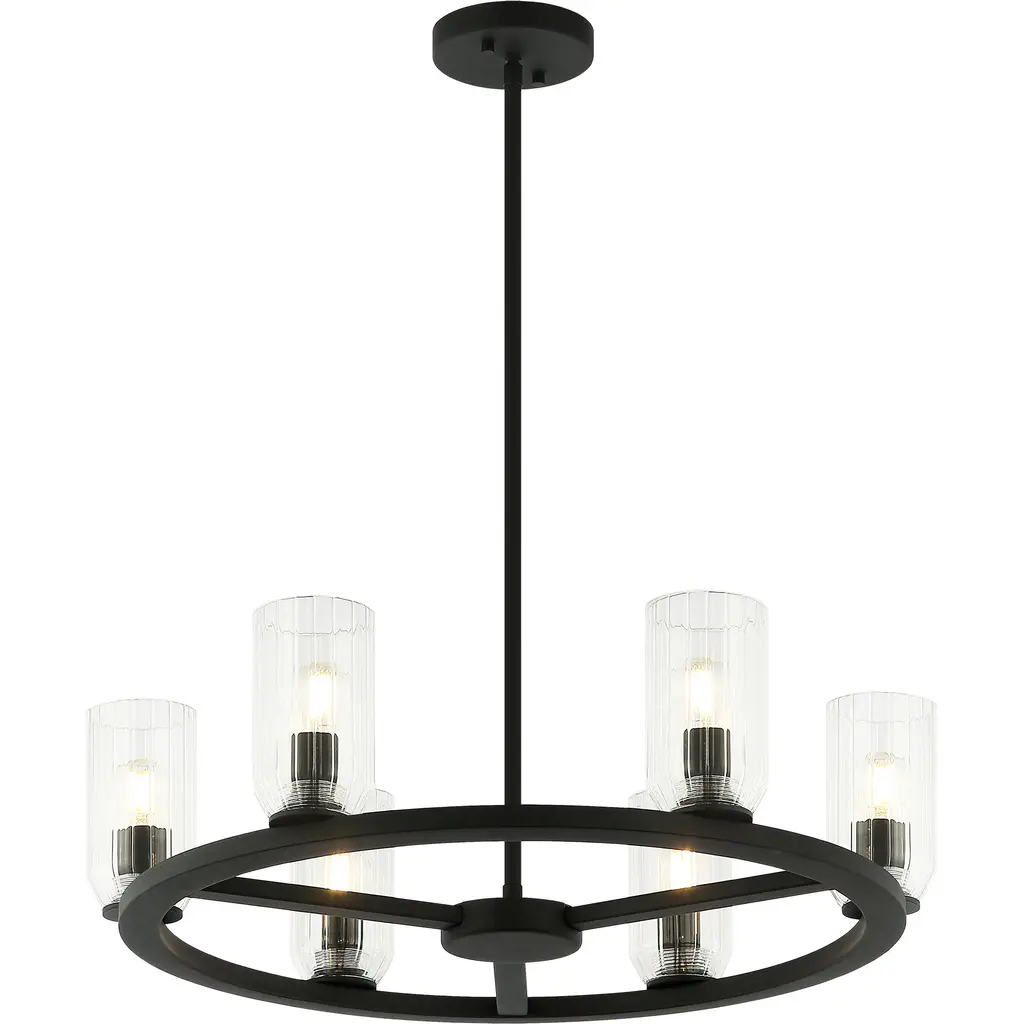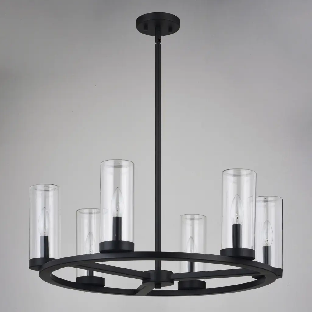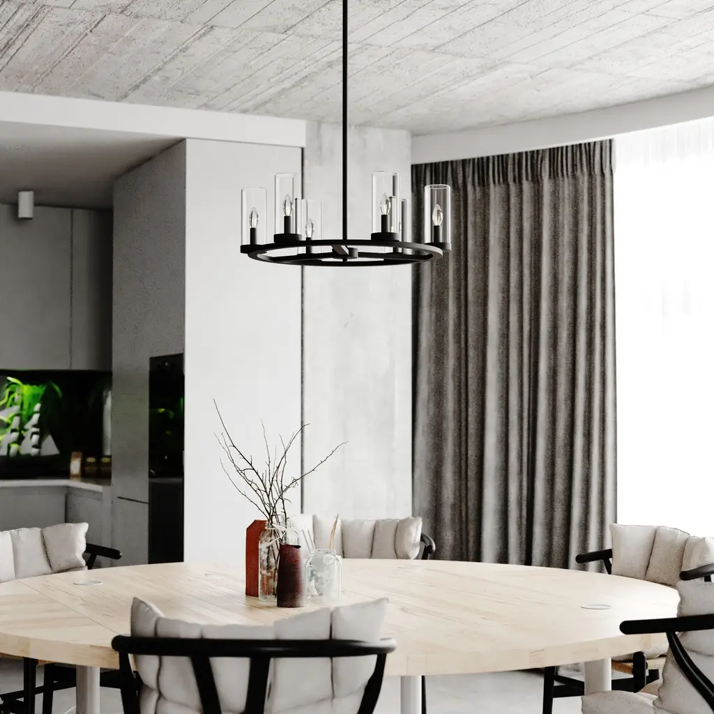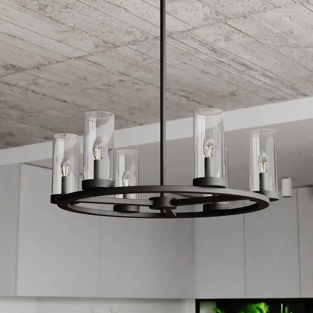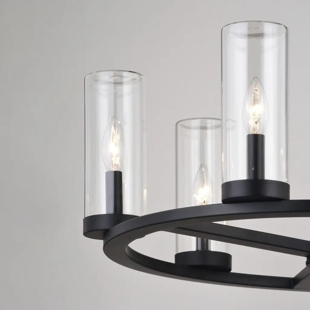 The Grantley collection is the perfect addition to your indoor or covered outdoor spaces. Long clear glass cylinders accentuate the clean, simple transitional styling of this collection. A ring with metal discs in a striking matte black finish supports the glass cylinders showcasing a generous display of light. Add this chandelier light to any dining, living or covered outdoor space where a little extra light is needed to add a stylish touch.