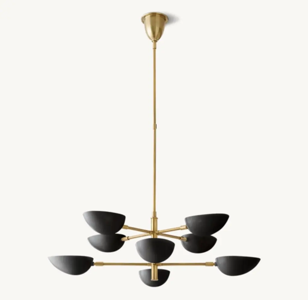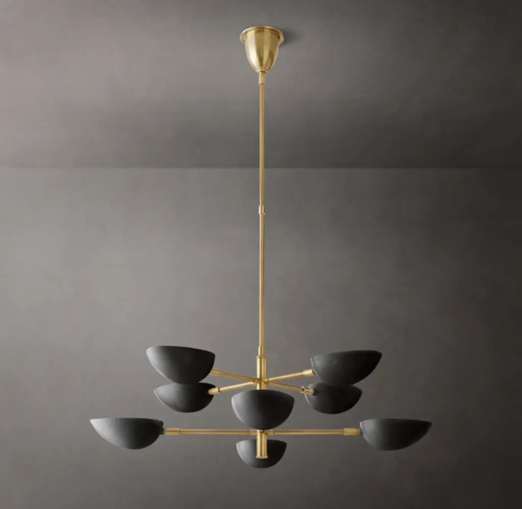 Designer Aerin Lauder of New York redefines modern grandeur with Graphic, featuring an array of eight cup shades that shine light upwards to create a beautiful reflection from the ceiling. Composed in concentric tiers, powdercoated steel arms in a hand-rubbed antique brass finish rotate from a central axis for a dramatic, sculptural effect.