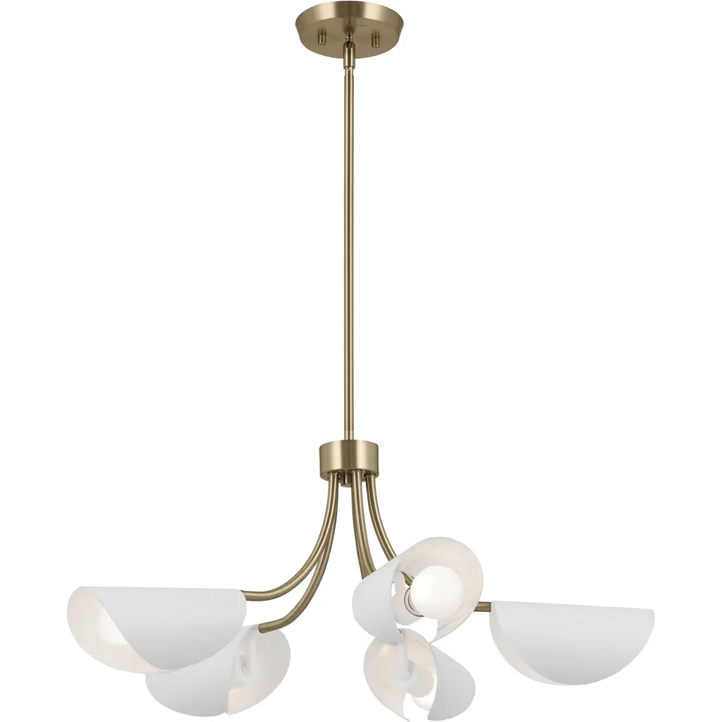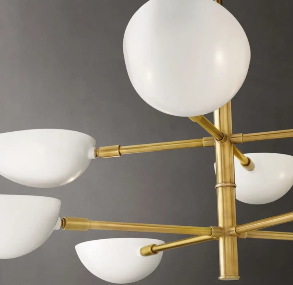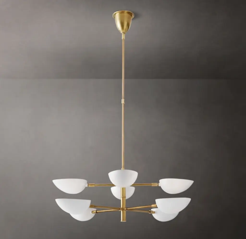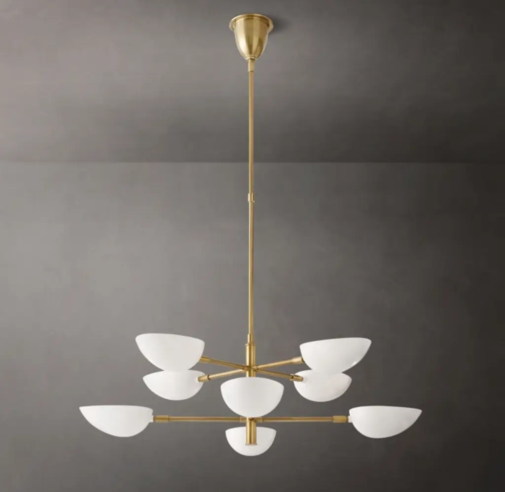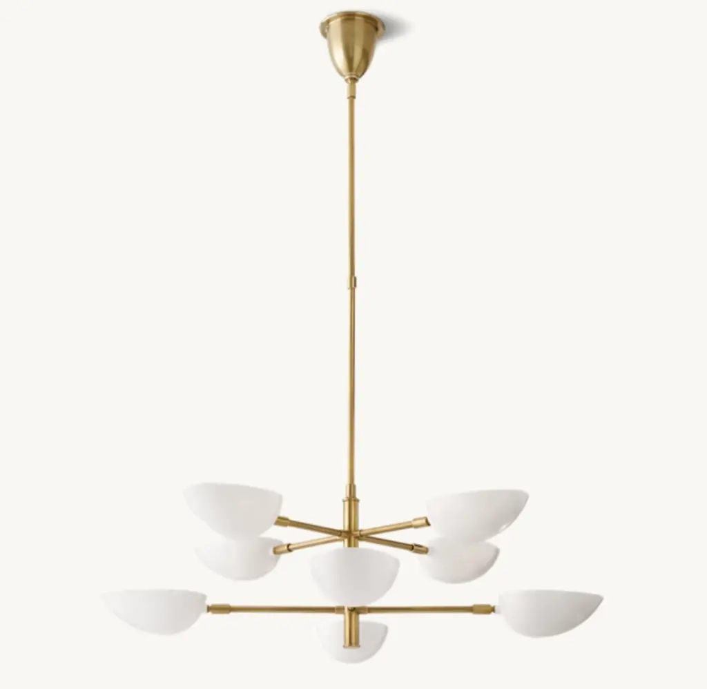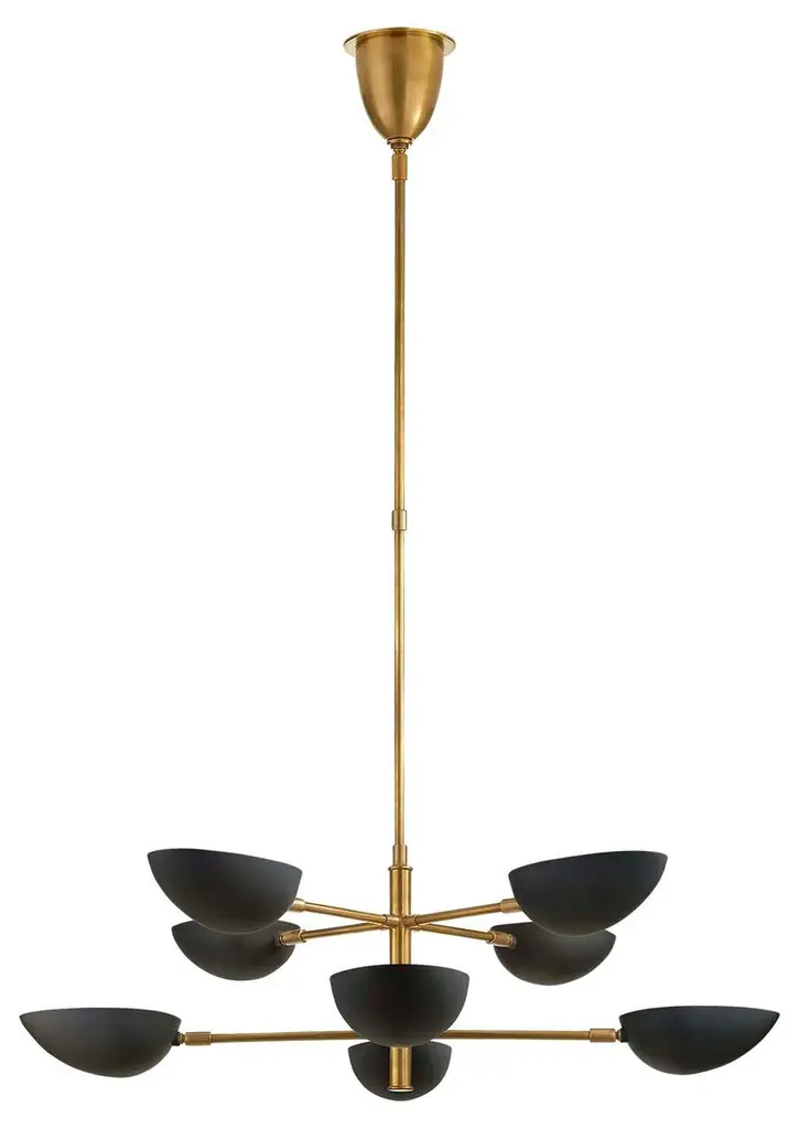 Designer Aerin Lauder of New York redefines modern grandeur with Graphic, featuring an array of eight cup shades that shine light upwards to create a beautiful reflection from the ceiling. Composed in concentric tiers, powdercoated steel arms in a hand-rubbed antique brass finish rotate from a central axis for a dramatic, sculptural effect.