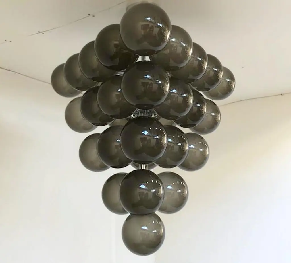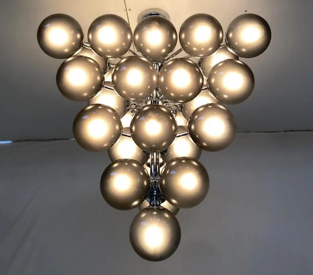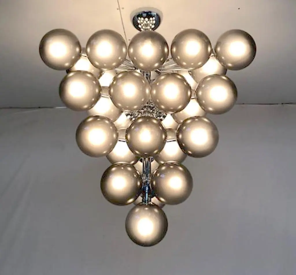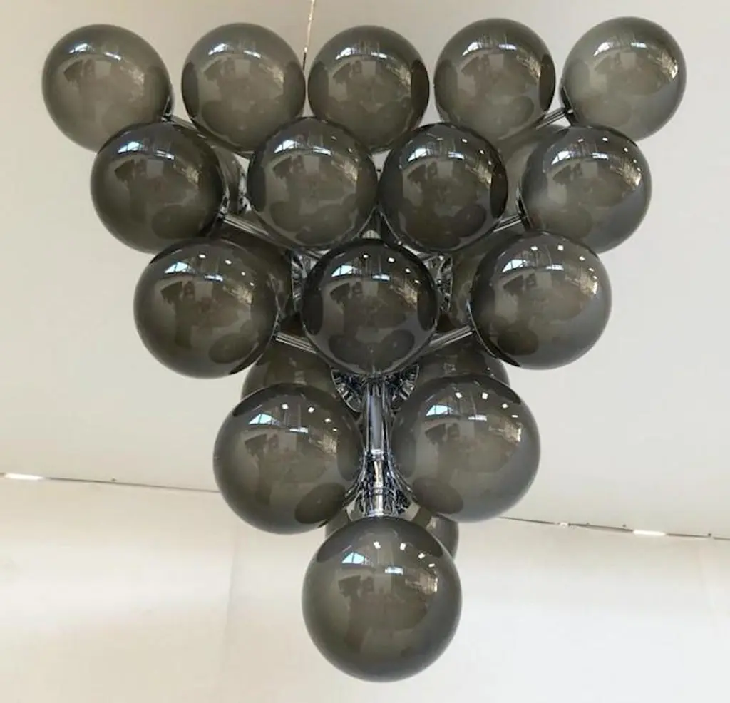 Italian chandelier with frosted smoky Murano glass globes mounted on polished chrome metal finish frame / designed by Fabio Bergomi for Fabio Ltd, made in Italy31-light / E12 or E14 type / max 40W eachMeasures: Diameter 31.5 inches, height 34 inches including rod and canopyOrder only / this item ships from Italy.