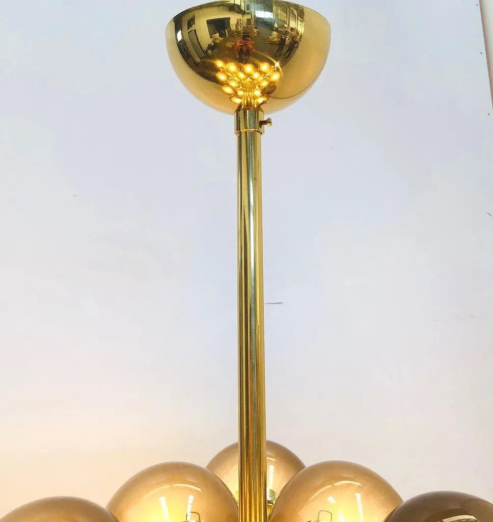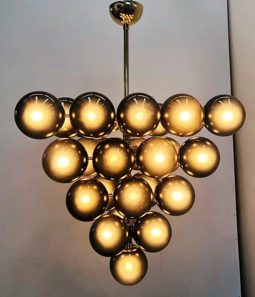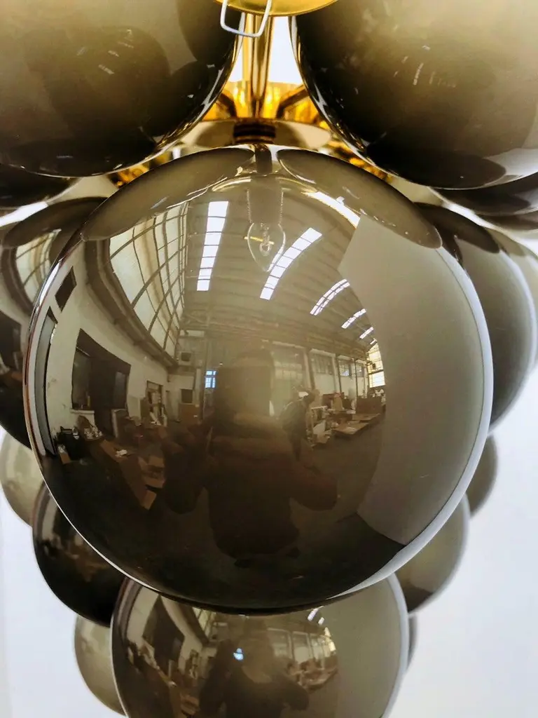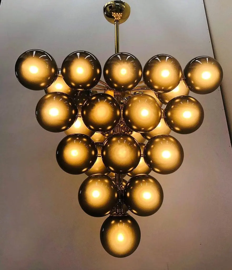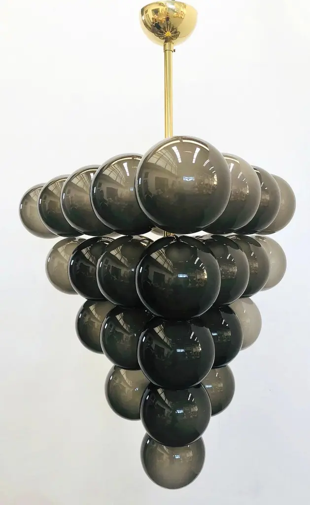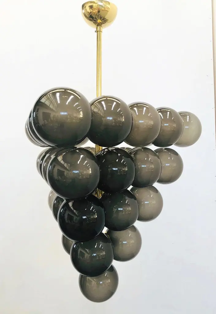 Italian chandelier with frosted smoky Murano glass globes mounted on polished brass frame / designed by Fabio Bergomi for Fabio Ltd, made in Italy31-light / E12 or E14 type / max 40W eachMeasures: Diameter 31.5 inches, height 31.5 inches not including rod and canopyOrder only / this item ships from ItalyOrder Reference: FABIOLTD C500
