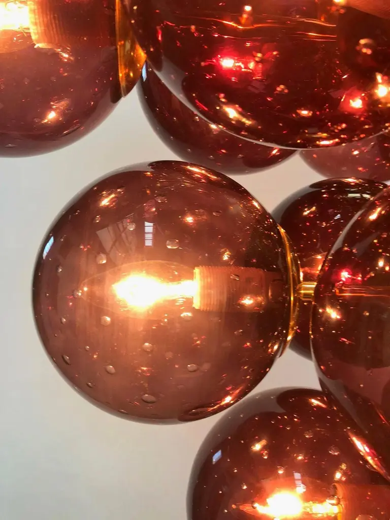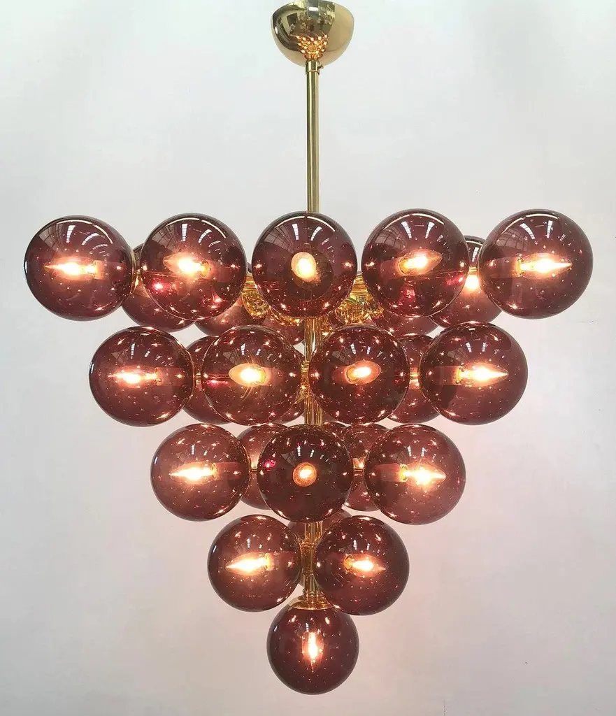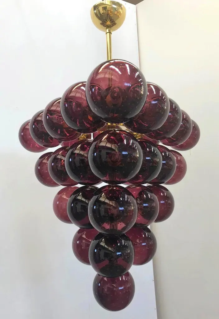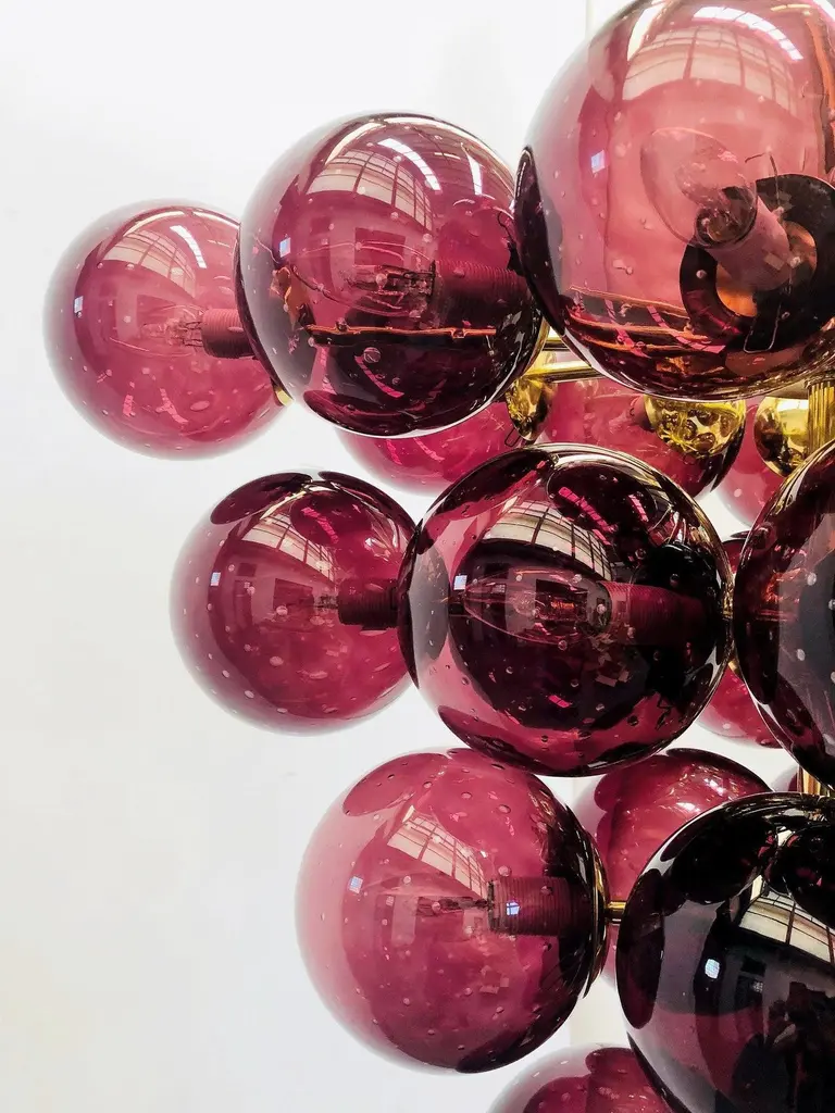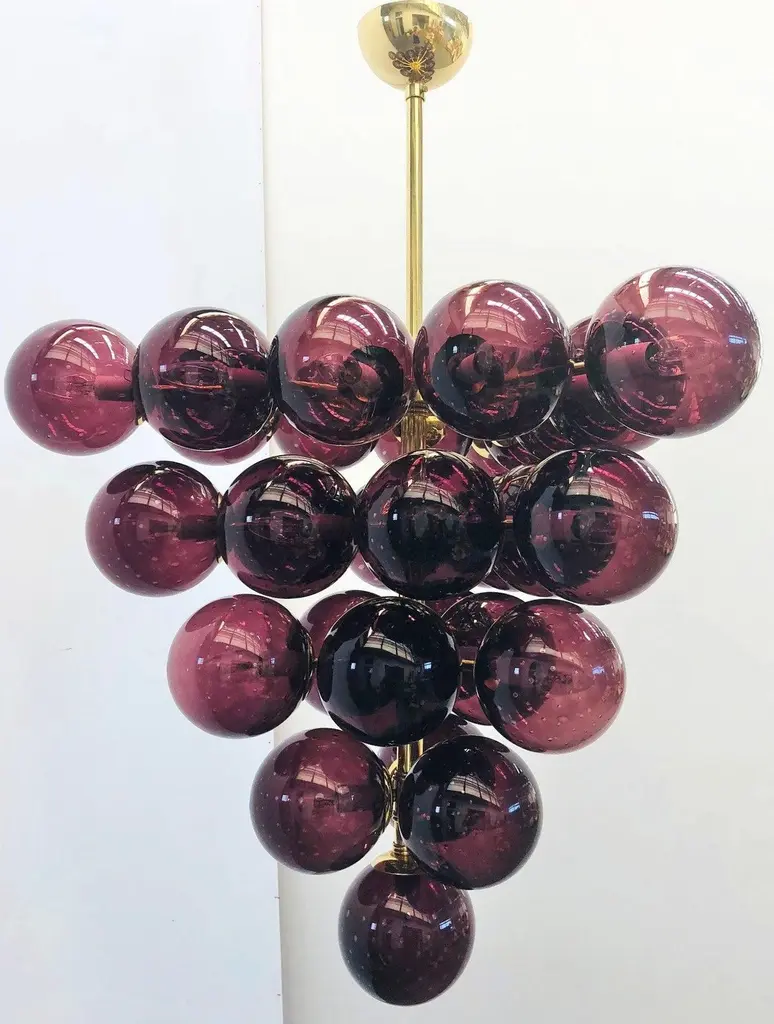 Italian chandelier with Amethyst Murano glass globes hand blown with bubbles inside the glass using Bollicine technique, mounted on polished brass frame / Designed by Fabio Bergomi for Fabio Ltd / Made in Italy31-light / E12 or E14 type / max 40W eachMeasures: Diameter 31.5 inches, height 31.5 inches not including rod and canopyOrder only / This item ships from ItalyOrder Reference: FABIOLTD C500