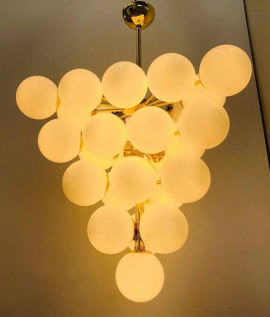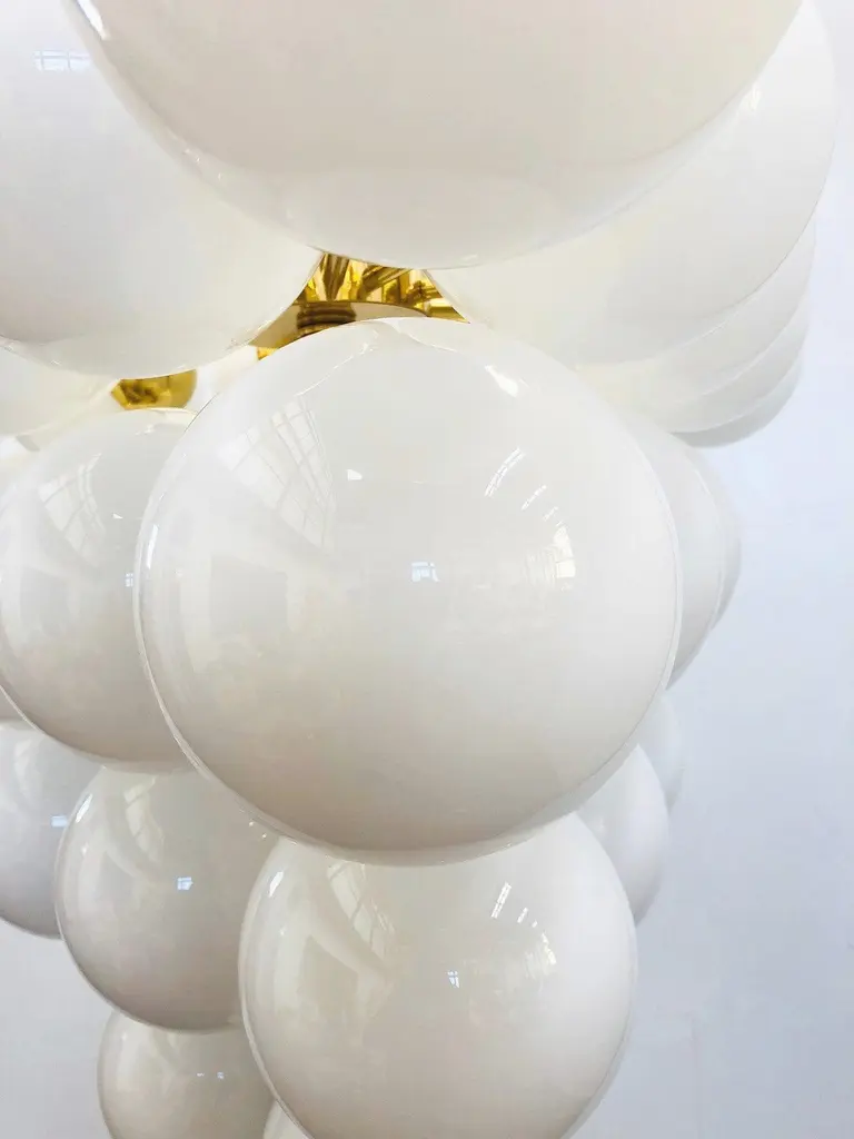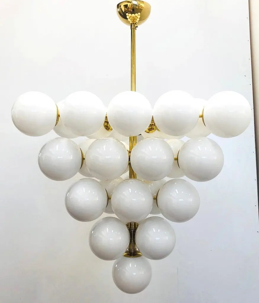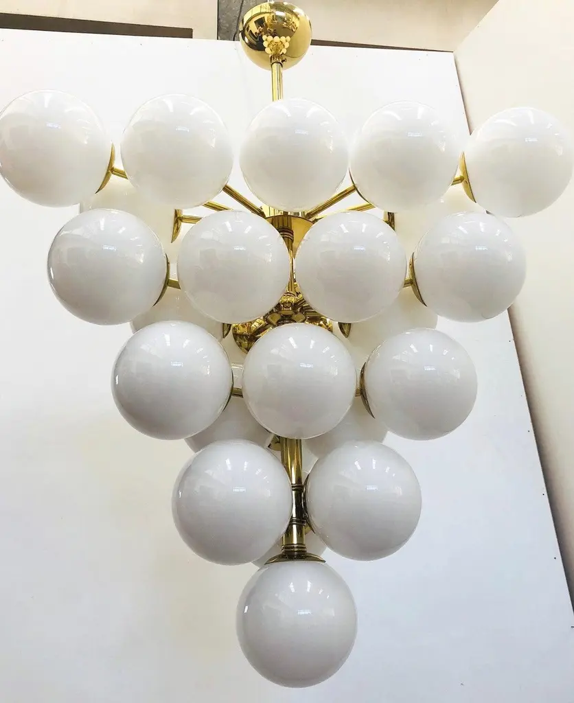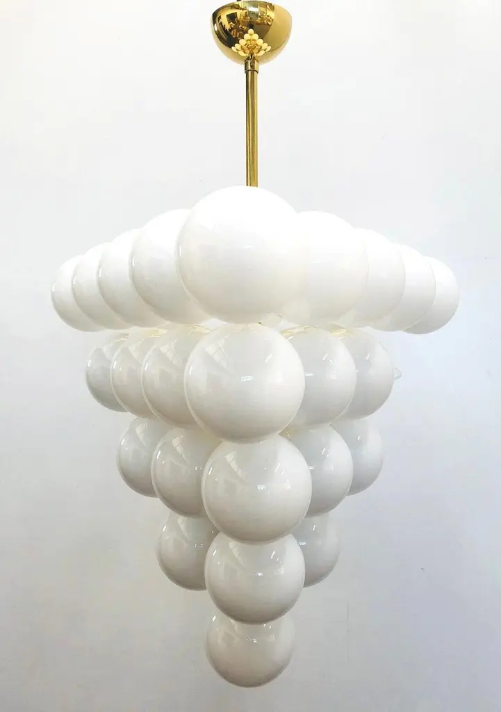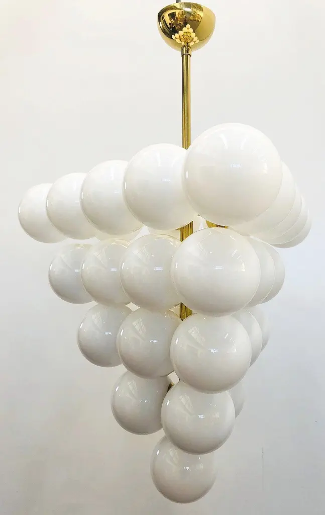 Italian chandelier with white Murano glass globes mounted on polished brass frame / Designed by Fabio Bergomi for Fabio Ltd / Made in Italy31 lights / E12 or E14 type / max 40W eachMeasures: Diameter 31.5 inches / Height 31.5 inches not including rod and canopy Order only / This item ships from ItalyOrder reference #: FABIOLTD C500 WHITE