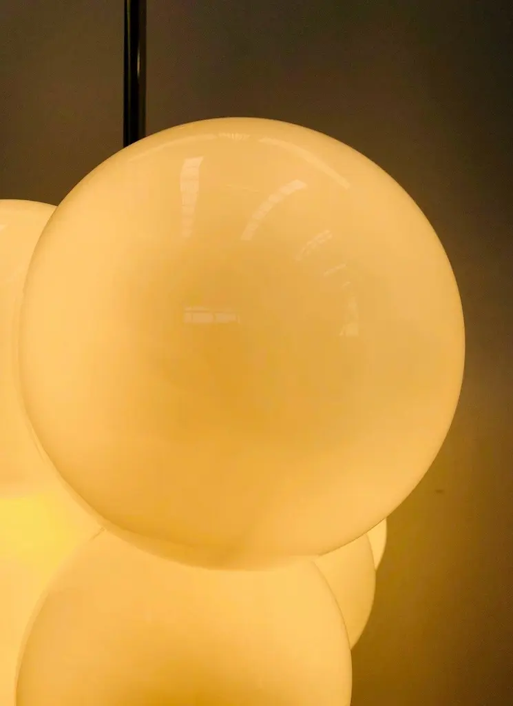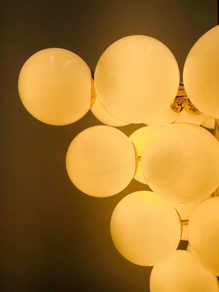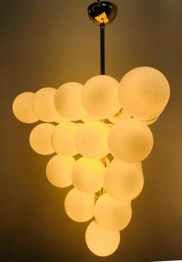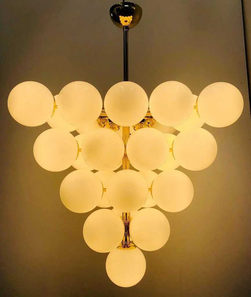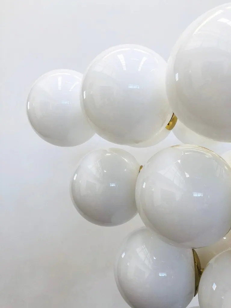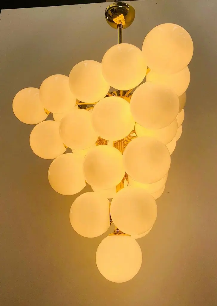 Italian chandelier with white Murano glass globes mounted on polished brass frame / Designed by Fabio Bergomi for Fabio Ltd / Made in Italy31 lights / E12 or E14 type / max 40W eachMeasures: Diameter 31.5 inches / Height 31.5 inches not including rod and canopy Order only / This item ships from ItalyOrder reference #: FABIOLTD C500 WHITE