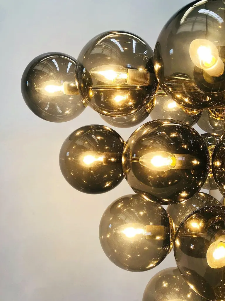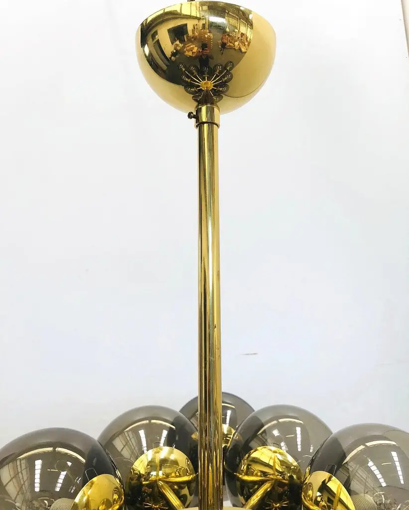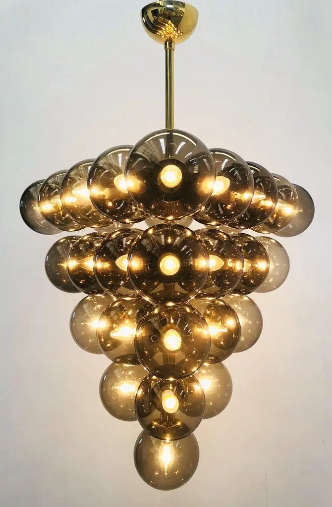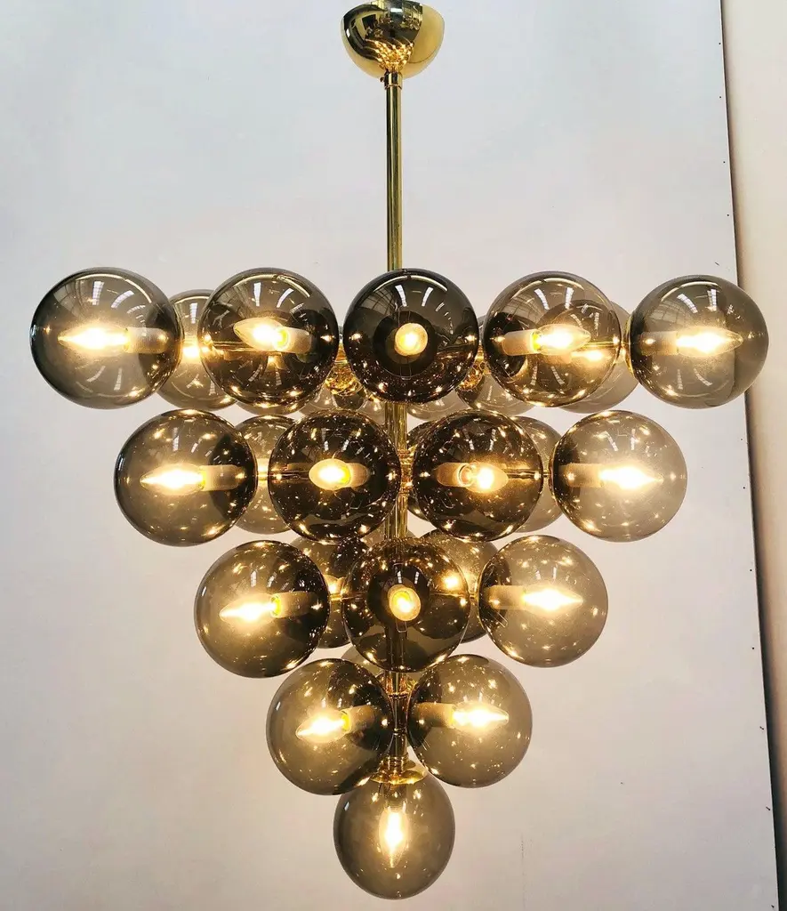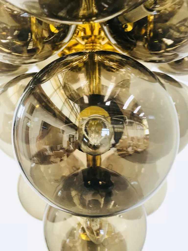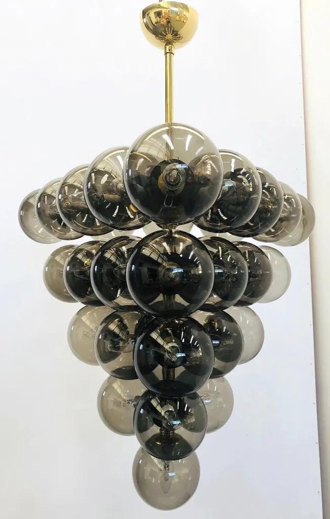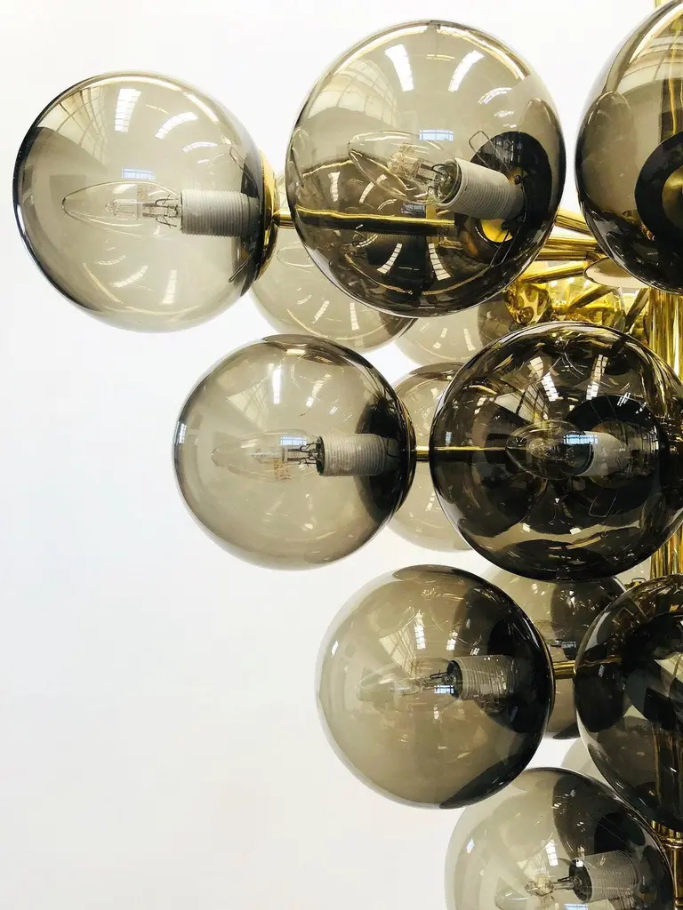 Italian chandelier with smoky Murano glass globes mounted on polished brass frame / Designed by Fabio Bergomi for Fabio Ltd / Made in Italy31 lights / E12 or E14 type / max 40W eachMeasures: Diameter 31.5 inches / Height 31.5 inches not including rod and canopy Order only / This item ships from ItalyOrder Reference: FABIOLTD C500 SMOKY